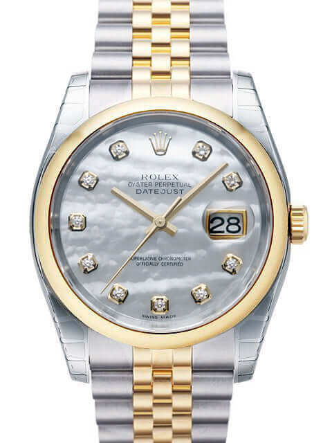 Gehäuse aus Edelstahl poliert und satiniert, Gehäusedurchmesser 36 mm, Gehäusehöhe 11,4 mm, glatte 18 kt Gelbgold Lünette poliert, Jubilé Edelstahl / 18 kt Gelbgold Armband poliert und satiniert mit Faltschließe, Perlmutt Zifferblatt mit 10 aufgesetzten Diamanten, goldene Zeiger, Automatikwerk, Chronometer, Rolex Manufakturkaliber 3135 mit 31 Steine, Schwingung 28.800 A/h, Datumsanzeige, kratzfestes Saphirglas, Krone aus 18 kt Gelbgold verschraubbar, verschraubter Edelstahlboden, Wasserdicht bis 10 bar.