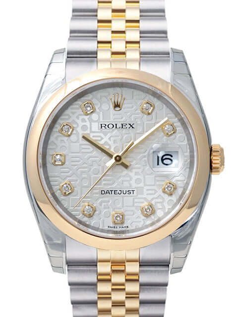 Gehäuse aus Edelstahl poliert und satiniert, Gehäusedurchmesser 36 mm, Gehäusehöhe 11,4 mm, glatte 18 kt Gelbgold Lünette poliert, Jubilé Edelstahl / 18 kt Gelbgold Armband poliert und satiniert mit Faltschließe, silberfarbenes Jubilé Zifferblatt mit 10 aufgesetzten Diamanten, goldene Zeiger, Automatikwerk, Chronometer, Rolex Manufakturkaliber 3135 mit 31 Steine, Schwingung 28.800 A/h, Datumsanzeige, kratzfestes Saphirglas, Krone aus 18 kt Gelbgold verschraubbar, verschraubter Edelstahlboden, Wasserdicht bis 10 bar.