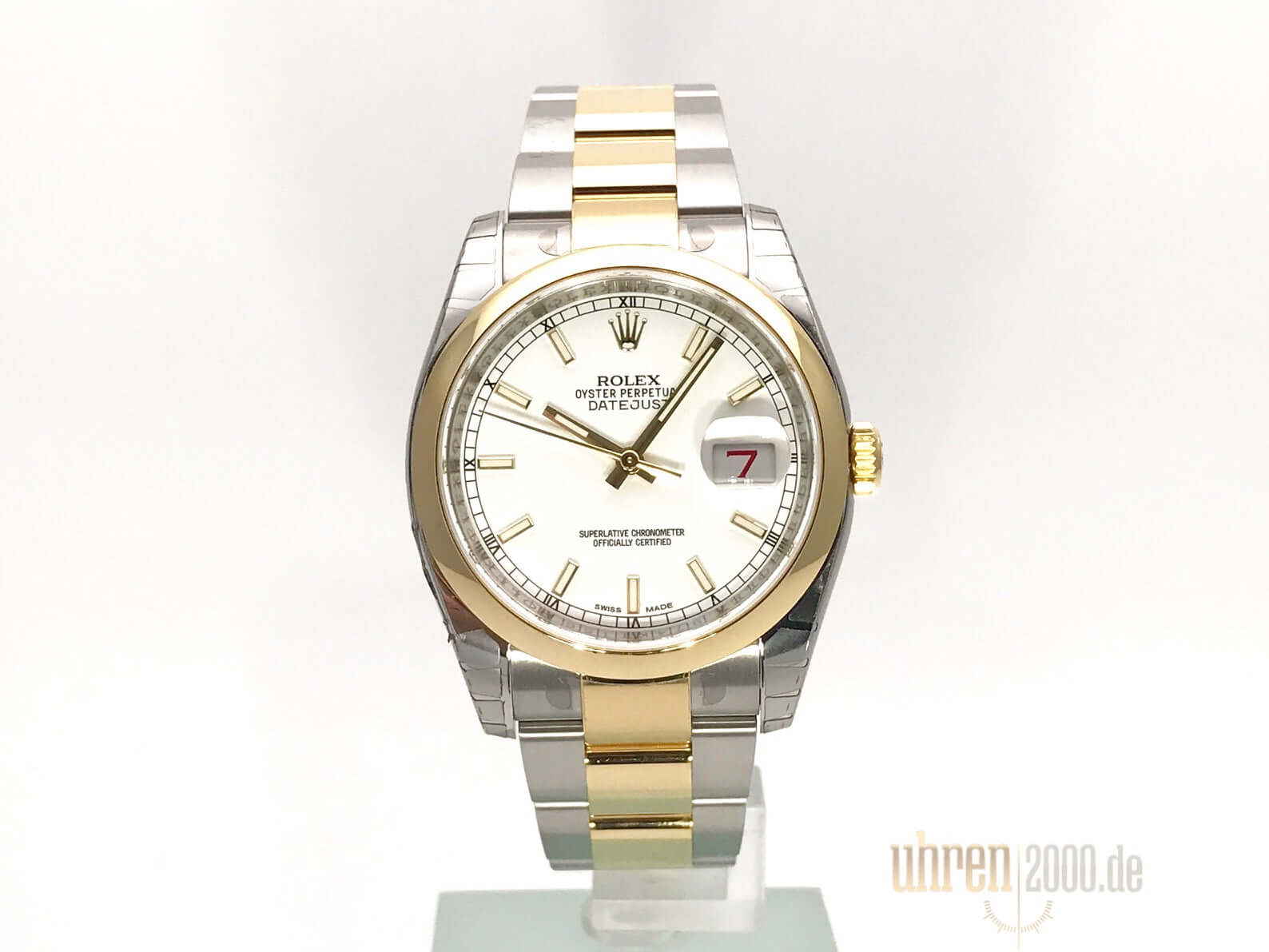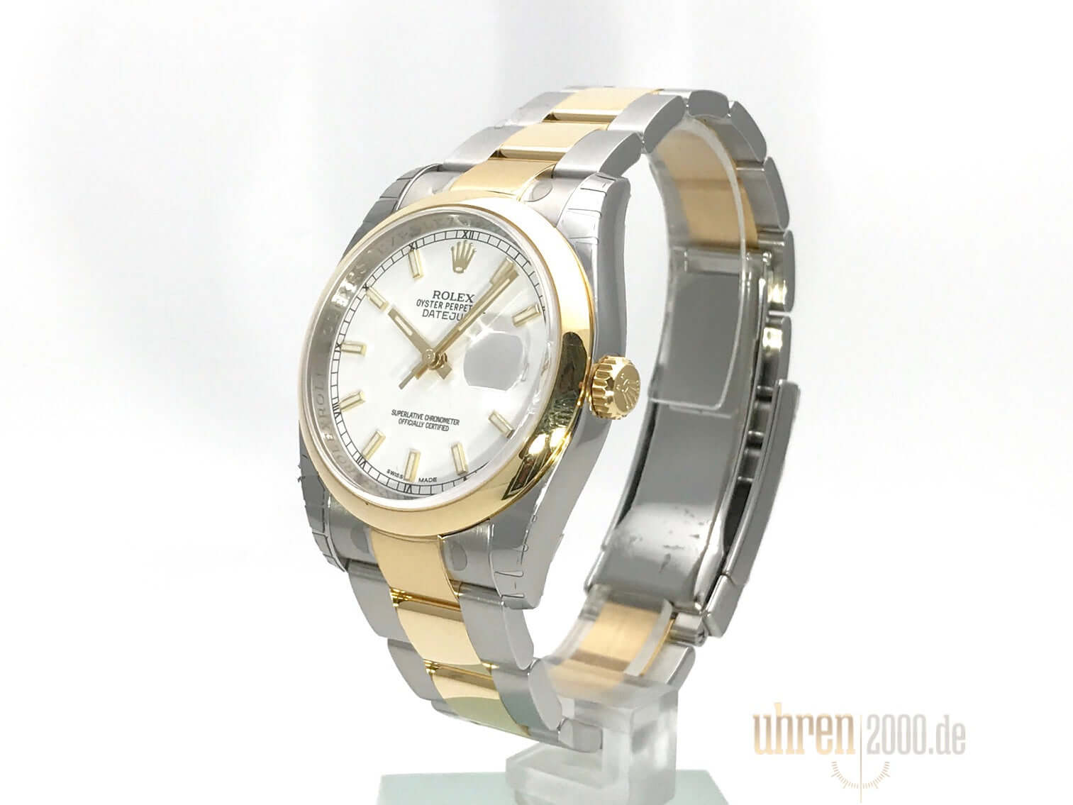 Gehäuse aus Edelstahl poliert und satiniert, Gehäusedurchmesser 36 mm, Gehäusehöhe 11,4 mm, glatte 18 kt Gelbgold Lünette poliert, Oyster Edelstahl/18 kt Gelbgold Armband poliert und satiniert mit Faltschließe, weißes Zifferblatt mit aufgesetzten goldenen Indexen, goldene Leuchtzeiger, Automatikwerk, Chronometer, Rolex Manufakturkaliber 3135 mit 31 Steine, Schwingung 28.800 A/h, Datumsanzeige, kratzfestes Saphirglas, Krone aus 18 kt Gelbgold verschraubbar, verschraubter Edelstahlboden, Wasserdicht bis 10 bar.