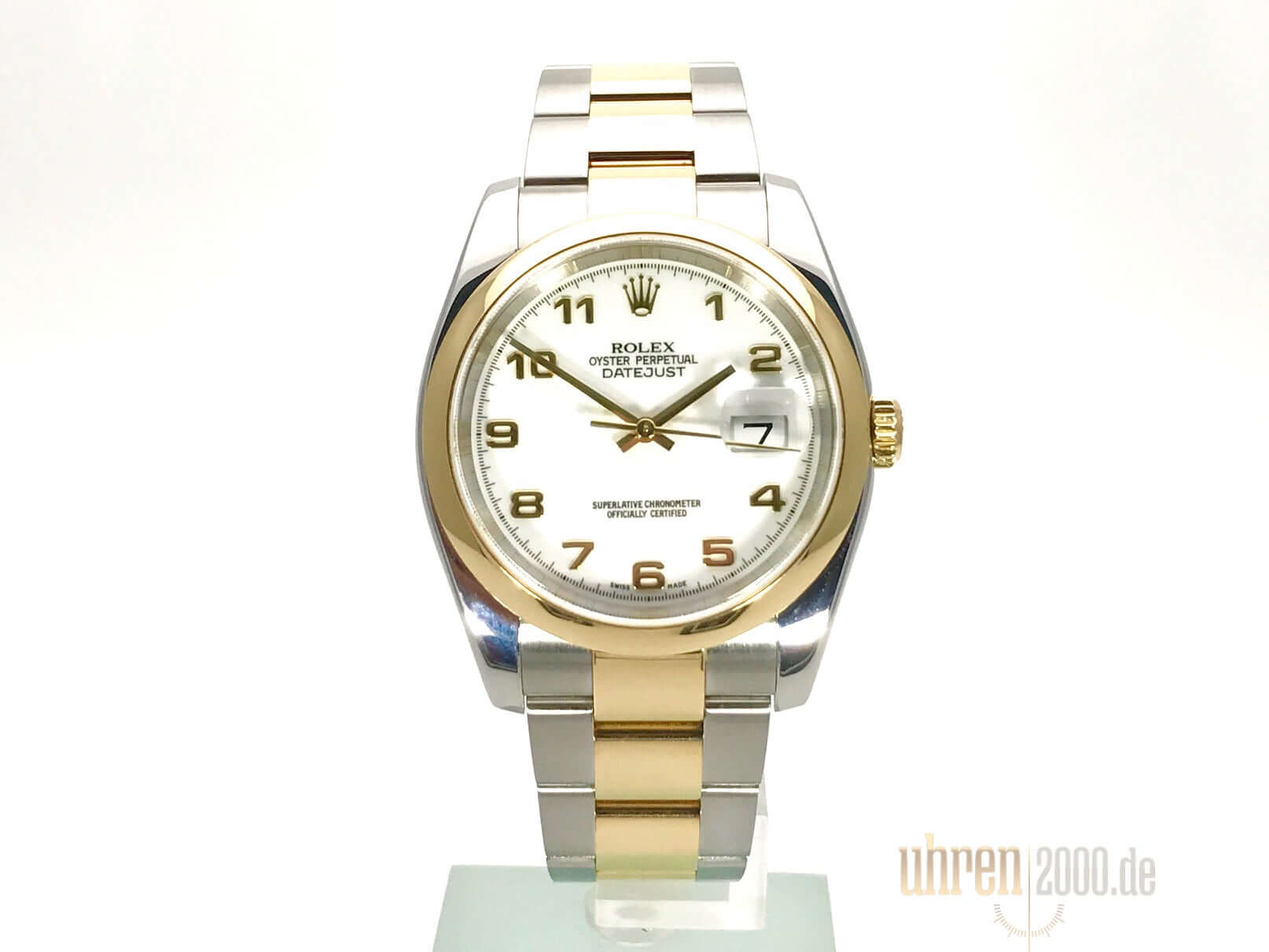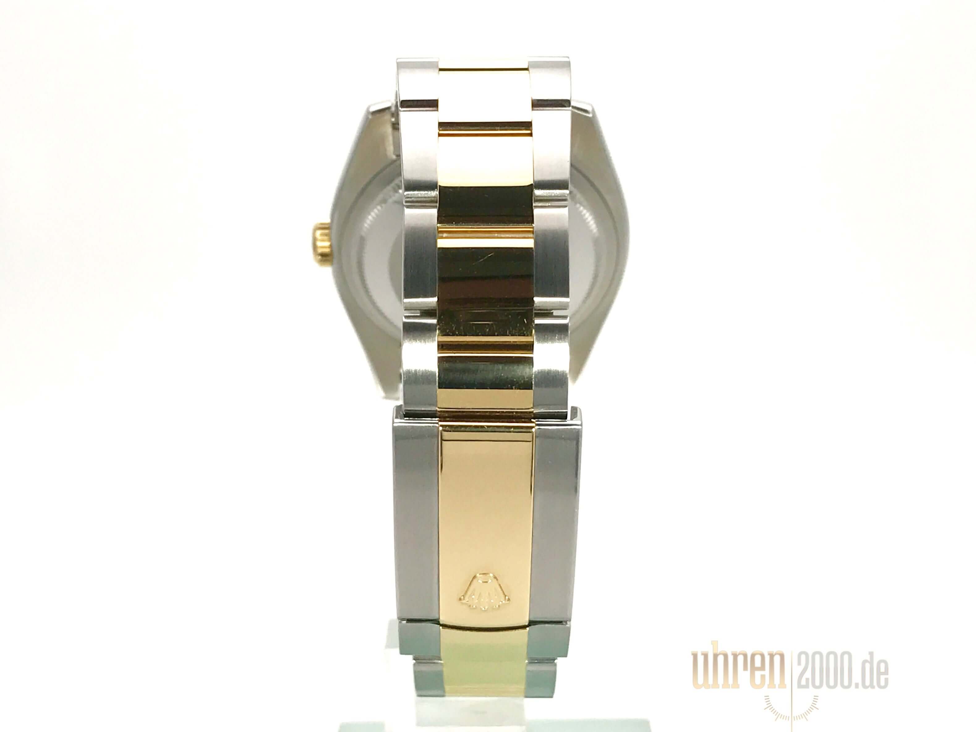 Gehäuse aus Edelstahl poliert und satiniert, Gehäusedurchmesser 36 mm, Gehäusehöhe 11,4 mm, glatte 18 kt Gelbgold Lünette poliert, Oyster Edelstahl/18 kt Gelbgold Armband poliert und satiniert mit Faltschließe, weißes Zifferblatt mit aufgesetzten goldenen arabischen Ziffern, Automatikwerk, Chronometer, Rolex Manufakturkaliber 3135 mit 31 Steine, Schwingung 28.800 A/h, Datumsanzeige, kratzfestes Saphirglas, Krone aus 18 kt Gelbgold verschraubbar, verschraubter Edelstahlboden, Wasserdicht bis 10 bar.