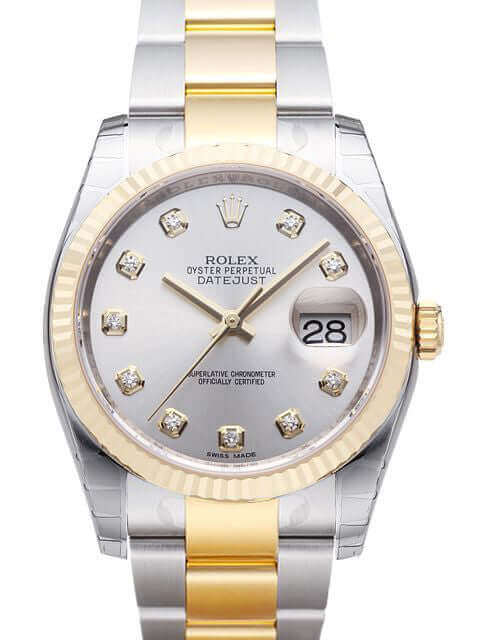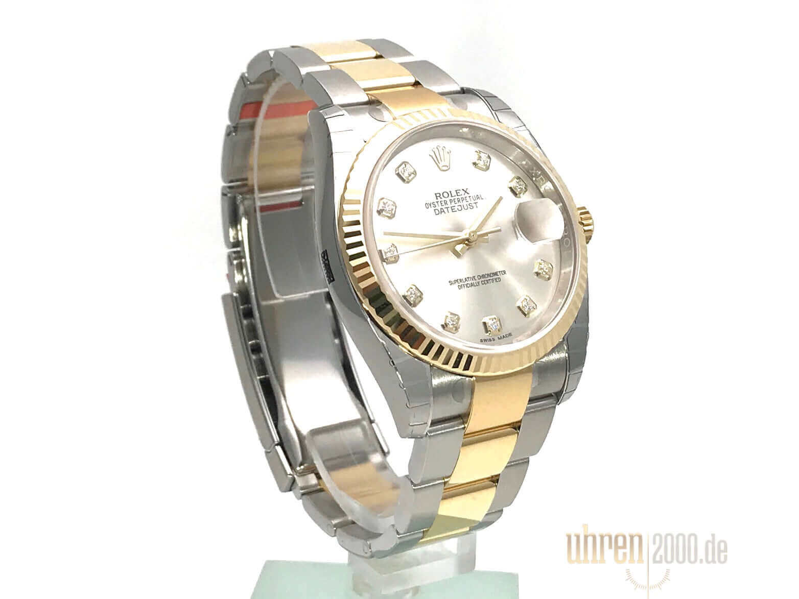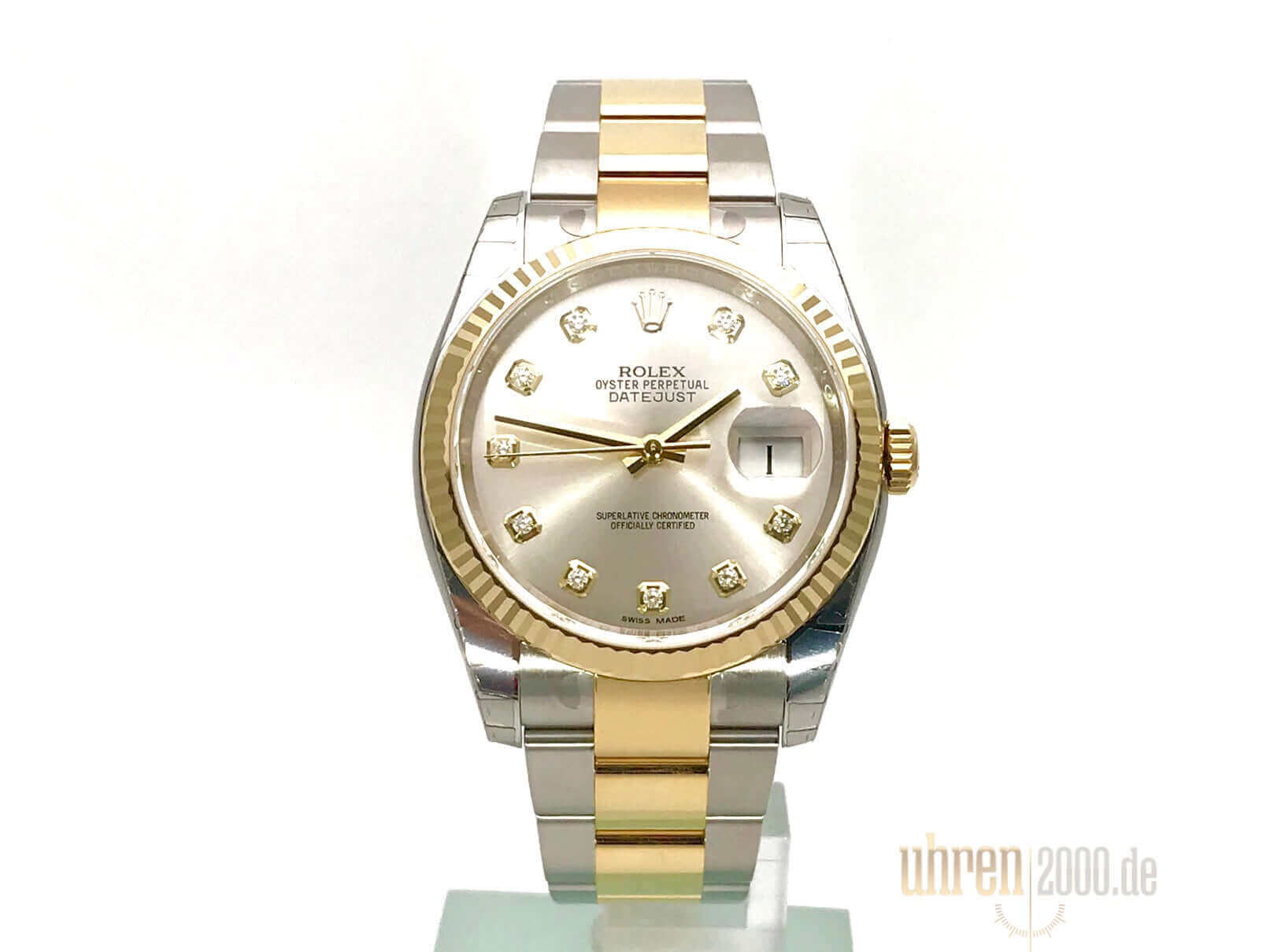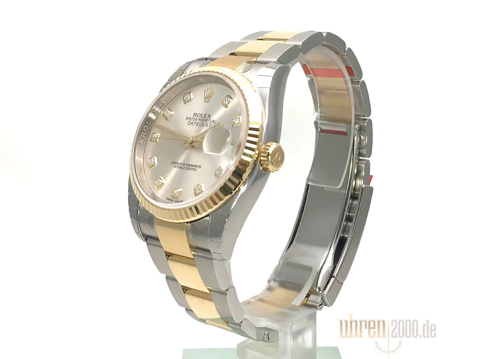 Gehäuse aus Edelstahl poliert und satiniert, Gehäusedurchmesser 36 mm, Gehäusehöhe 11,4 mm, Lünette aus 18 kt Gelbgold geriffelt, Oyster Edelstahl / 18 kt Gelbgold Armband poliert und satiniert mit Faltschließe, silberfarbenes Zifferblatt mit 10 aufgesetzten Diamanten, goldene Zeiger, Automatikwerk, Chronometer, Rolex Manufakturkaliber 3135 mit 31 Steine, Schwingung 28.800 A/h, Datumsanzeige, kratzfestes Saphirglas, Krone aus 18 kt Gelbgold verschraubbar, verschraubter Edelstahboden, Wasserdicht bis 10 bar.
