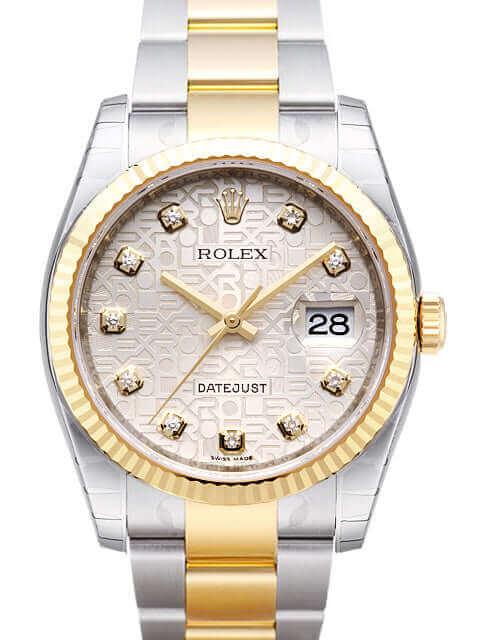 Gehäuse aus Edelstahl poliert und satiniert, Gehäusedurchmesser 36 mm, Gehäusehöhe 11,4 mm, Lünette aus 18 kt Gelbgold geriffelt, Oyster Edelstahl / 18 kt Gelbgold Armband poliert und satiniert mit Faltschließe, Silberfarbenes Jubile Zifferblatt mit 10 aufgesetzten Diamanten, goldene Zeiger, Automatikwerk, Chronometer, Rolex Manufakturkaliber 3135 mit 31 Steine, Schwingung 28.800 A/h, Datumsanzeige, kratzfestes Saphirglas, Krone aus 18 kt Gelbgold verschraubbar, verschraubter Edelstahboden, Wasserdicht bis 10 bar.