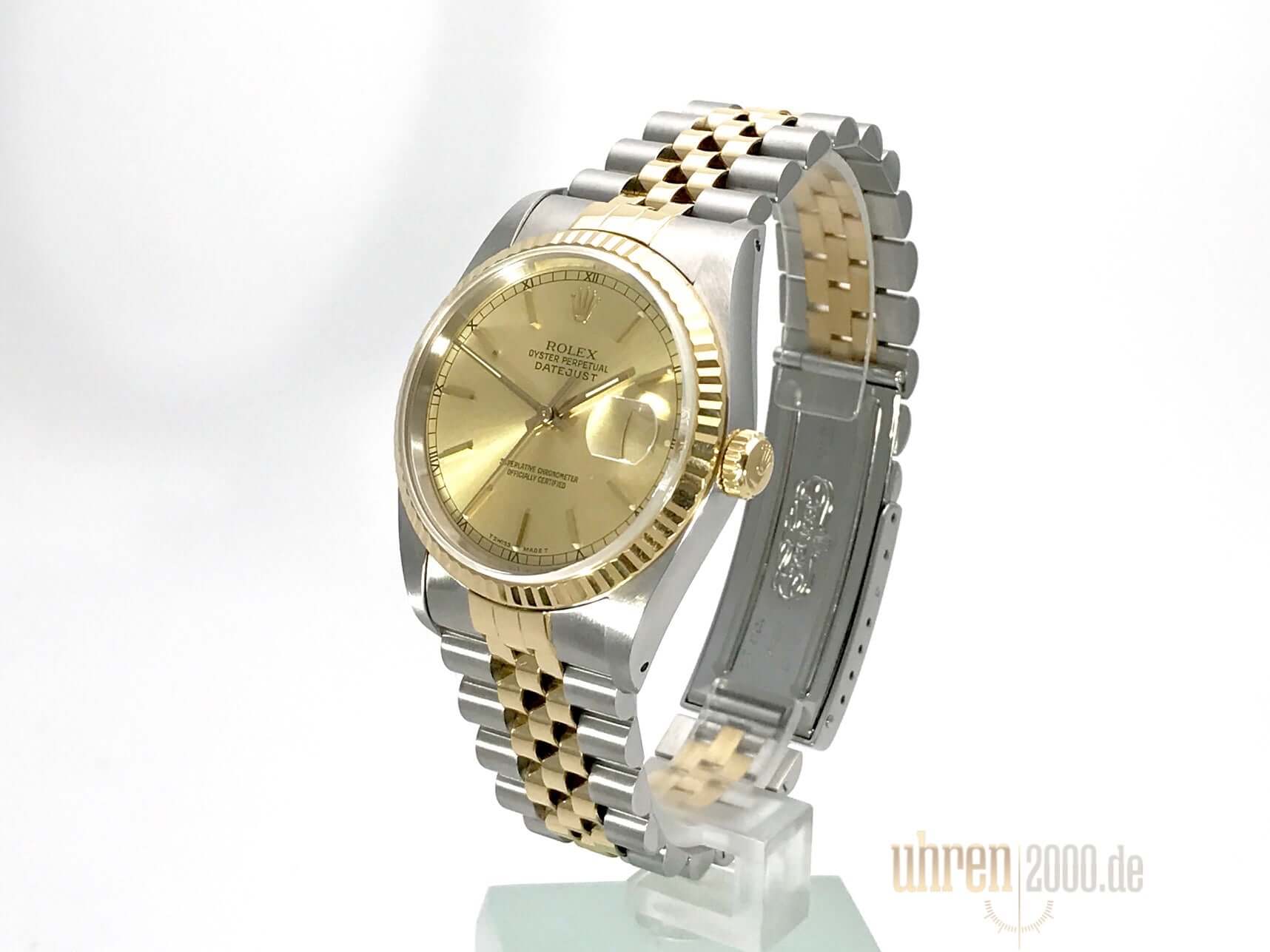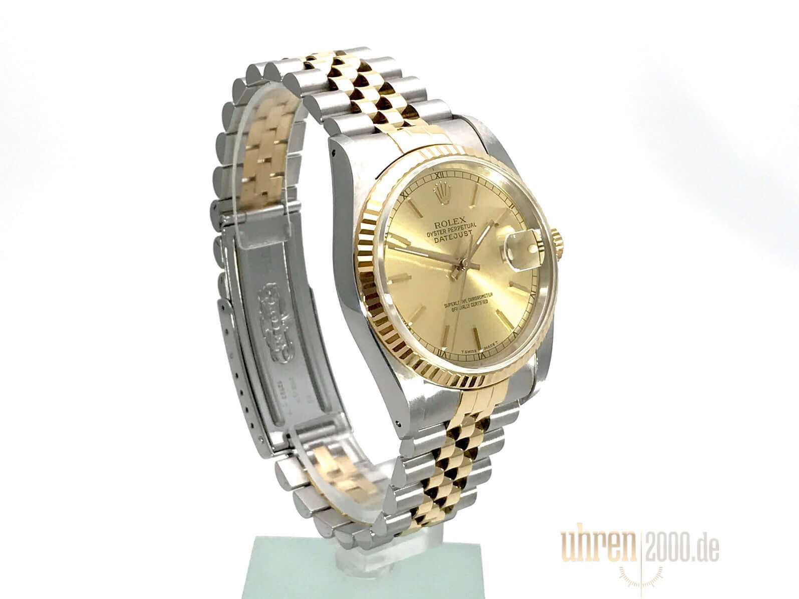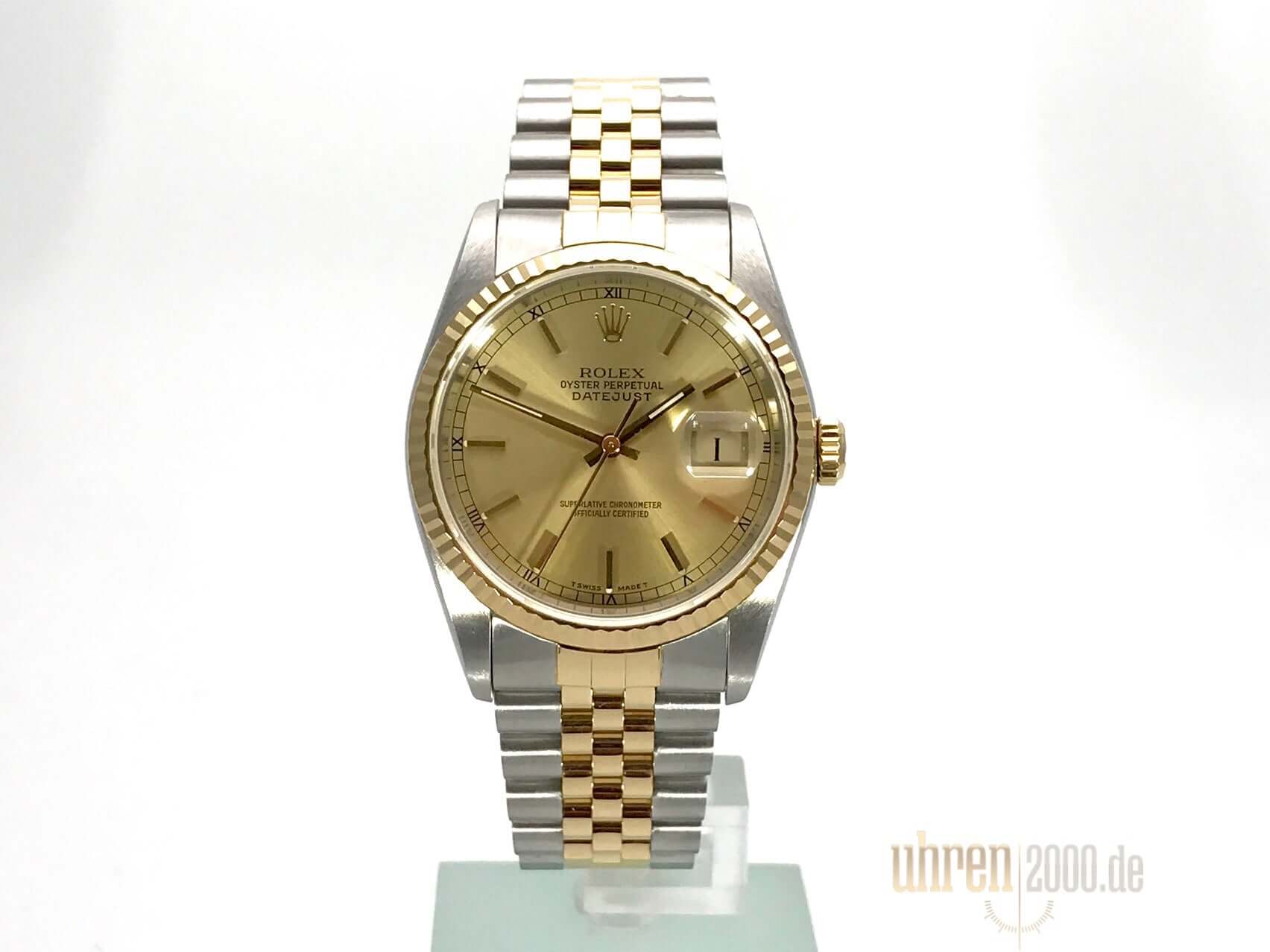 Gehäuse aus Edelstahl poliert und satiniert, Durchmesser 36 mm, Lünette aus 18 kt Gelbgold geriffelt, Jubile Edelstahl / 18 kt Gelbgold Armband poliert und satiniert mit Faltschließe, Champagnerfarbenes Zifferblatt mit aufgesetzten goldenen Leuchtindexen, goldene Zeiger, Automatikwerk, Chronometer, Rolex Manufakturkaliber 3135 mit 31 Steine, Schwingung 28.800 A/h, Datumsanzeige, kratzfestes Saphirglas, Krone aus 18 kt Gelbgold verschraubbar, verschraubter Edelstahlboden, Wasserdicht bis 10 bar.