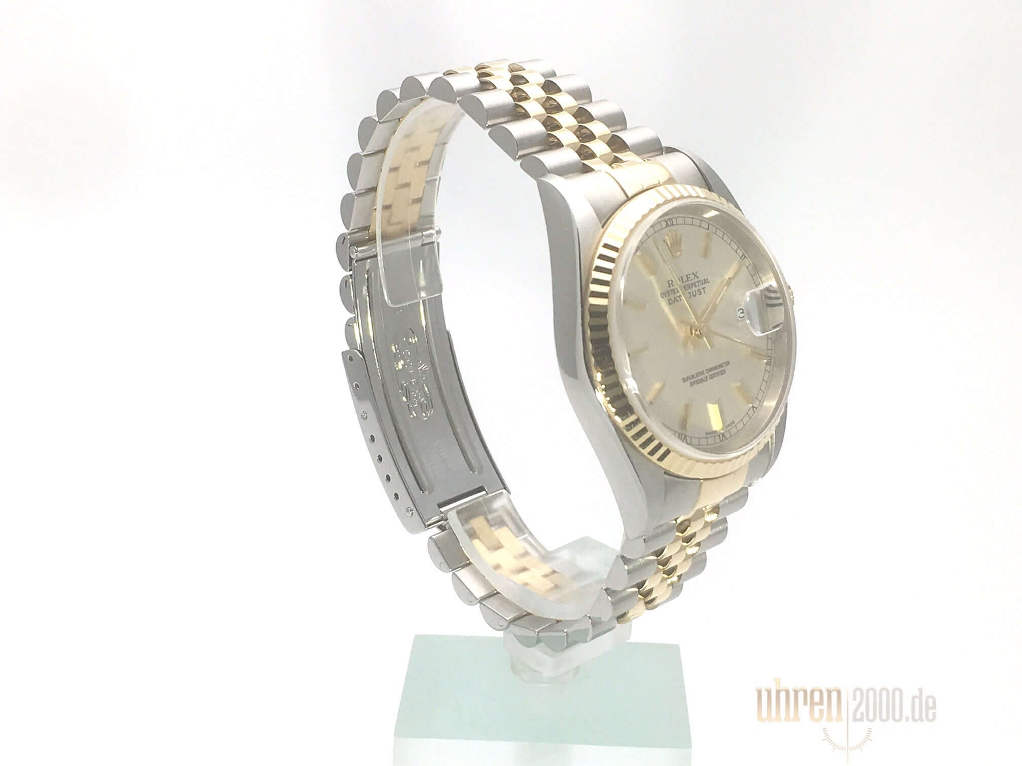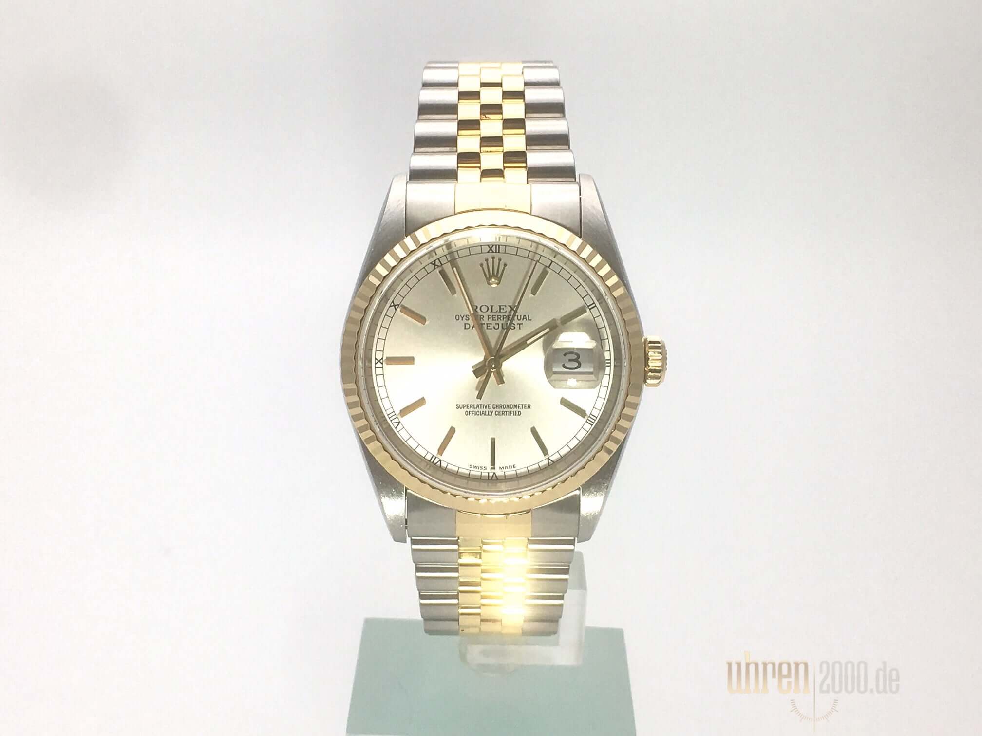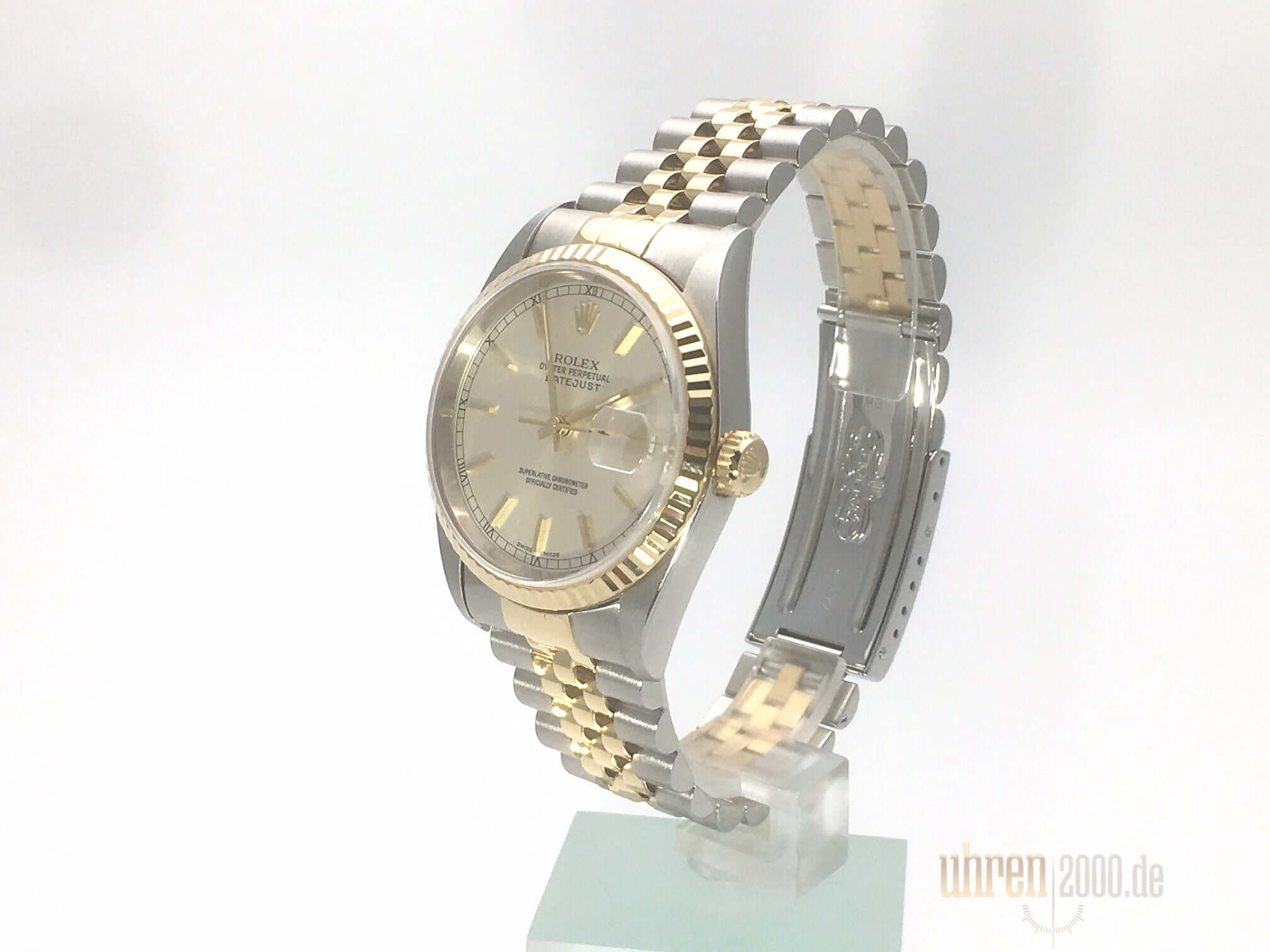 Gehäuse aus Edelstahl poliert und satiniert, Durchmesser 36 mm, Lünette aus 18 kt Gelbgold geriffelt, Jubile Edelstahl / 18 kt Gelbgold Armband poliert und satiniert mit Faltschließe, silberfarbenes Zifferblatt mit aufgesetzten goldenen Leuchtindexen, goldene Zeiger, Automatikwerk, Chronometer, Rolex Manufakturkaliber 3135 mit 31 Steine, Schwingung 28.800 A/h, Datumsanzeige, kratzfestes Saphirglas, Krone aus 18 kt Gelbgold verschraubbar, verschraubter Edelstahlboden, Wasserdicht bis 10 bar.