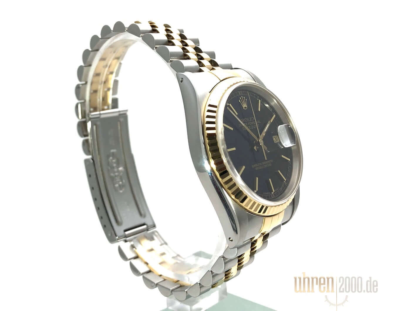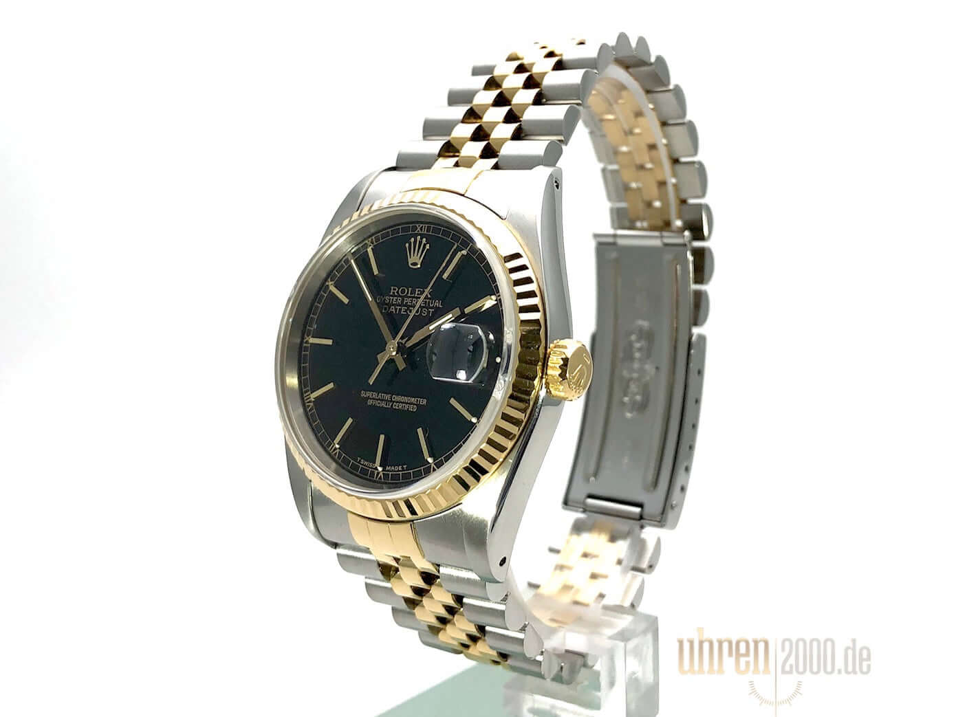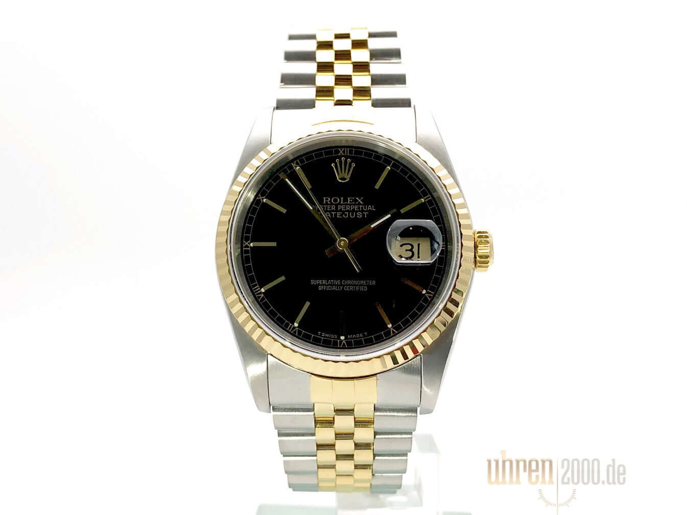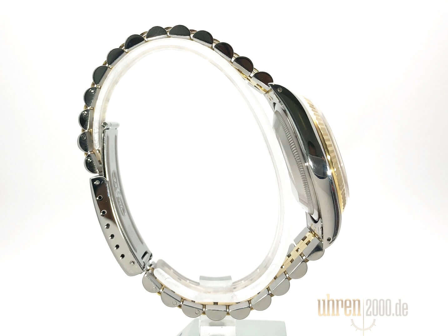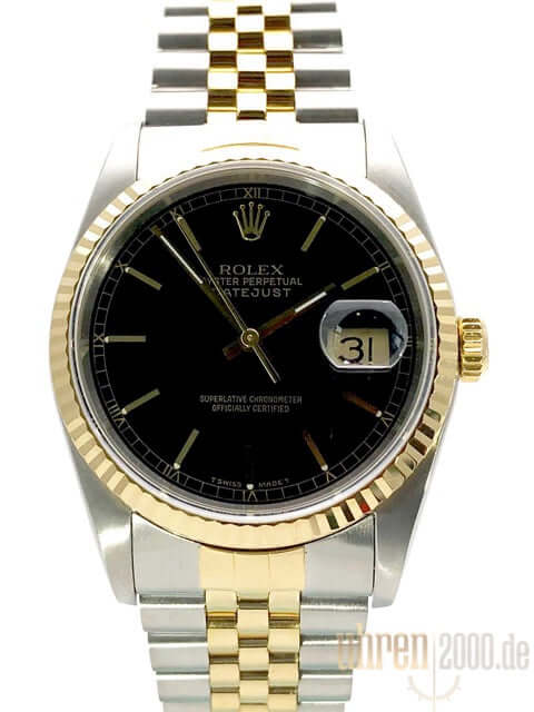 Gehäuse aus Edelstahl poliert und satiniert, Durchmesser 36 mm, Lünette aus 18 kt Gelbgold geriffelt, Jubile Edelstahl / 18 kt Gelbgold Armband poliert und satiniert mit Faltschließe, schwarzes Zifferblatt mit aufgesetzten goldenen Leuchtindizes, goldene Zeiger, Automatikwerk, Chronometer, Rolex Manufakturkaliber 3135 mit 31 Steine, Schwingung 28.800 A/h, Datumsanzeige, kratzfestes Saphirglas, Krone aus 18 kt Gelbgold verschraubbar, verschraubter Edelstahlboden, Wasserdicht bis 10 bar.