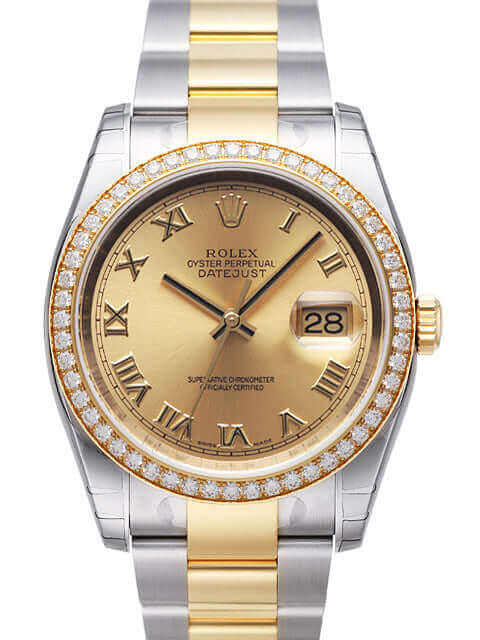 Gehäuse aus Edelstahl poliert und satiniert, Gehäusedurchmesser 36 mm, Gehäusehöhe ca.11,5 mm, 18 kt Gelbgold Lünette mit 52 Diamanten, Oyster Edelstahl / 18 kt Gelbgold Armband poliert und satiniert mit Faltschließe, Champagner Zifferblatt mit aufgesetzten römischen Ziffern aus Gelbgold, goldene Zeiger, Automatikwerk, Rolex Manufakturkaliber 3135 mit 31 Steine, Schwingung 28.800 A/h, Chronometer, Gangreserve ca. 48 Stunden, kratzfestes Saphirglas, Datum, verschraubte 18 kt Gelbgold Krone, verschraubter Edelstahlboden, Wasserdicht bis zu 10 bar.