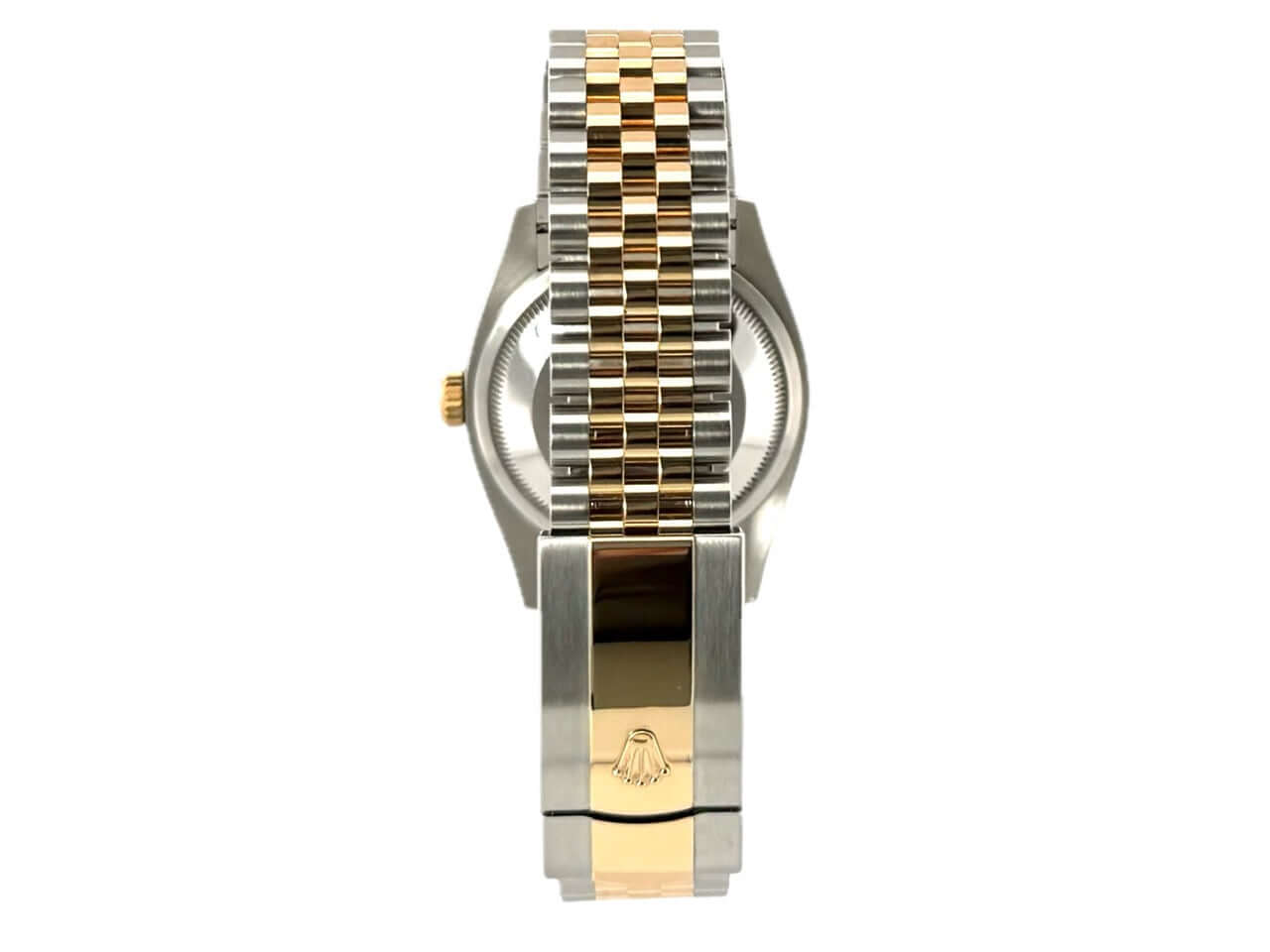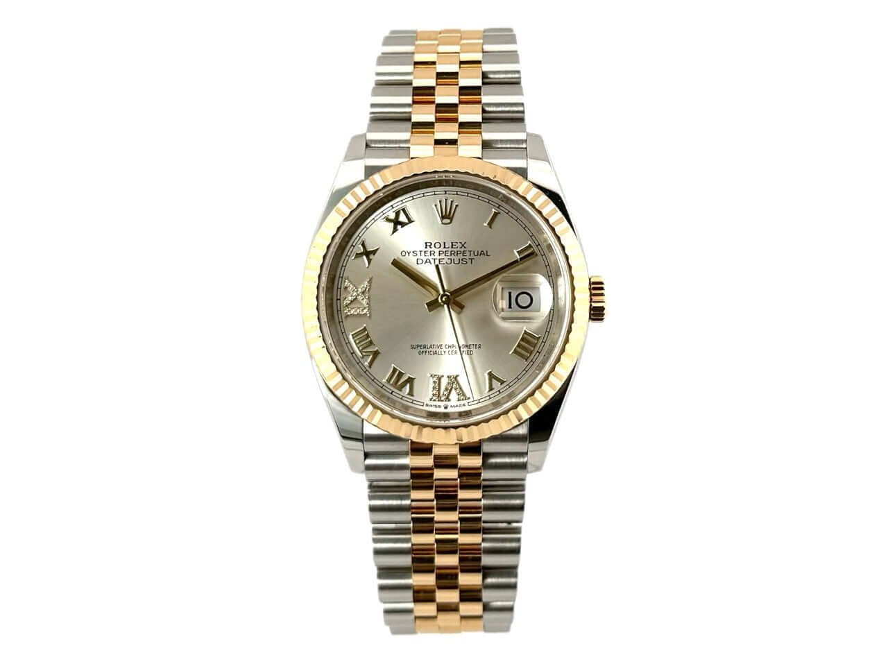 Gehäuse aus Edelstahl / Gelbgold poliert und satiniert, Gehäusedurchmesser 36 mm, geriffelte 18 kt Gelbgold Lünette, Jubilé Armband aus Edelstahl / 18 kt Gelbgold poliert und satiniert mit Faltschließe, silberfarbenes Zifferblatt mit Diamanten in der Römisch VI und IX, Gelbgold Zeiger, Automatikwerk, Rolex Manufakturkaliber 3235 mit 31 Steine, 28.800 A/h, 70 Stunden Gangreserve, Datumsanzeige, Chronometer, kratzfestes Saphirglas, verschraubte 18 kt Gelbgold Krone, Edelstahlboden verschraubt, wasserdicht bis zu 10 bar.