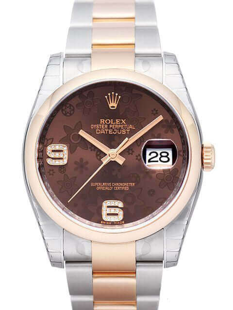 Gehäuse aus Edelstahl poliert und satiniert, Gehäusedurchmesser 36 mm, polierte Lünette aus 18 kt Roségold Everose, Oyster Armband aus Edelstahl / 18 kt Roségold Everose poliert und satiniert mit Faltschließe, Zifferblatt Schoko Floral mit 32 aufgesetzten Diamanten bei 6 und 9, roségoldene Zeiger, Automatikwerk, Chronometer, Rolex Manufakturkaliber 3135 mit 31 Steine, 28.800 A/h, Datumsanzeige, kratzfestes Saphirglas, verschraubbare Krone aus 18 kt Roségold Everose, Edelstahlboden verschraubt, Wasserdicht bis zu 10 bar.