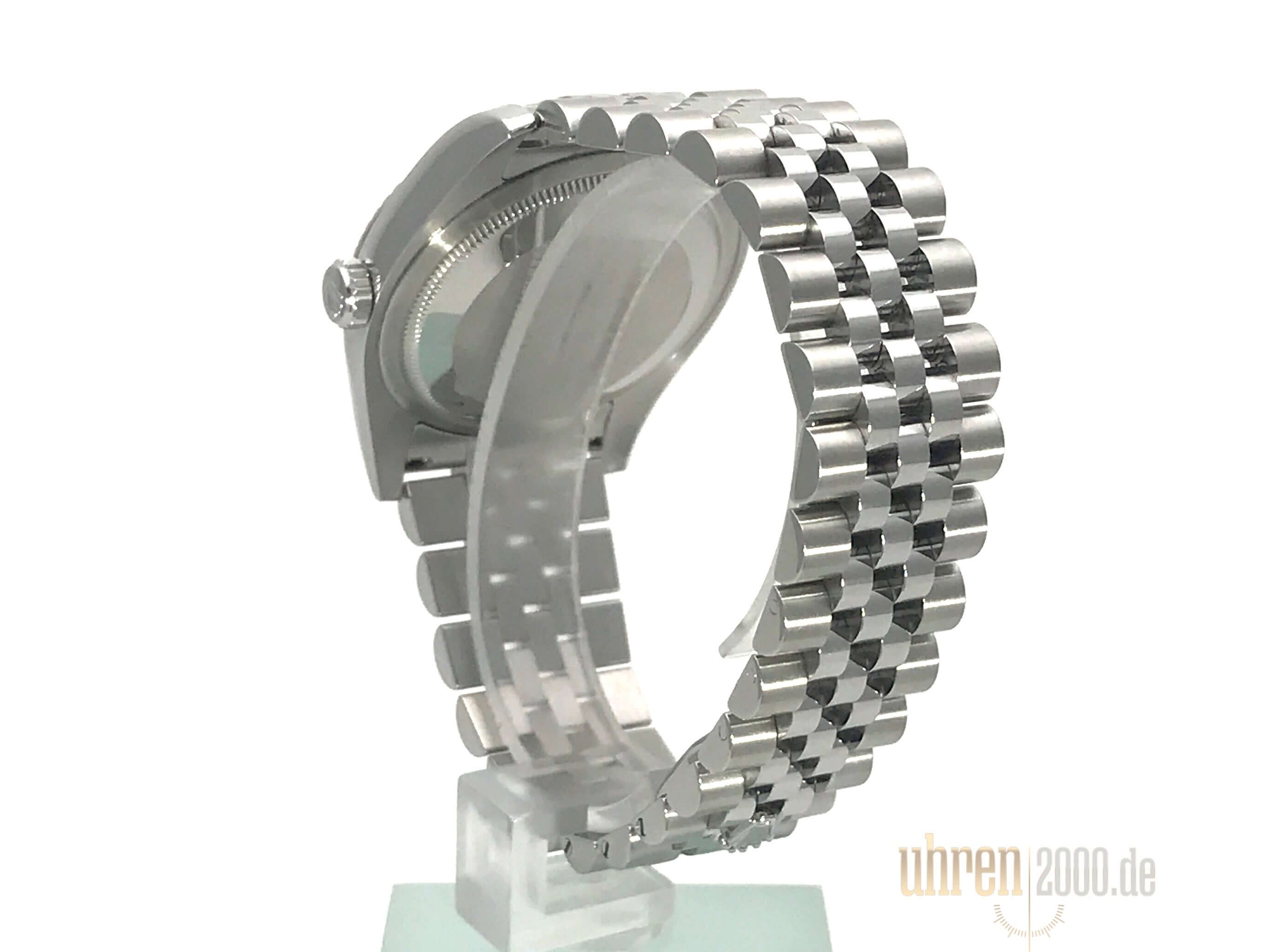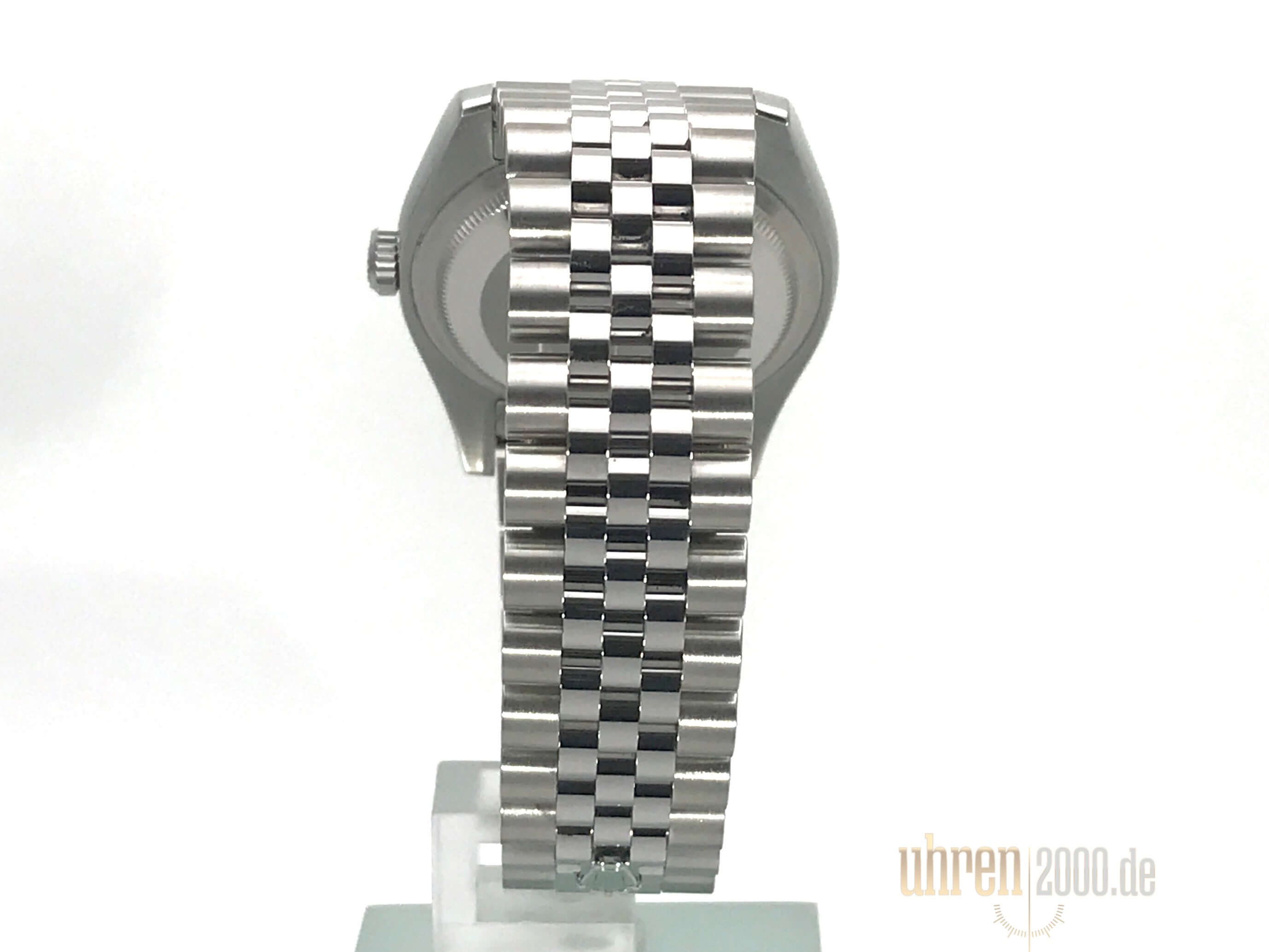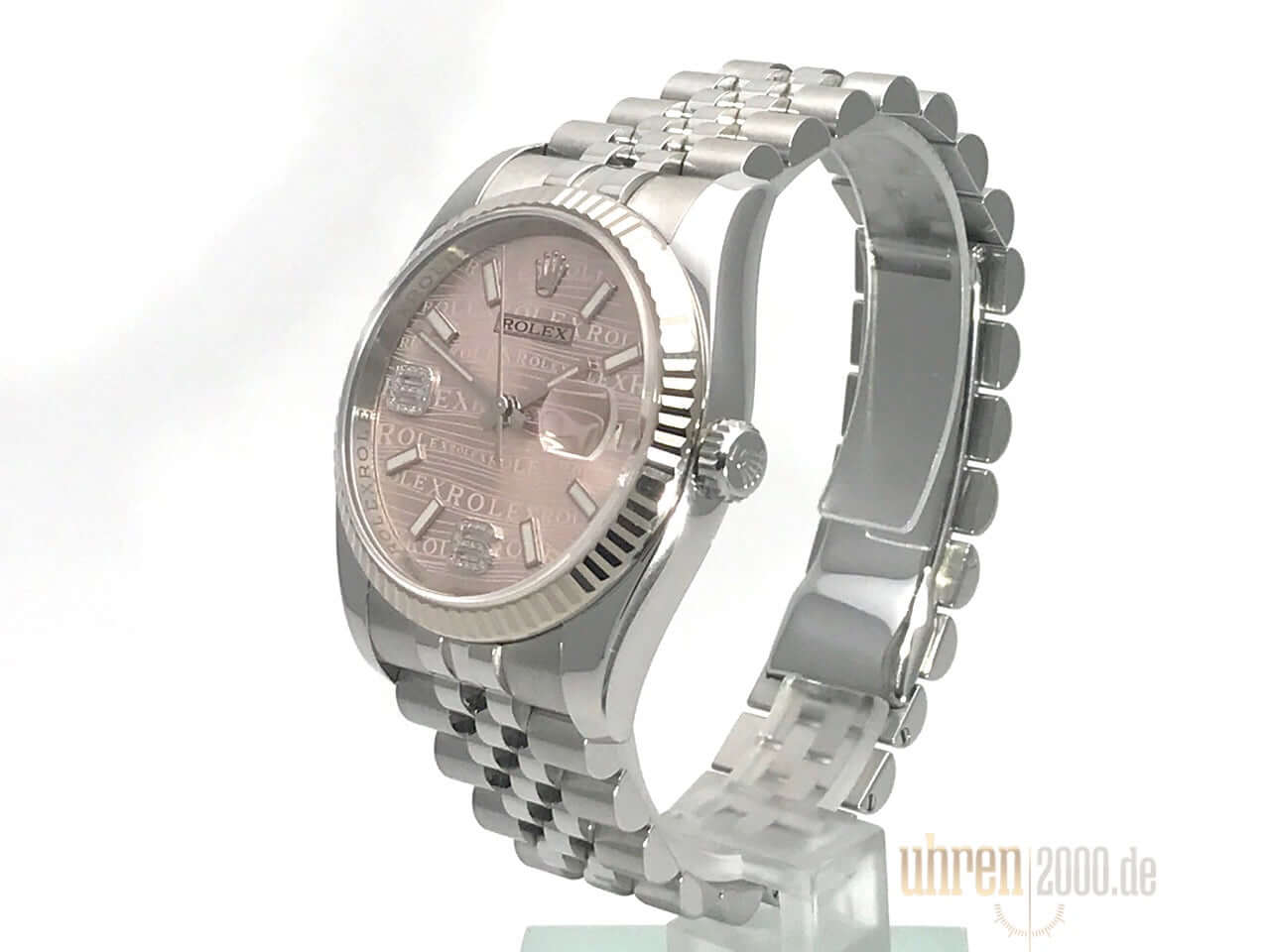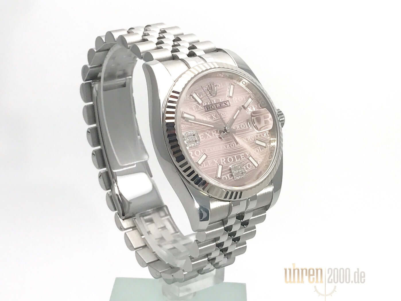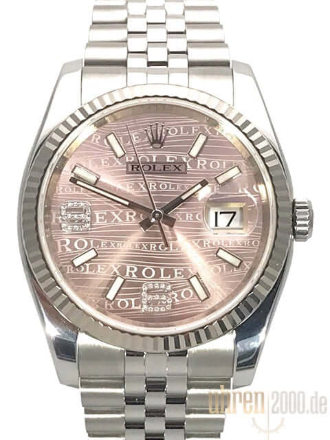 Gehäuse aus Edelstahl poliert und satiniert, Gehäusedurchmesser 36 mm, Gehäusehöhe 11,7 mm, geriffelte 18 kt Weißgold Lünette, Jubile Edelstahlband poliert und satiniert mit Faltschließe, Zifferblatt Pink Wave mit 32 aufgesetzten Diamanten in der 6 und 9, Uhrwerk Automatik, Rolex Manufakturkaliber 3135 mit 31 Steine, 28.800 A/h, Saphirglas, Datumsanzeige, Chronometer, verschraubte Krone, verschraubter Edelstahlboden, Wasserdicht bis zu 10 bar.