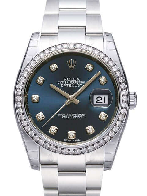 Gehäuse aus Edelstahl poliert und satiniert, Gehäusedurchmesser 36 mm, Gehäusehöhe ca.11,5 mm, 18 kt Weißgold Lünette mit 52 Diamanten, Oyster Edelstahl Armband poliert und satiniert mit Faltschließe, blaues Zifferblatt mit 10 aufgesetzten Diamanten, Automatikwerk, Rolex Manufakturkaliber 3135 mit 31 Steine, Schwingung 28.800 A/h, Chronometer, Gangreserve ca. 48 Stunden, Datumsanzeige, kratzfestes Saphirglas, verschraubbare Krone, verschraubter Edelstahlboden, Wasserdicht bis zu 10 bar.