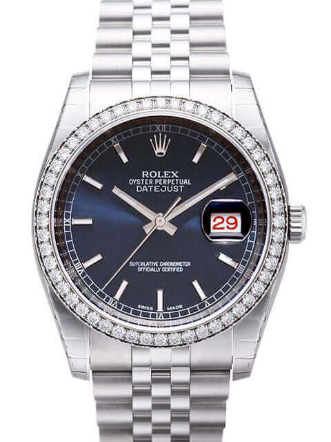 Gehäuse aus Edelstahl poliert und satiniert, Gehäusedurchmesser 36 mm, Gehäusehöhe ca.11,5 mm, Lünette aus 18 kt Weißgold mit 52 Diamanten, Jubilé Edelstahl Armband poliert und satiniert mit Faltschließe, blaues Zifferblatt mit aufgesetzten Leuchtindizes, Leuchtzeiger, Automatikwerk, Rolex Manufakturkaliber 3135 mit 31 Steine, Schwingung 28.800 A/h, Chronometer, Gangreserve ca. 48 Stunden, Datumsanzeige, kratzfestes Saphirglas, verschraubte Krone, verschraubter Edelstahlboden, Wasserdicht bis zu 10 bar.