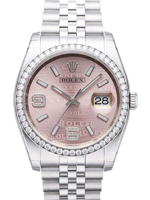 Gehäuse aus Edelstahl poliert und satiniert, Gehäusedurchmesser 36 mm, Gehäusehöhe ca.11,5 mm, Lünette aus 18 kt Weißgold mit 52 Diamanten, Jubilé Edelstahl Armband poliert und satiniert mit Faltschließe, pinkfarbenes Wave Zifferblatt mit 32 aufgesetzten Diamanten in der 6 und 9, Automatikwerk, Rolex Manufakturkaliber 3135 mit 31 Steine, Schwingung 28.800 A/h, Chronometer, Gangreserve ca. 48 Stunden, Datum, kratzfestes Saphirglas, verschraubte Krone, verschraubter Edelstahlboden, Wasserdicht bis zu 10 bar.