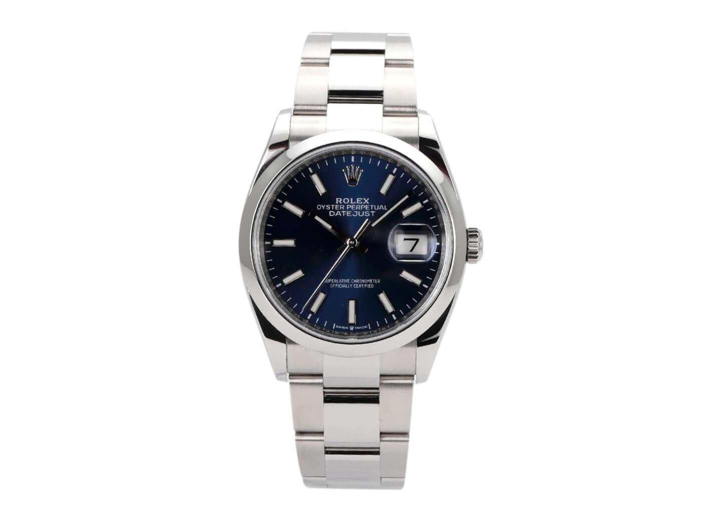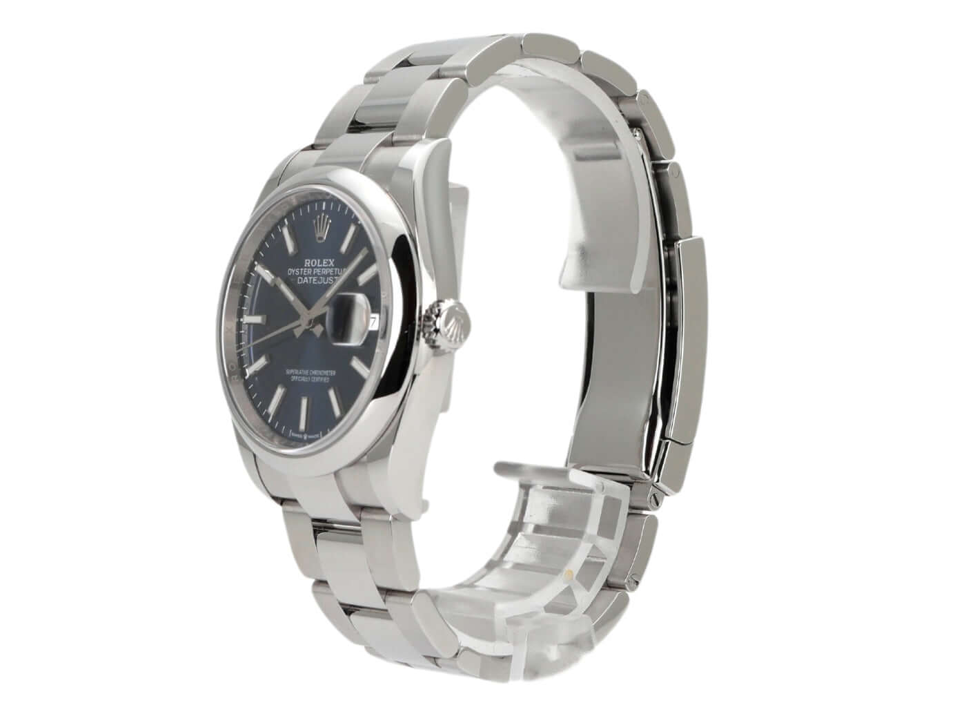 Gehäuse aus Edelstahl Oystersteel poliert und satiniert, Gehäusedurchmesser 36 mm, blaues Zifferblatt mit aufgesetzten Leuchtindizes, Leuchtzeiger, Oyster-Edelstahlband mit Faltschließe, Automatik, Rolex Manufakturkaliber 3235, 70 Stunden Gangreserve, Datumsanzeige, Chronometer, Saphirglas, verschraubte Krone, Edelstahlboden verschraubt, Wasserdicht bis 10 bar.