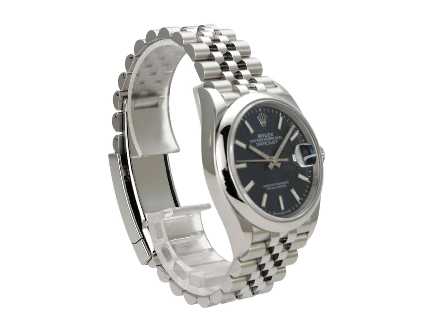 Gehäuse aus Edelstahl Oystersteel poliert und satiniert, Gehäusedurchmesser 36 mm, blaues Zifferblatt mit aufgesetzten Leuchtindizes, Leuchtzeiger, Jubilé-Edelstahlband mit Faltschließe, Automatik, Rolex Manufakturkaliber 3235, 70 Stunden Gangreserve, Datumsanzeige, Chronometer, Saphirglas, verschraubte Krone, Edelstahlboden verschraubt, wasserdicht bis 10 bar.