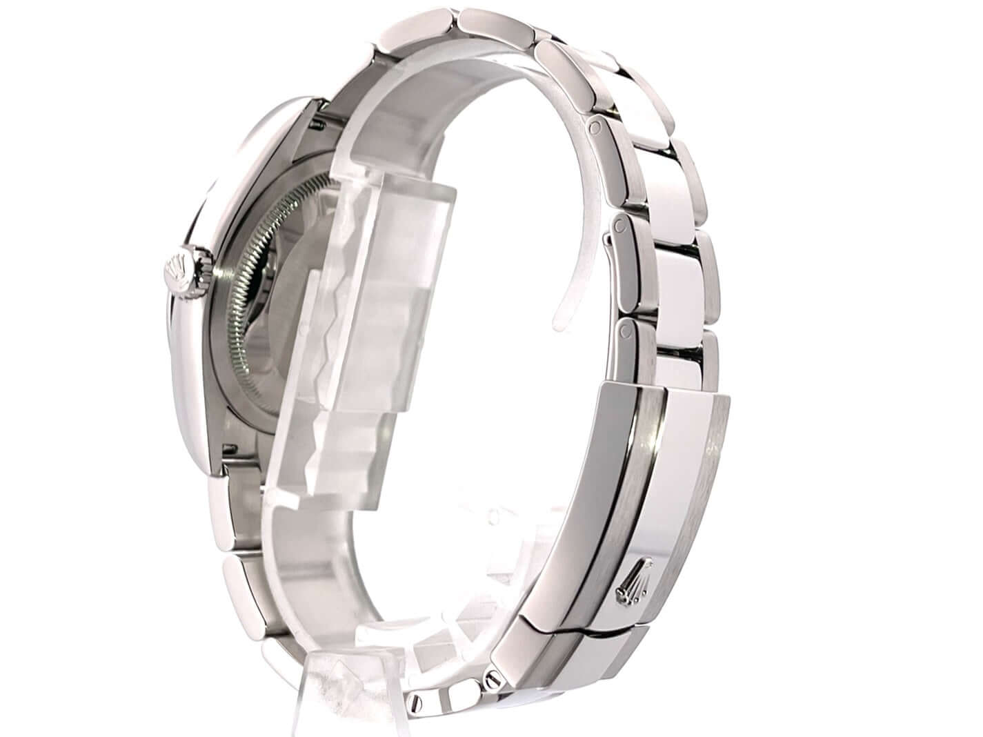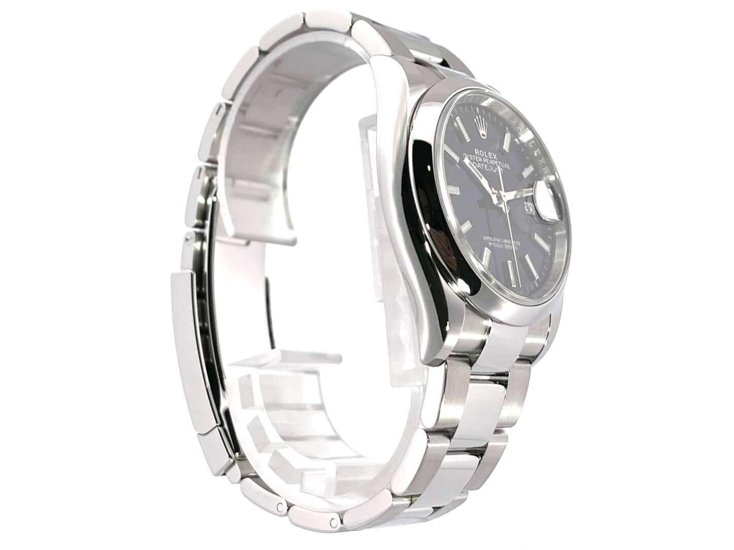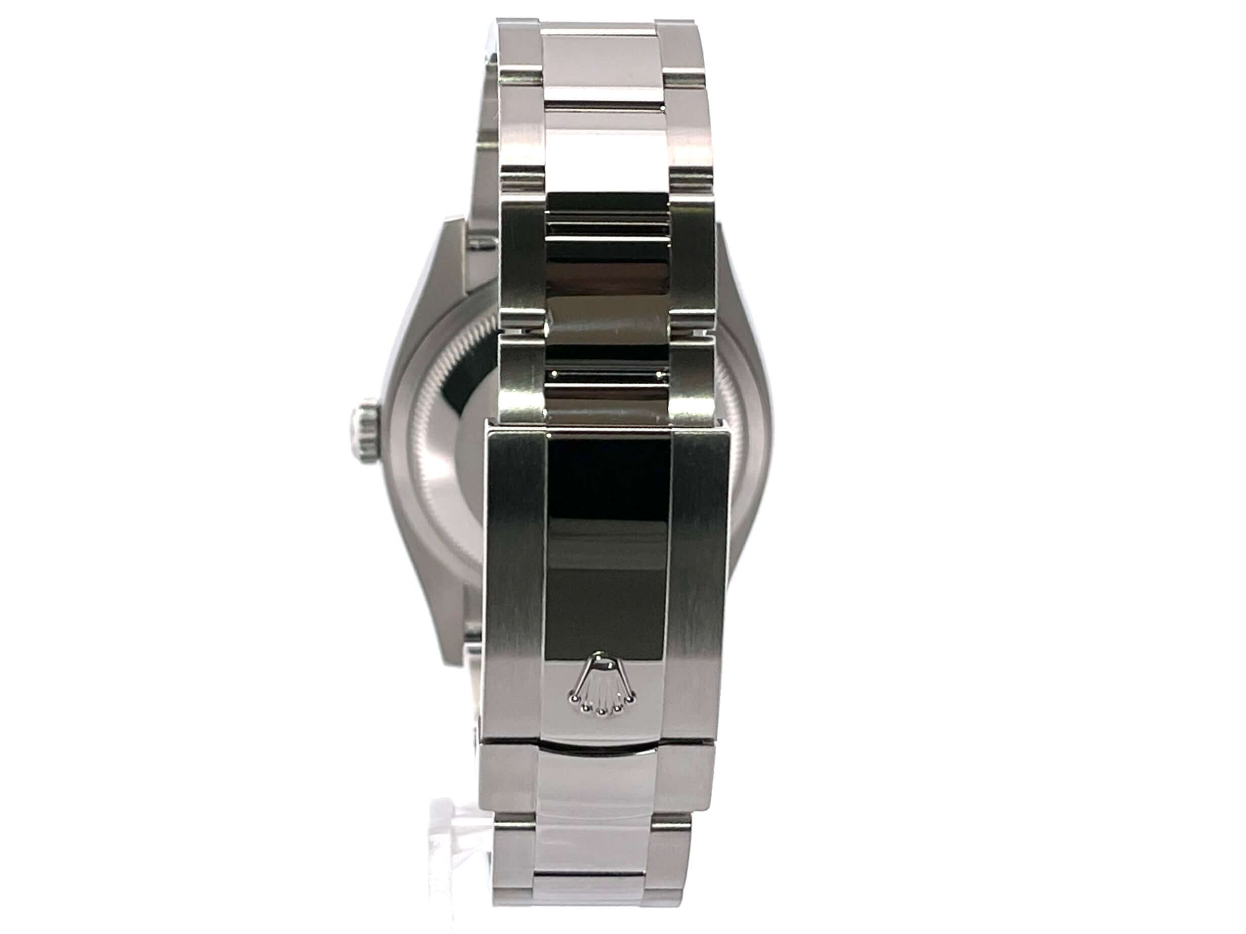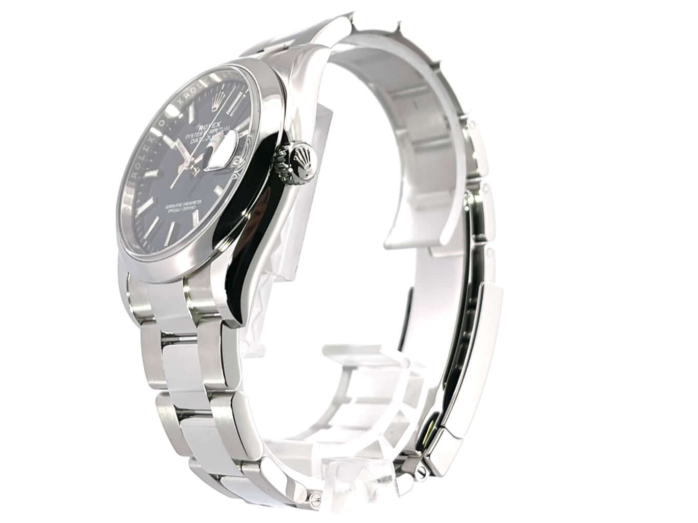 Gehäuse aus Edelstahl Oystersteel poliert und satiniert, Gehäusedurchmesser 36 mm, blaues Zifferblatt mit Riffelmuster und aufgesetzten Leuchtindizes, Leuchtzeiger, Oyster-Edelstahlband mit Faltschließe, Automatik, Rolex Manufakturkaliber 3235, 70 Stunden Gangreserve, Datumsanzeige, Chronometer, Saphirglas, verschraubte Krone, Edelstahlboden verschraubt, Wasserdicht bis 10 bar.