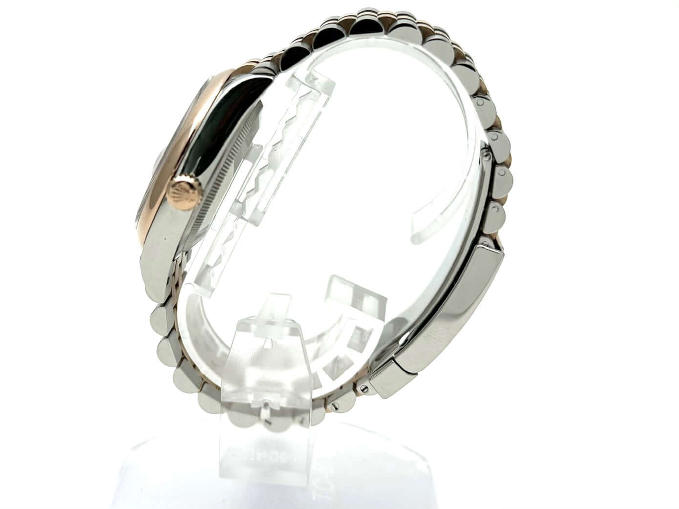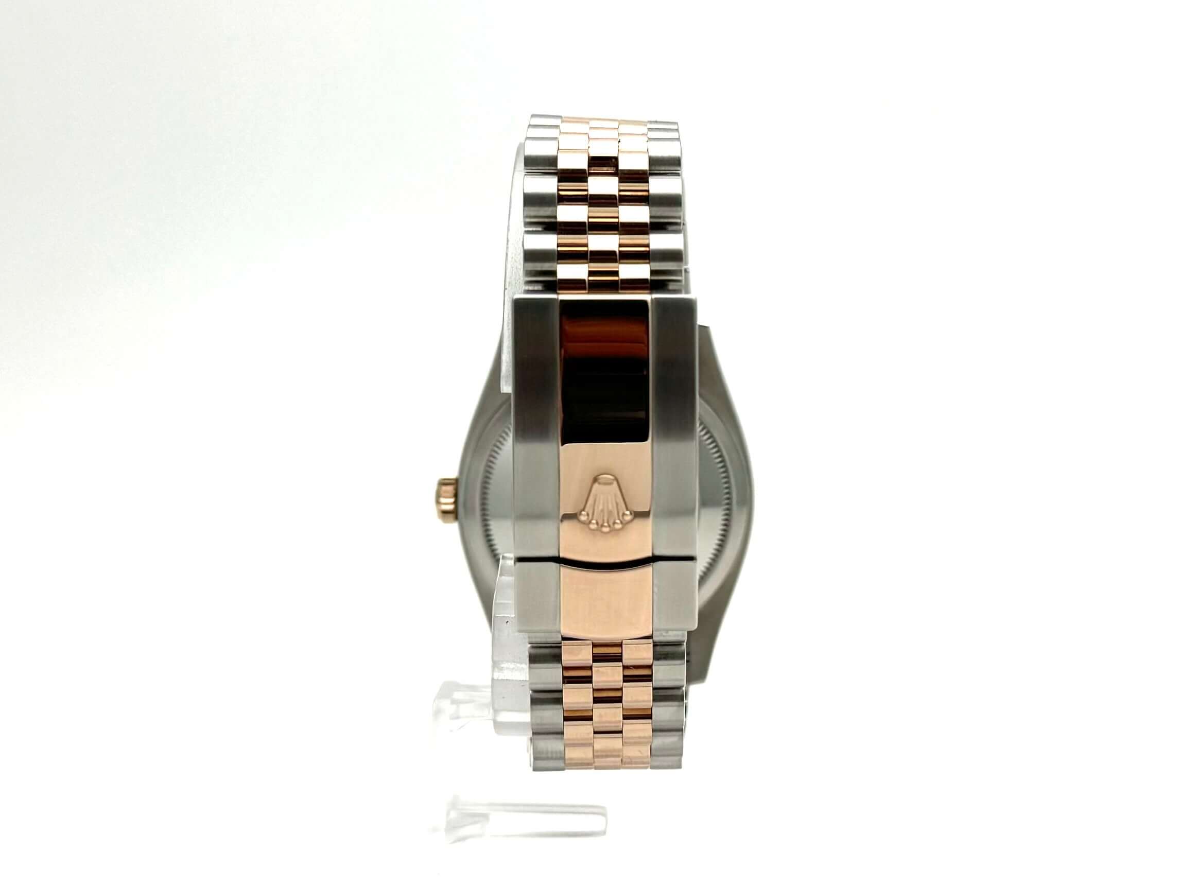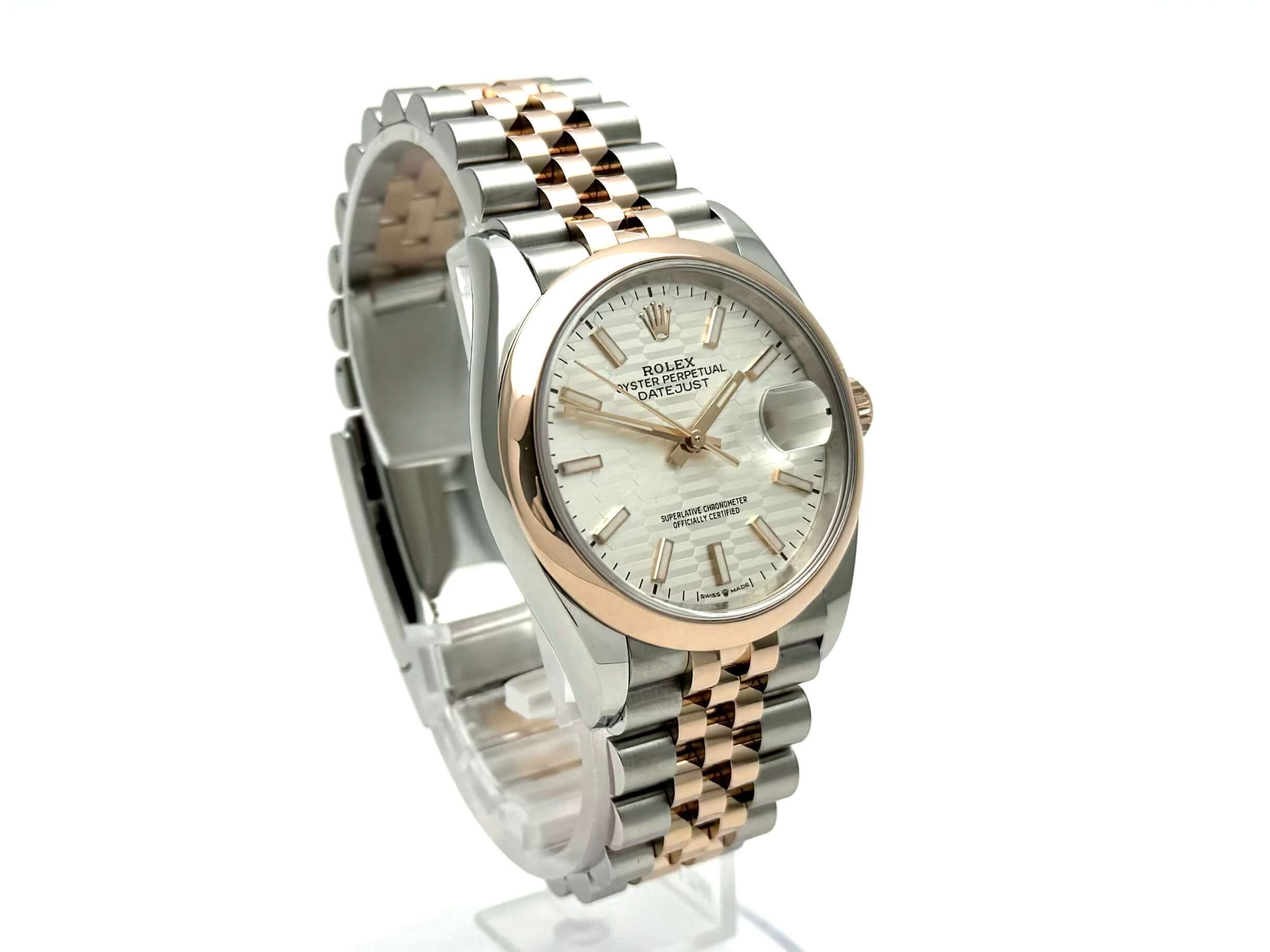 Gehäuse aus Oystersteel / Everose-Gold poliert und satiniert, Gehäusedurchmesser 36 mm, polierte 18 kt Everose-Gold Lünette, Jubile Armband aus Oystersteel / 18 kt Everose-Gold poliert und satiniert mit Faltschließe, Zifferblatt Silber Riffelmuster mit aufgesetzten roségoldenen Indizes, roségoldene Zeiger, Automatikwerk, Rolex Manufakturkaliber 3235 mit 31 Steine, 28.800 A/h, 70 Stunden Gangreserve, Datumsanzeige, Chronometer, kratzfestes Saphirglas, verschraubte 18 kt Everose-Gold Krone, Edelstahlboden verschraubt, Wasserdicht bis zu 10 bar.
