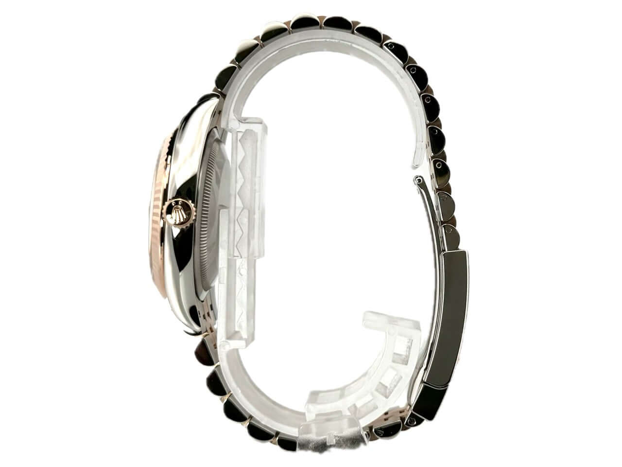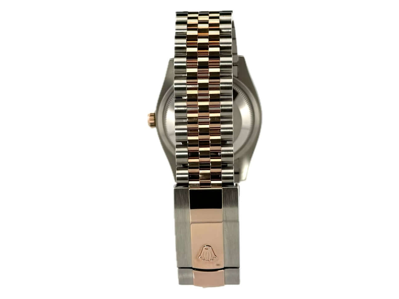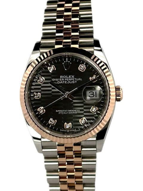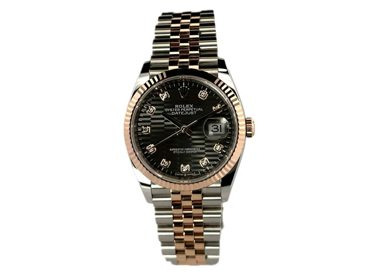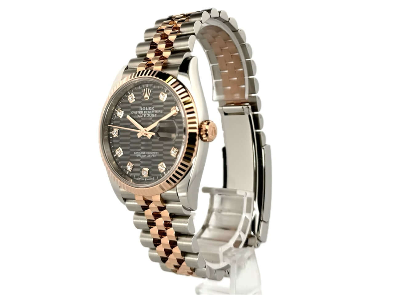 Gehäuse aus Edelstahl / Everose-Gold poliert und satiniert, Gehäusedurchmesser 36 mm, geriffelte 18 kt Everose-Gold Lünette, Jubile-Armband aus Edelstahl / 18 kt Everose-Gold poliert und satiniert mit Faltschließe, graues Zifferblatt mit Riffelmuster und Diamanten besetzt, Automatikwerk, Rolex Manufakturkaliber 3235 mit 31 Steine, 28.800 A/h, 70 Stunden Gangreserve, Datumsanzeige, Chronometer, kratzfestes Saphirglas, verschraubte 18 kt Everose-Gold Krone, Edelstahlboden verschraubt, Wasserdicht bis zu 10 bar.