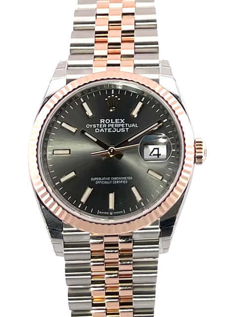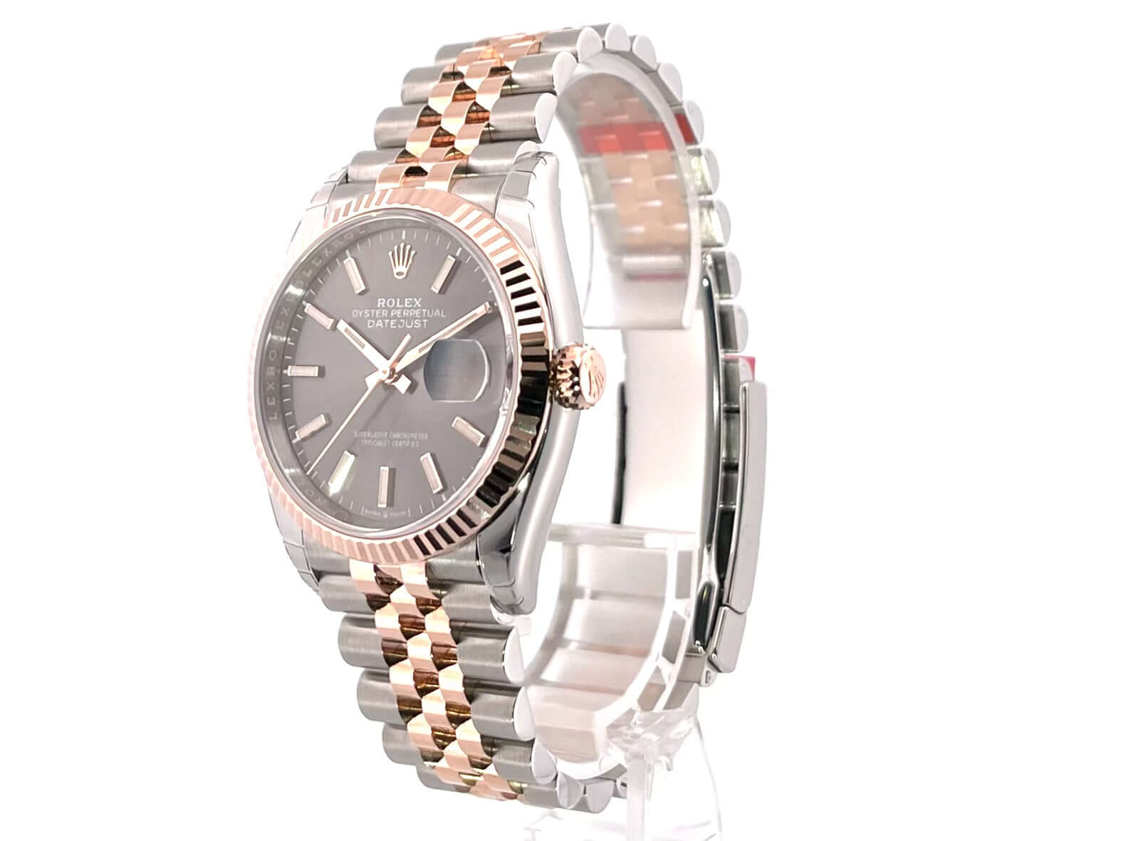 Gehäuse aus Edelstahl / Everose-Gold poliert und satiniert, Gehäusedurchmesser 36 mm, geriffelte 18 kt Everose-Gold Lünette, Jubilé Armband aus Edelstahl / 18 kt Everose-Gold poliert und satiniert mit Faltschließe, dunkles Rhodium Zifferblatt mit aufgesetzten roségoldenen Indexen, roségoldene Zeiger, Automatikwerk, Rolex Manufakturkaliber 3235 mit 31 Steine, 28.800 A/h, 70 Stunden Gangreserve, Datumsanzeige, Chronometer, kratzfestes Saphirglas, verschraubte 18 kt Everose-Gold Krone, Edelstahlboden verschraubt, Wasserdicht bis zu 10 bar.