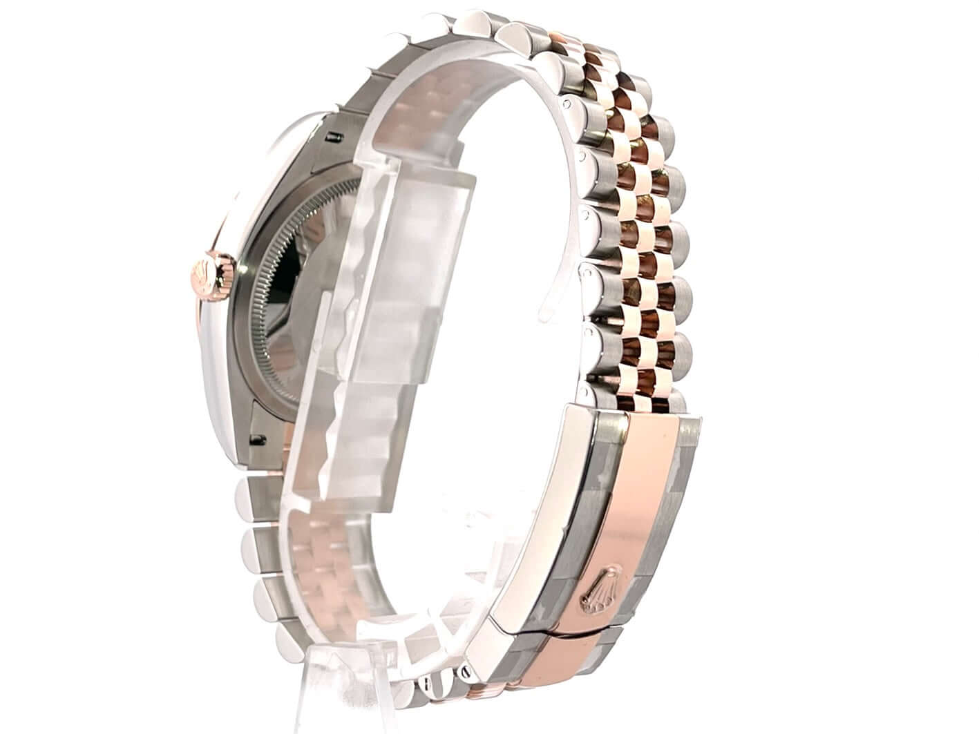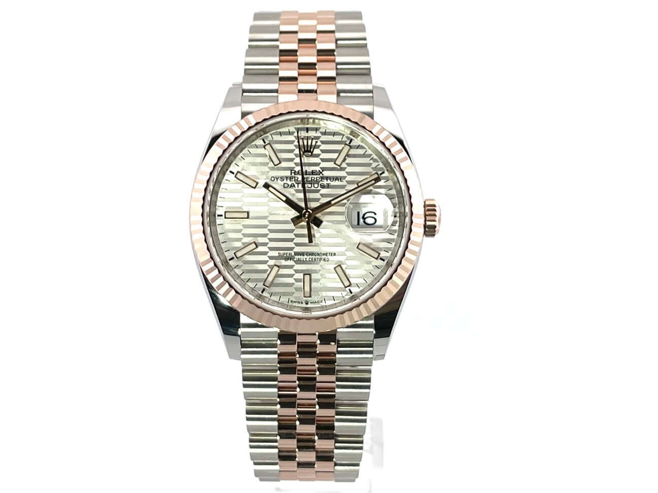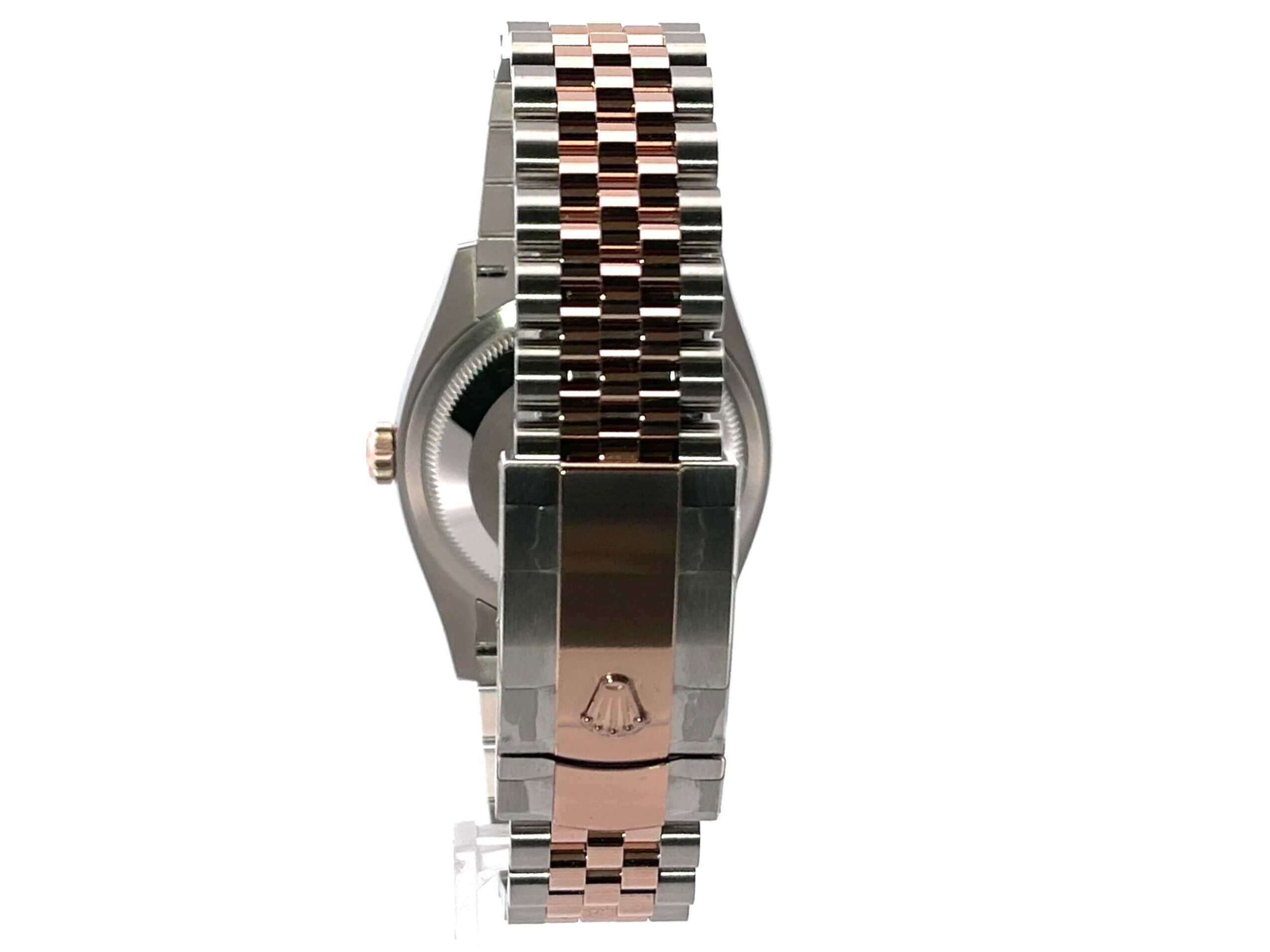 Gehäuse aus Edelstahl / Everose-Gold poliert und satiniert, Gehäusedurchmesser 36 mm, geriffelte 18 kt Everose-Gold Lünette, Jubile Armband aus Edelstahl / 18 kt Everose-Gold poliert und satiniert mit Faltschließe, silberfarbenes Zifferblatt mit Riffelmuster, Leuchtzeiger, Automatikwerk, Rolex Manufakturkaliber 3235 mit 31 Steine, 28.800 A/h, 70 Stunden Gangreserve, Datumsanzeige, Chronometer, kratzfestes Saphirglas, verschraubte 18 kt Everose-Gold Krone, Edelstahlboden verschraubt, Wasserdicht bis zu 10 bar.