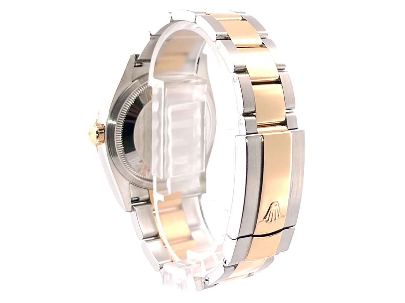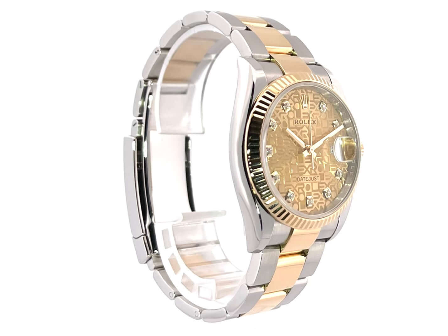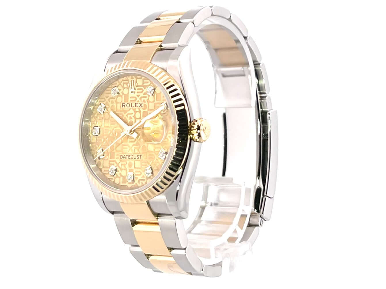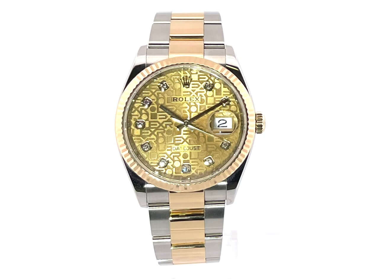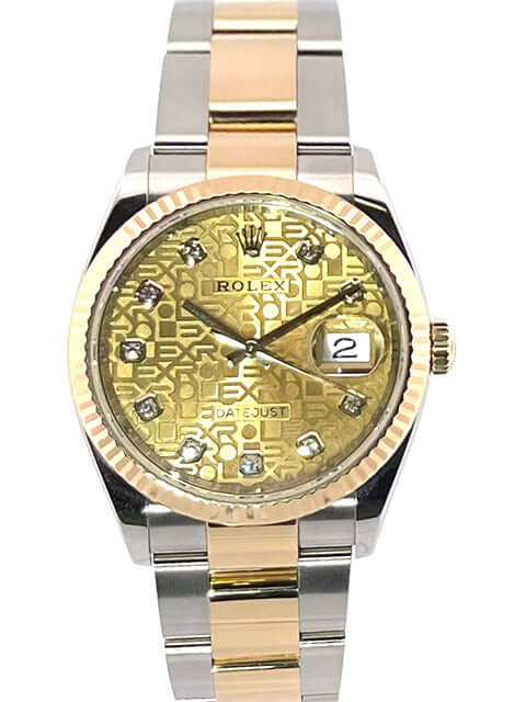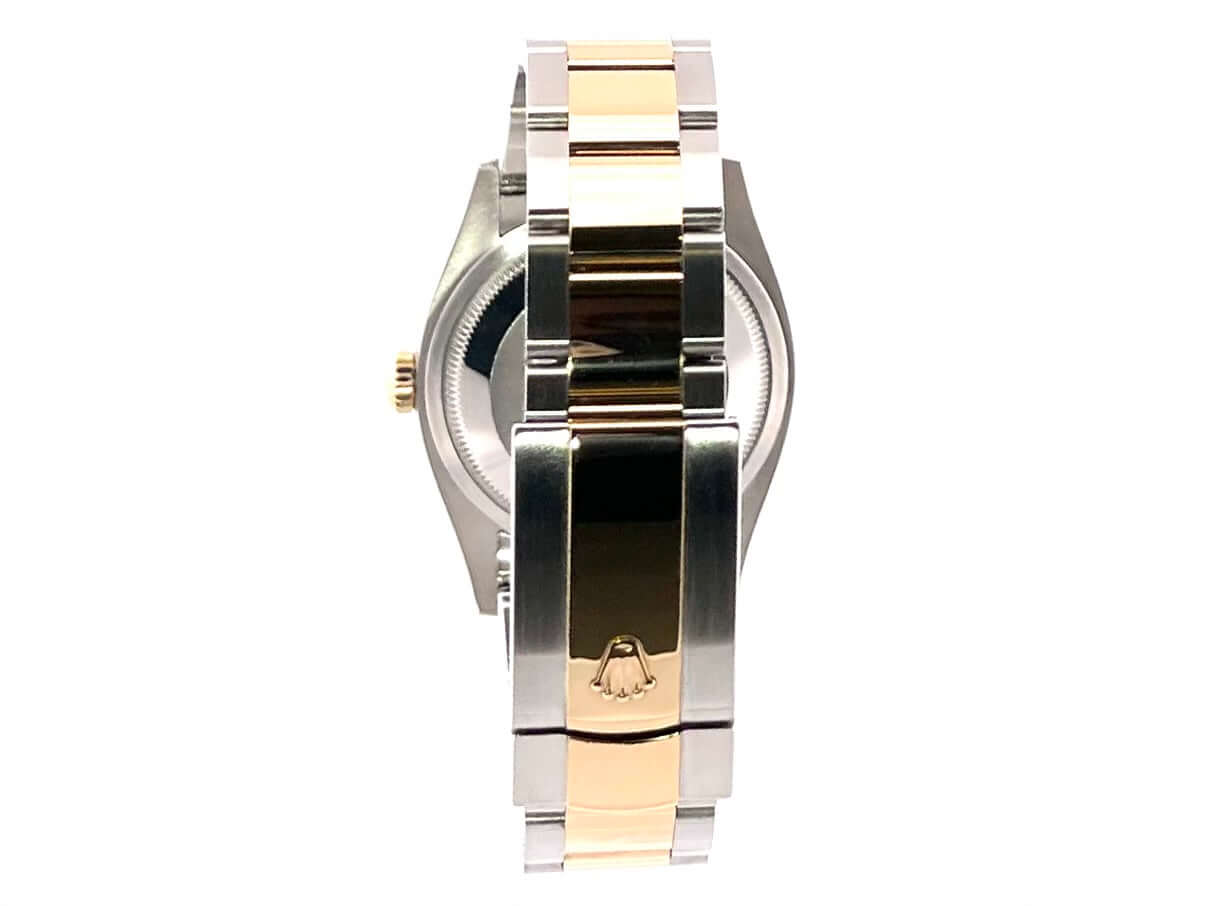 Gehäuse aus Edelstahl / Gelbgold poliert und satiniert, Gehäusedurchmesser 36 mm, geriffelte 18 kt Gelbgold Lünette, Oyster-Armband aus Edelstahl / 18 kt Gelbgold poliert und satiniert mit Faltschließe, Champagner Diamantzifferblatt mit Jubile-Druck, Gelbgold Zeiger, Automatikwerk, Rolex Manufakturkaliber 3235 mit 31 Steine, 28.800 A/h, 70 Stunden Gangreserve, Datumsanzeige, Chronometer, kratzfestes Saphirglas, verschraubte 18 kt Gelbgold Krone, Edelstahlboden verschraubt, Wasserdicht bis zu 10 bar.