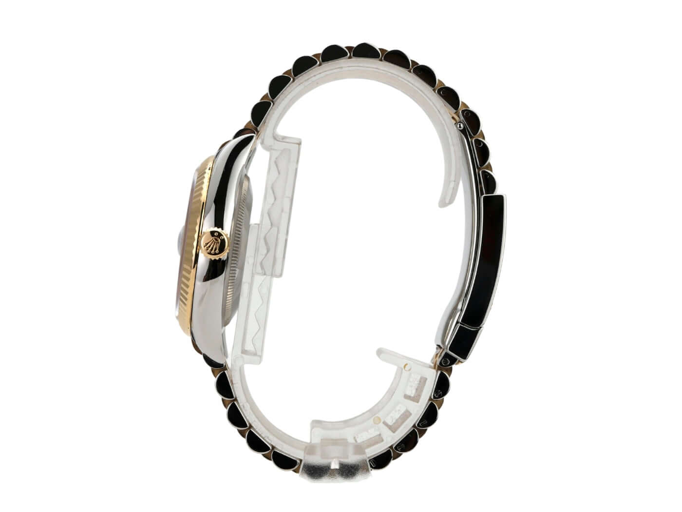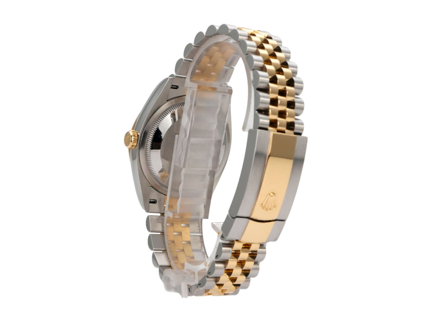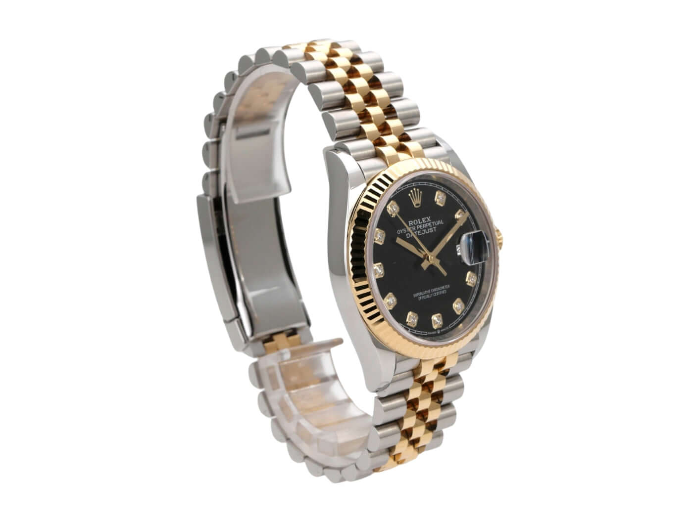 Gehäuse aus Edelstahl / Gelbgold poliert und satiniert, Gehäusedurchmesser 36 mm, geriffelte 18 kt Gelbgold Lünette, Jubilé Armband aus Edelstahl / 18 kt Gelbgold poliert und satiniert mit Faltschließe, schwarzes Diamantzifferblatt, Gelbgold Zeiger, Automatikwerk, Rolex Manufakturkaliber 3235 mit 31 Steine, 28.800 A/h, 70 Stunden Gangreserve, Datumsanzeige, Chronometer, kratzfestes Saphirglas, verschraubte 18 kt Gelbgold Krone, Edelstahlboden verschraubt, wasserdicht bis zu 10 bar.