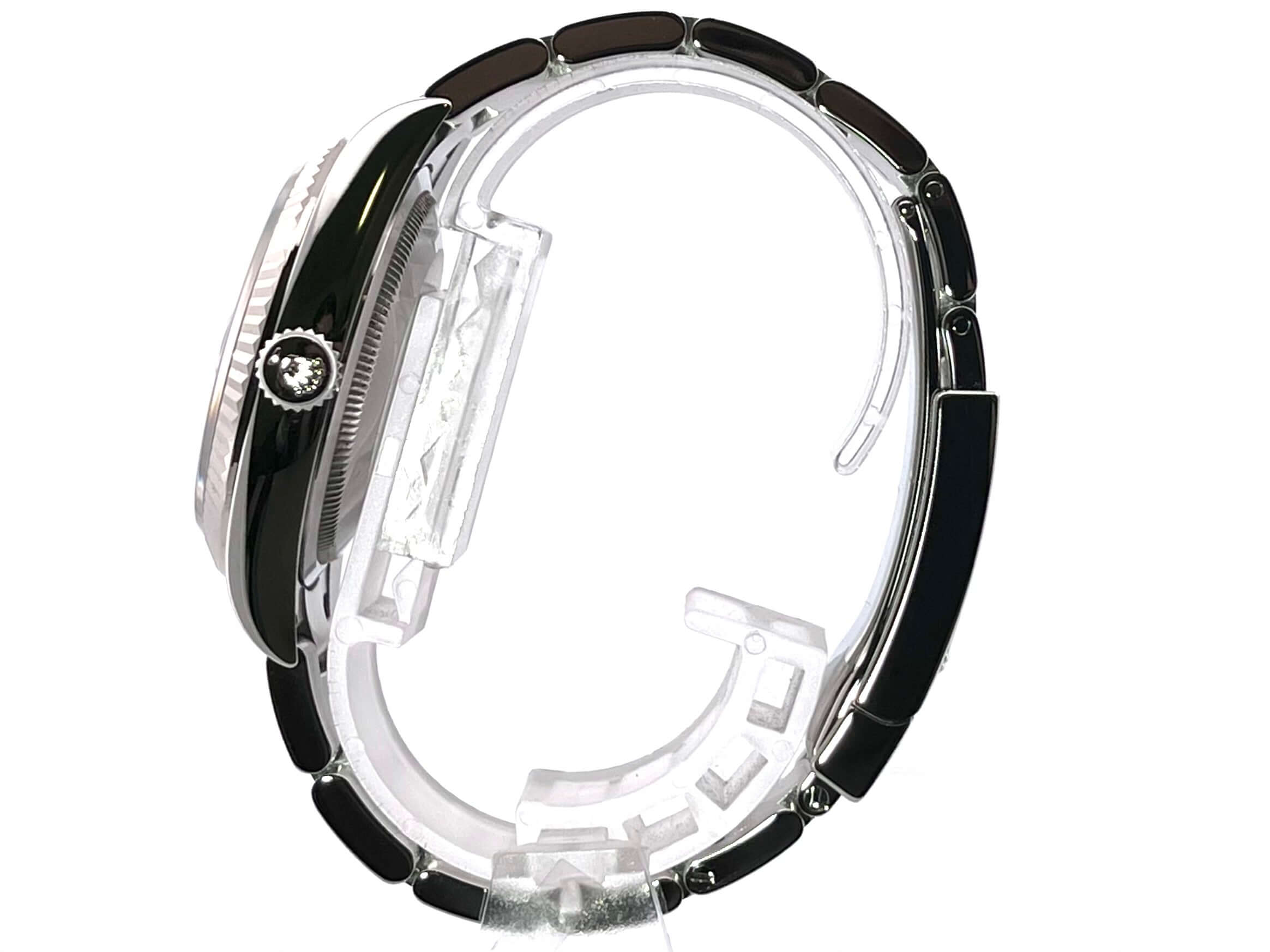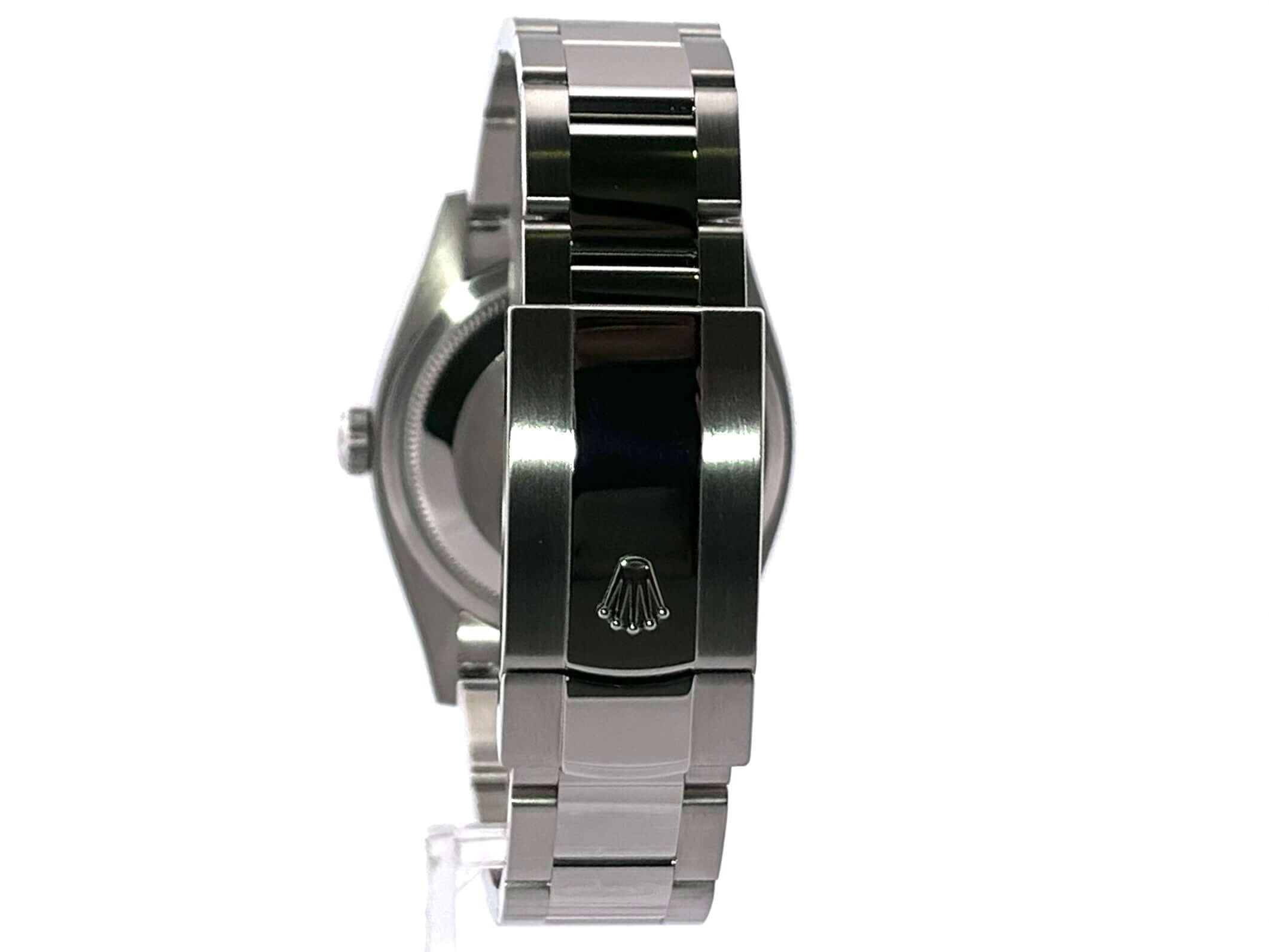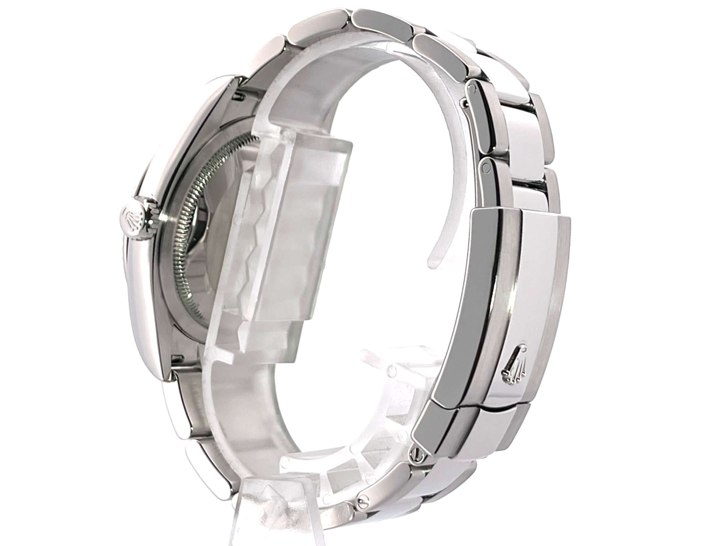 Gehäuse aus Edelstahl Oystersteel poliert und satiniert, Gehäusedurchmesser 36 mm, Lünette aus 18 kt Weißgold, blaues Zifferblatt mit 10 aufgesetzten Diamanten, Oyster Edelstahlband mit Faltschließe, Automatik, Rolex Manufakturkaliber 3235, 70 Stunden Gangreserve, Datumsanzeige, Chronometer, Saphirglas, verschraubte Krone, Edelstahlboden verschraubt, Wasserdicht bis 10 bar.