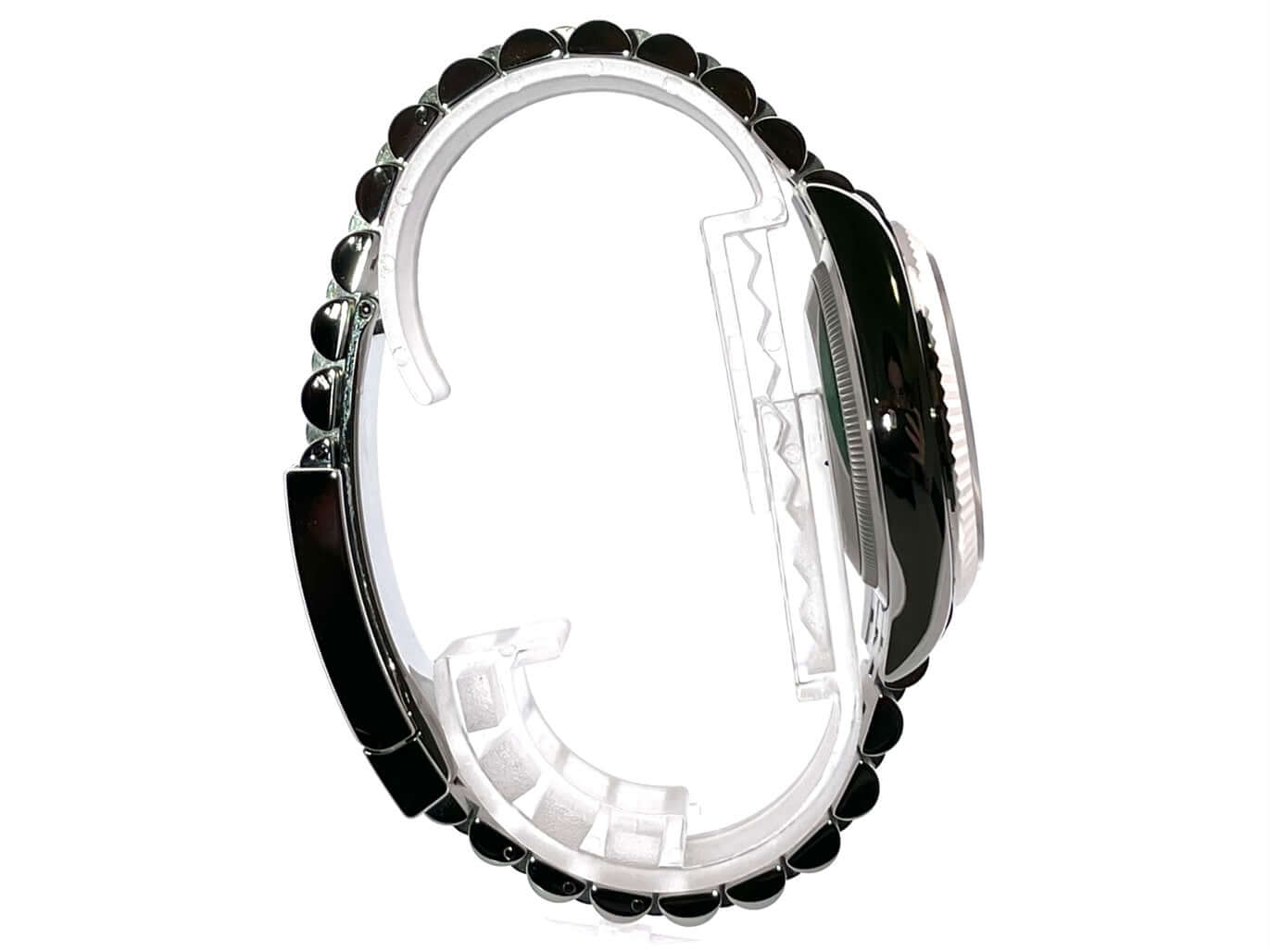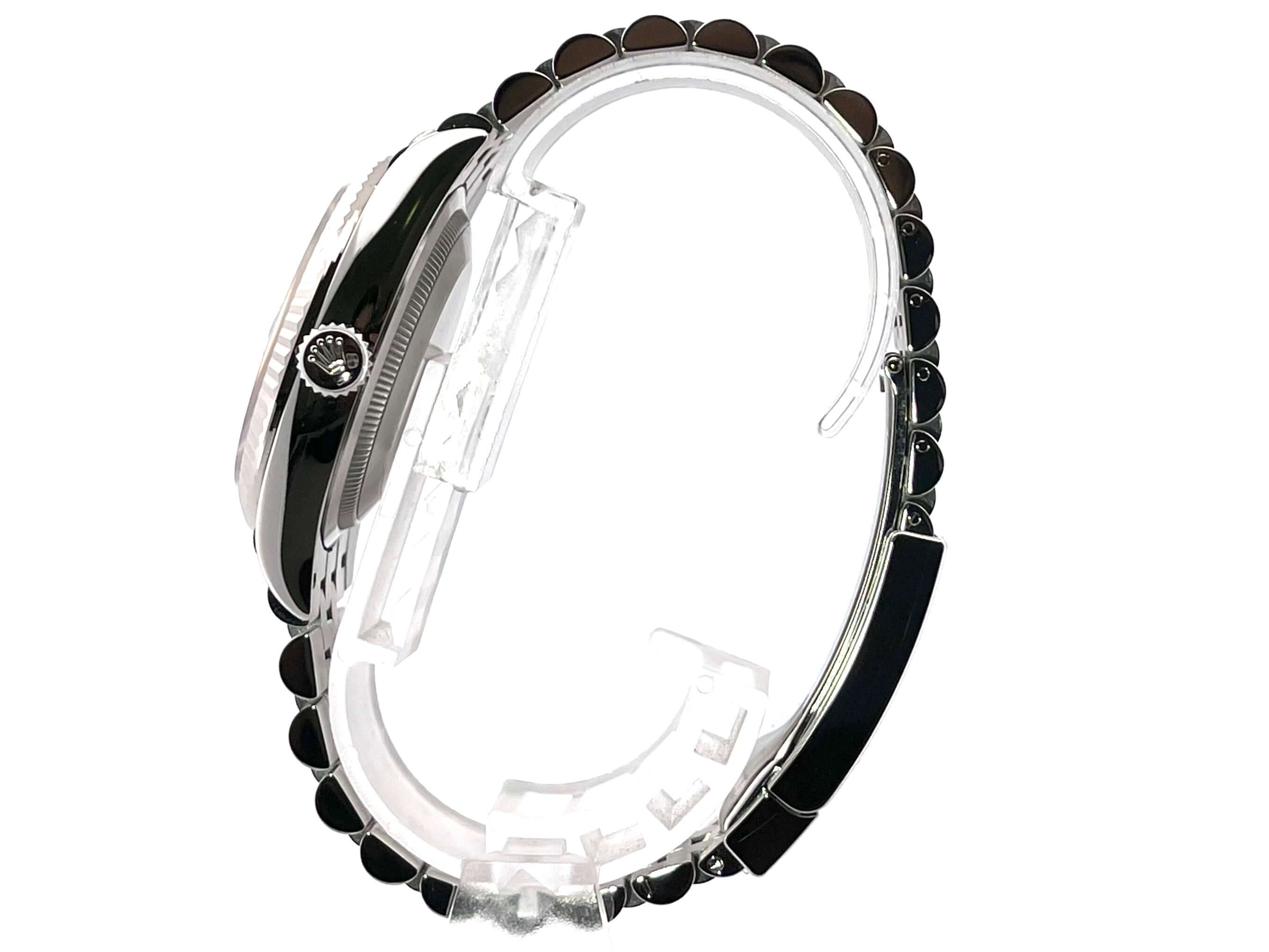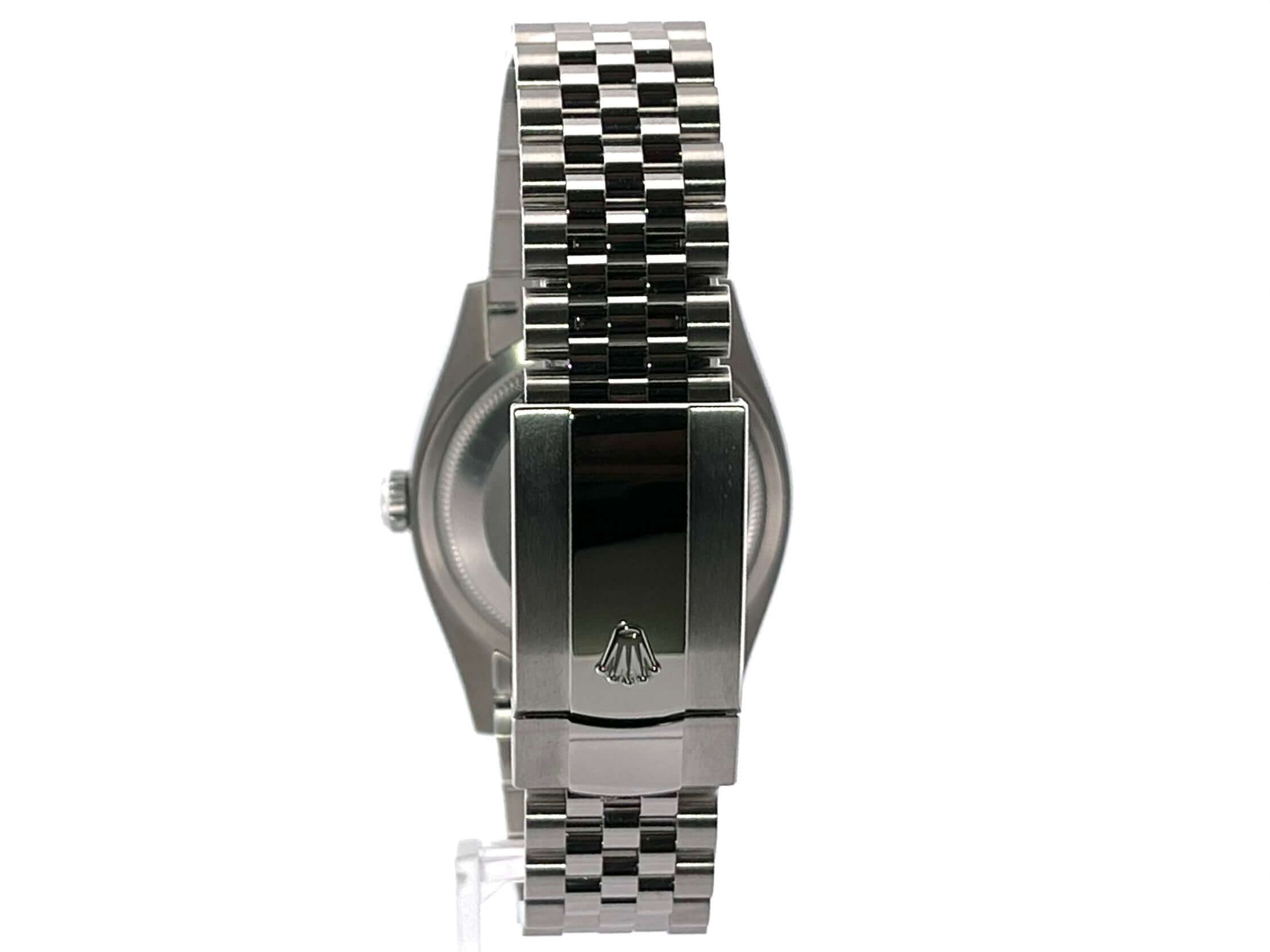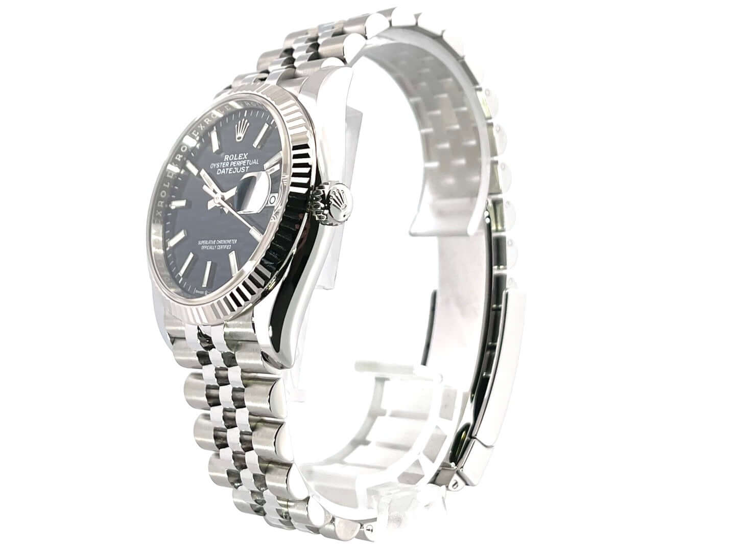 Gehäuse aus Edelstahl Oystersteel poliert und satiniert, Gehäusedurchmesser 36 mm, Lünette aus 18 kt Weißgold, Jubile-Edelstahlband mit Faltschließe, blaues Riffelmuster Zifferblatt mit aufgesetzten Leuchtindizes, Leuchtzeiger, Automatik, Rolex Manufakturkaliber 3235, 70 Stunden Gangreserve, Datumsanzeige, Chronometer, Saphirglas, verschraubte Krone, Edelstahlboden verschraubt, Wasserdicht bis 10 bar.