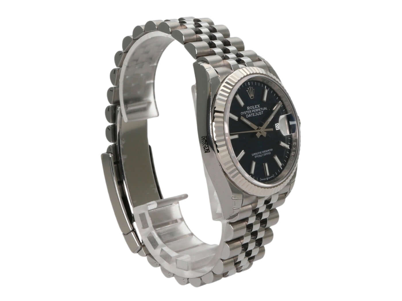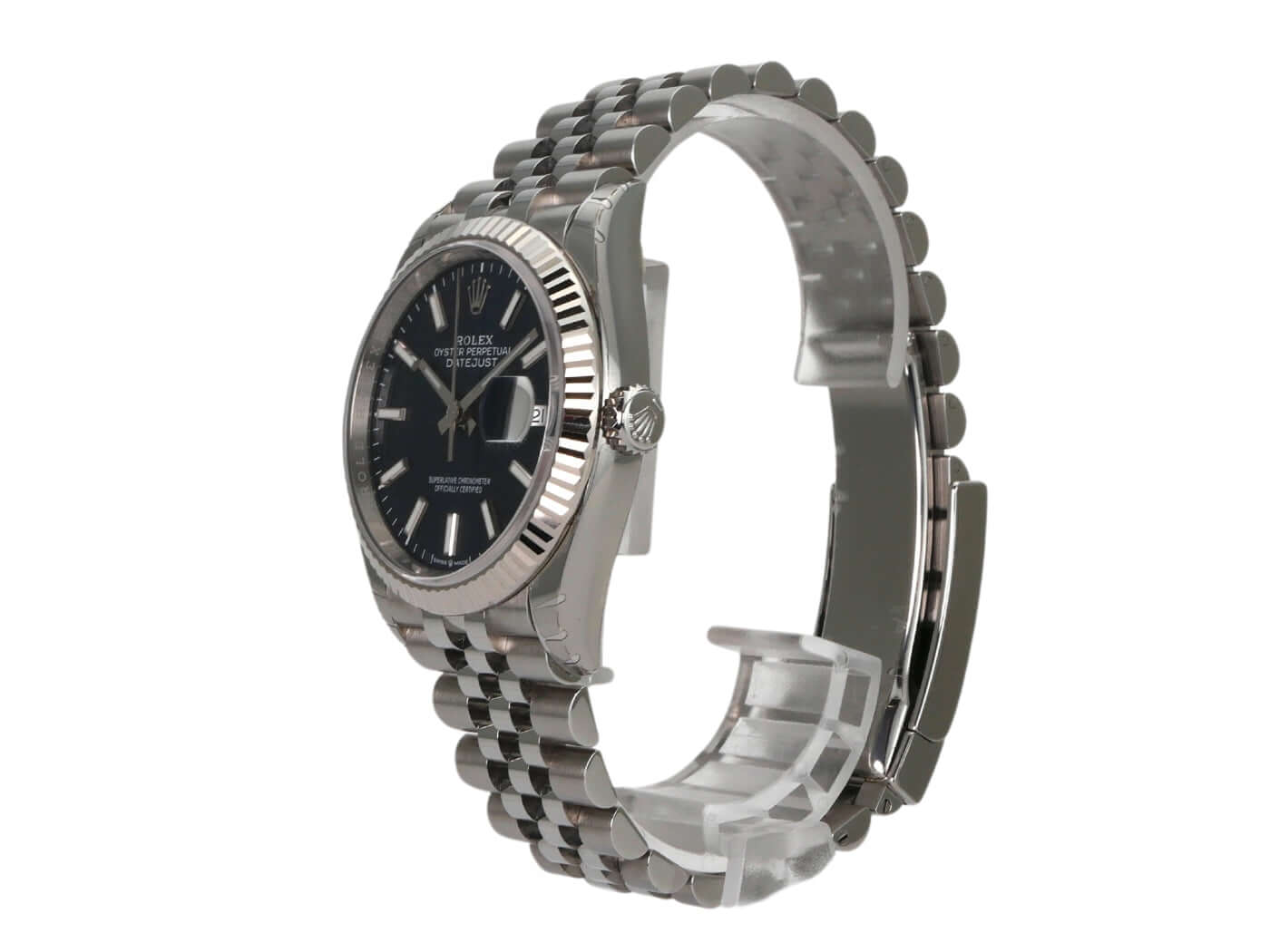 Gehäuse aus Edelstahl Oystersteel poliert und satiniert, Gehäusedurchmesser 36 mm, Lünette aus 18 kt Weißgold, Jubile-Edelstahlband mit Faltschließe, blaues Riffelmuster Zifferblatt mit aufgesetzten Leuchtindizes, Leuchtzeiger, Automatik, Rolex Manufakturkaliber 3235, 70 Stunden Gangreserve, Datumsanzeige, Chronometer, Saphirglas, verschraubte Krone, Edelstahlboden verschraubt, Wasserdicht bis 10 bar.