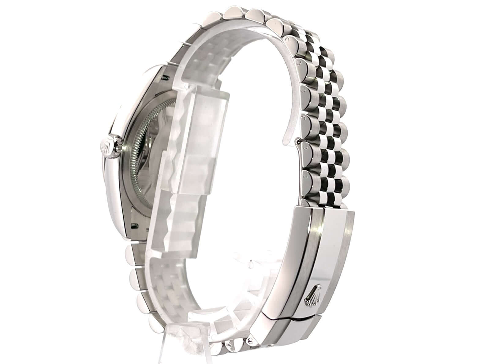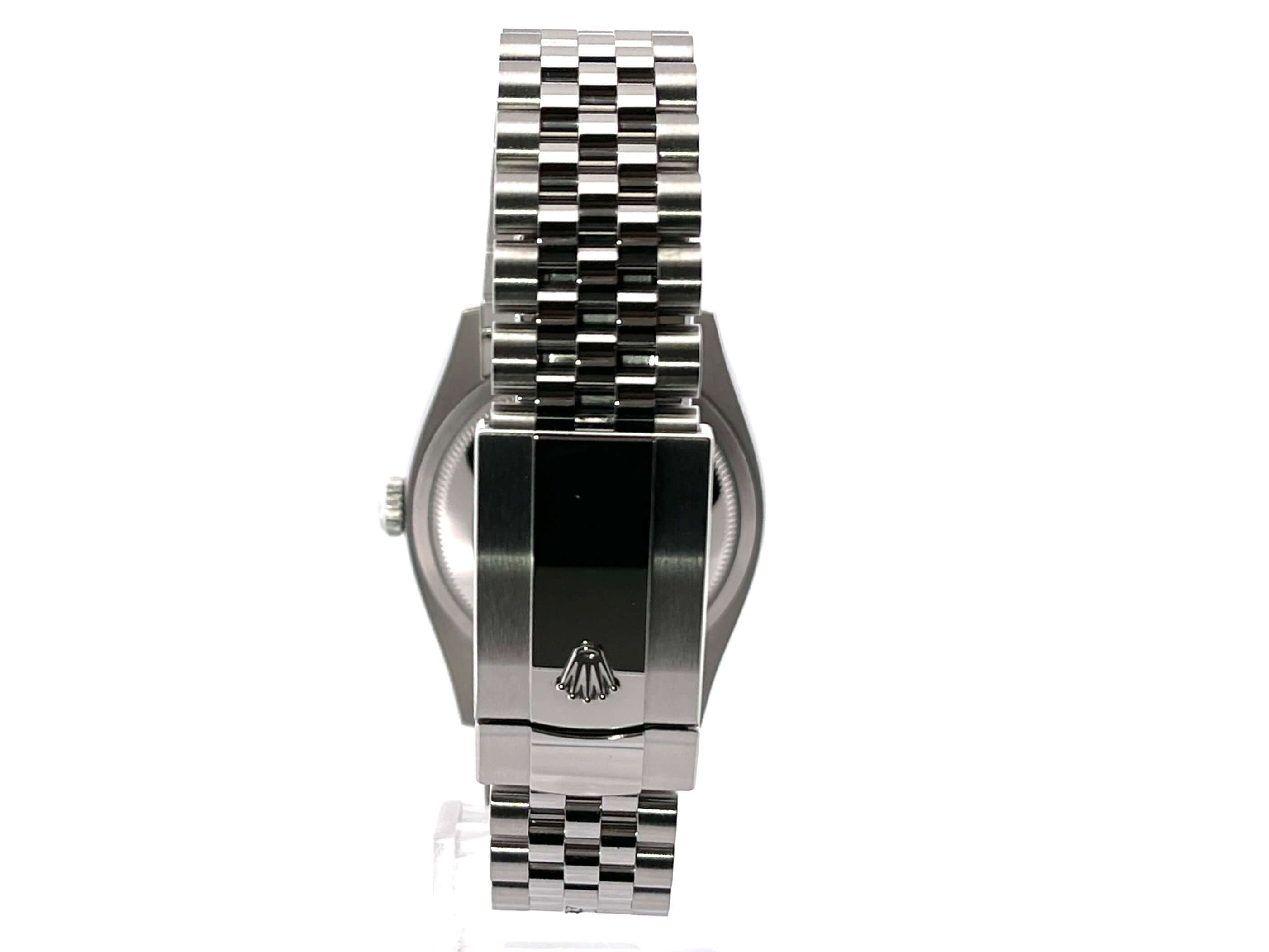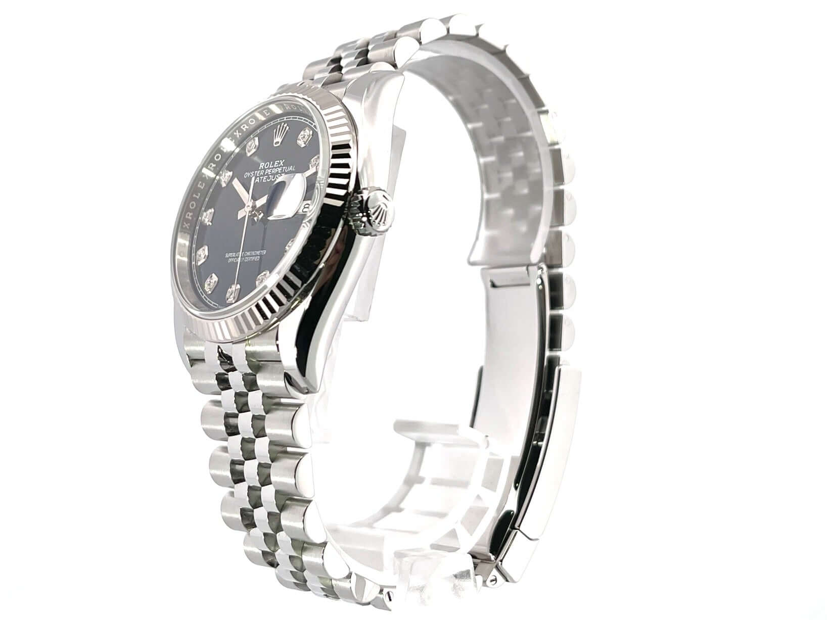 Gehäuse aus Edelstahl Oystersteel poliert und satiniert, Gehäusedurchmesser 36 mm, Lünette aus 18 kt Weißgold, Jubile-Edelstahlband mit Faltschließe, blaues Zifferblatt mit 10 aufgesetzten Diamanten, Automatik, Rolex Manufakturkaliber 3235, 70 Stunden Gangreserve, Datumsanzeige, Chronometer, Saphirglas, verschraubte Krone, Edelstahlboden verschraubt, Wasserdicht bis 10 bar.
