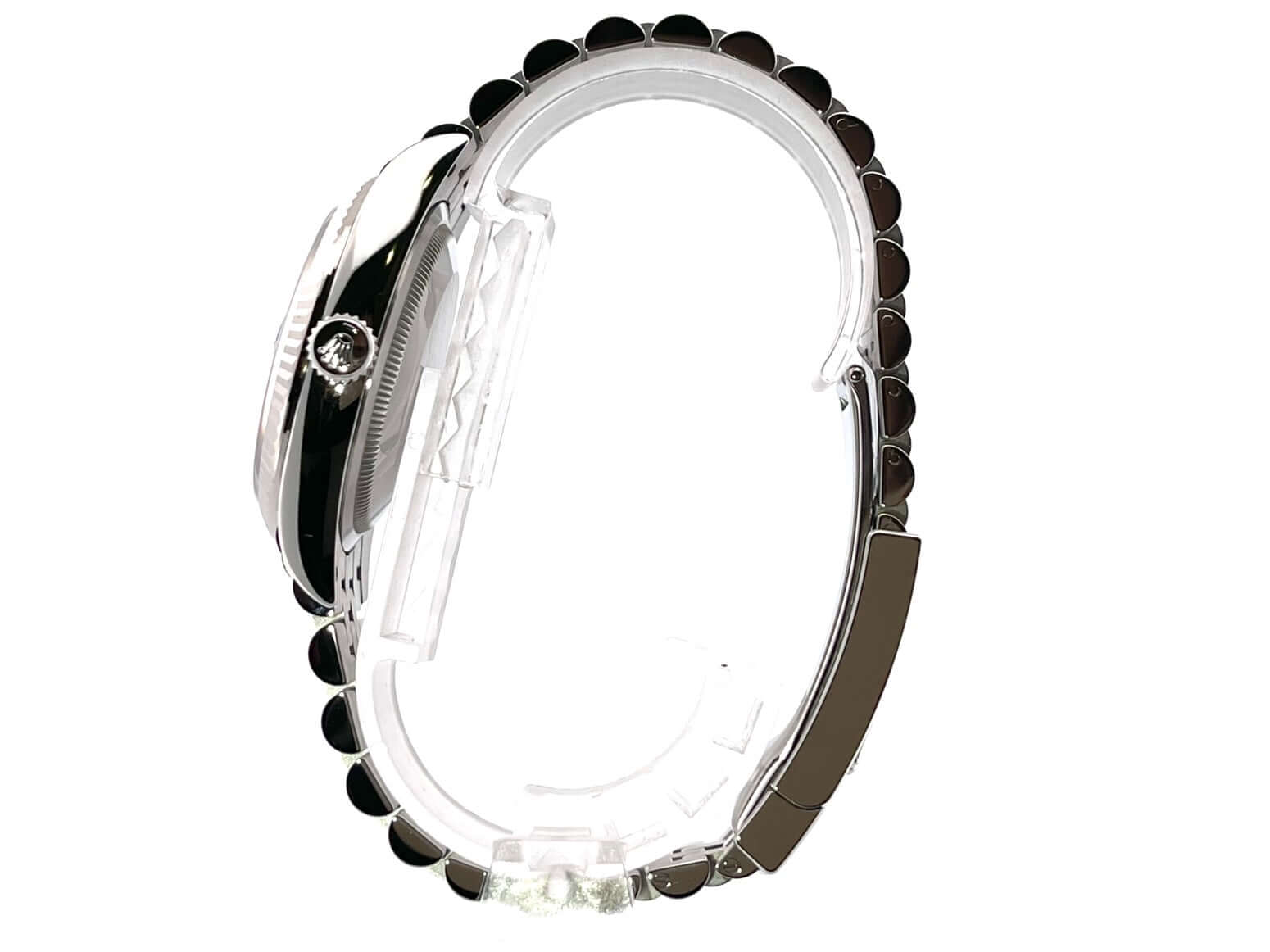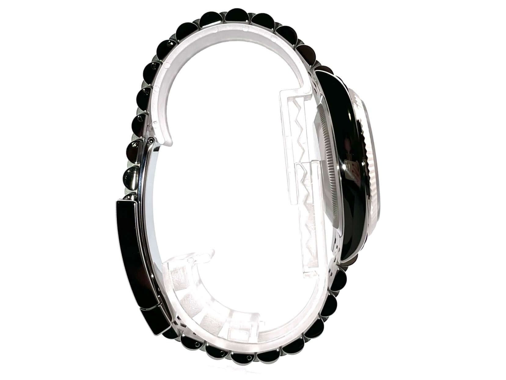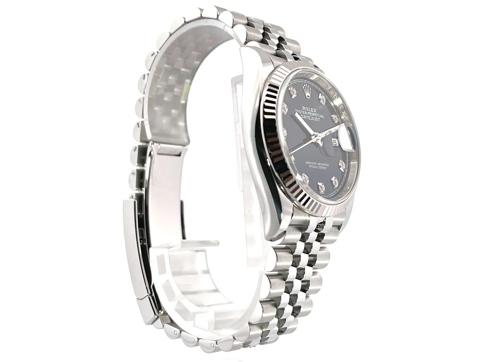 Gehäuse aus Edelstahl Oystersteel poliert und satiniert, Gehäusedurchmesser 36 mm, Lünette aus 18 kt Weißgold, Jubile-Edelstahlband mit Faltschließe, blaues Zifferblatt mit 10 aufgesetzten Diamanten, Automatik, Rolex Manufakturkaliber 3235, 70 Stunden Gangreserve, Datumsanzeige, Chronometer, Saphirglas, verschraubte Krone, Edelstahlboden verschraubt, Wasserdicht bis 10 bar.