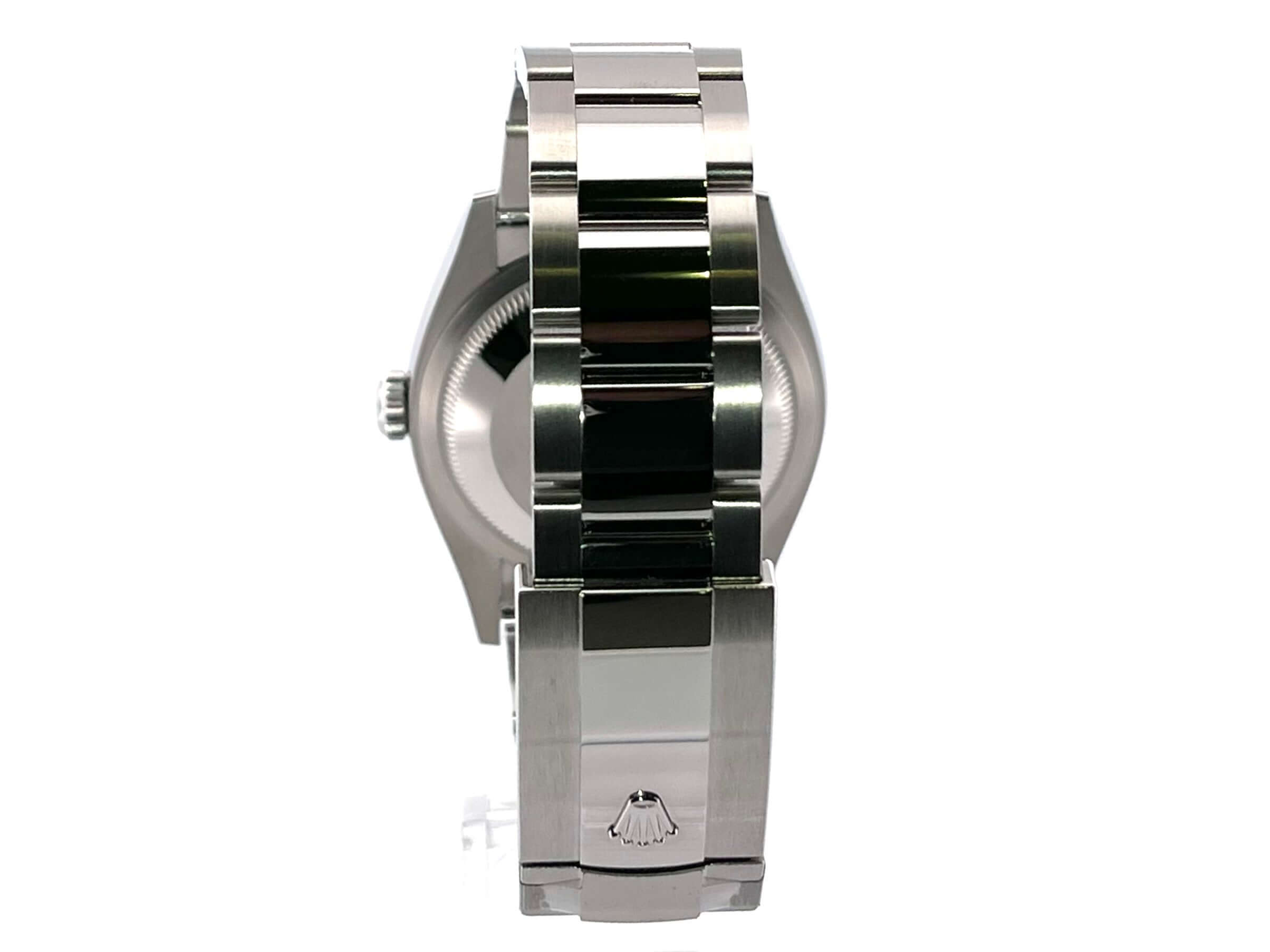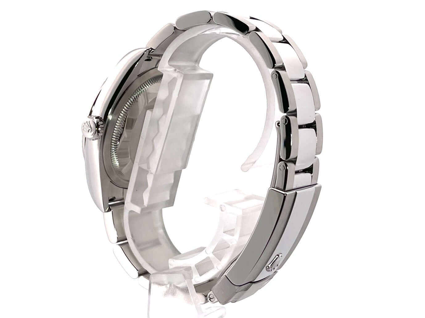 Gehäuse aus Edelstahl Oystersteel poliert und satiniert, Gehäusedurchmesser 36 mm, Lünette aus 18 kt Weißgold, schwarzes Zifferblatt mit 10 aufgesetzten Diamanten, Oyster Edelstahlband mit Faltschließe, Automatik, Rolex Manufakturkaliber 3235, 70 Stunden Gangreserve, Datumsanzeige, Chronometer, Saphirglas, verschraubte Krone, Edelstahlboden verschraubt, Wasserdicht bis 10 bar.