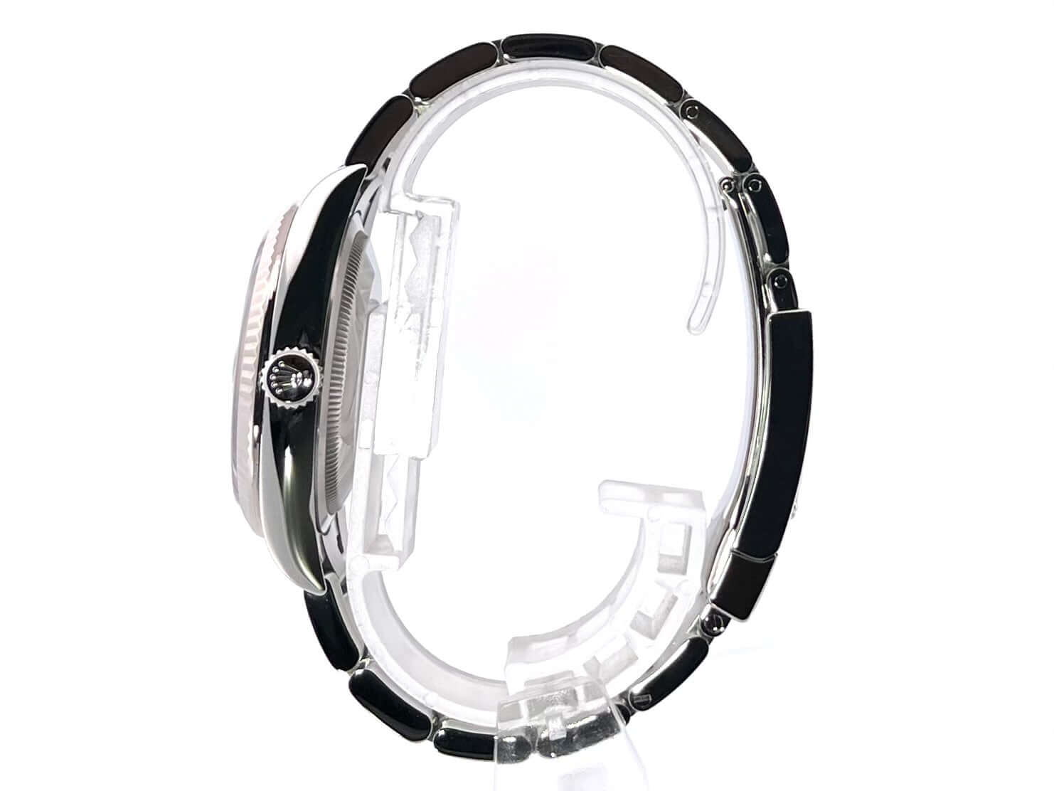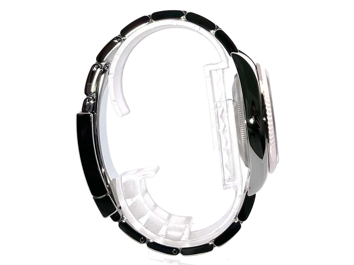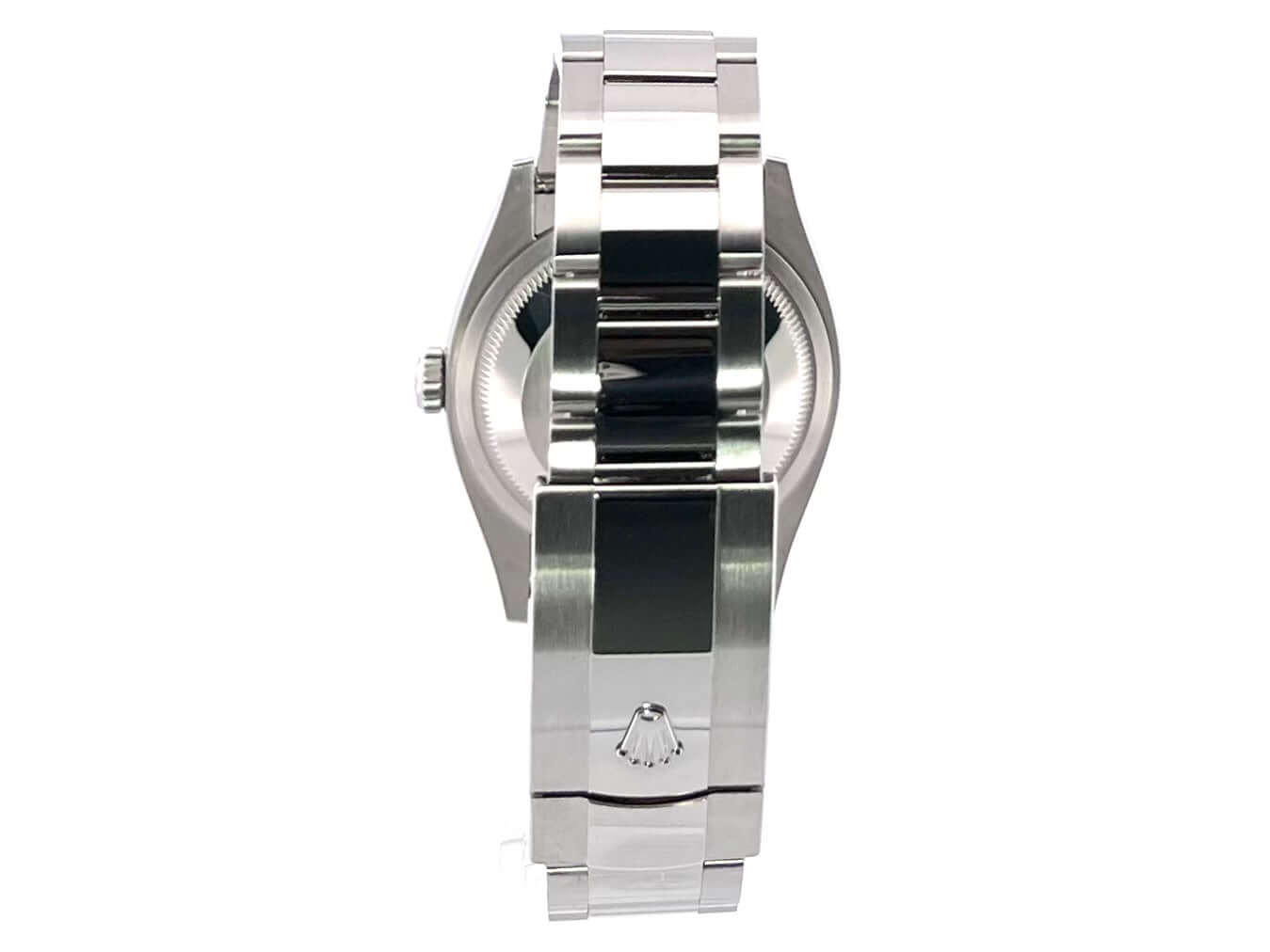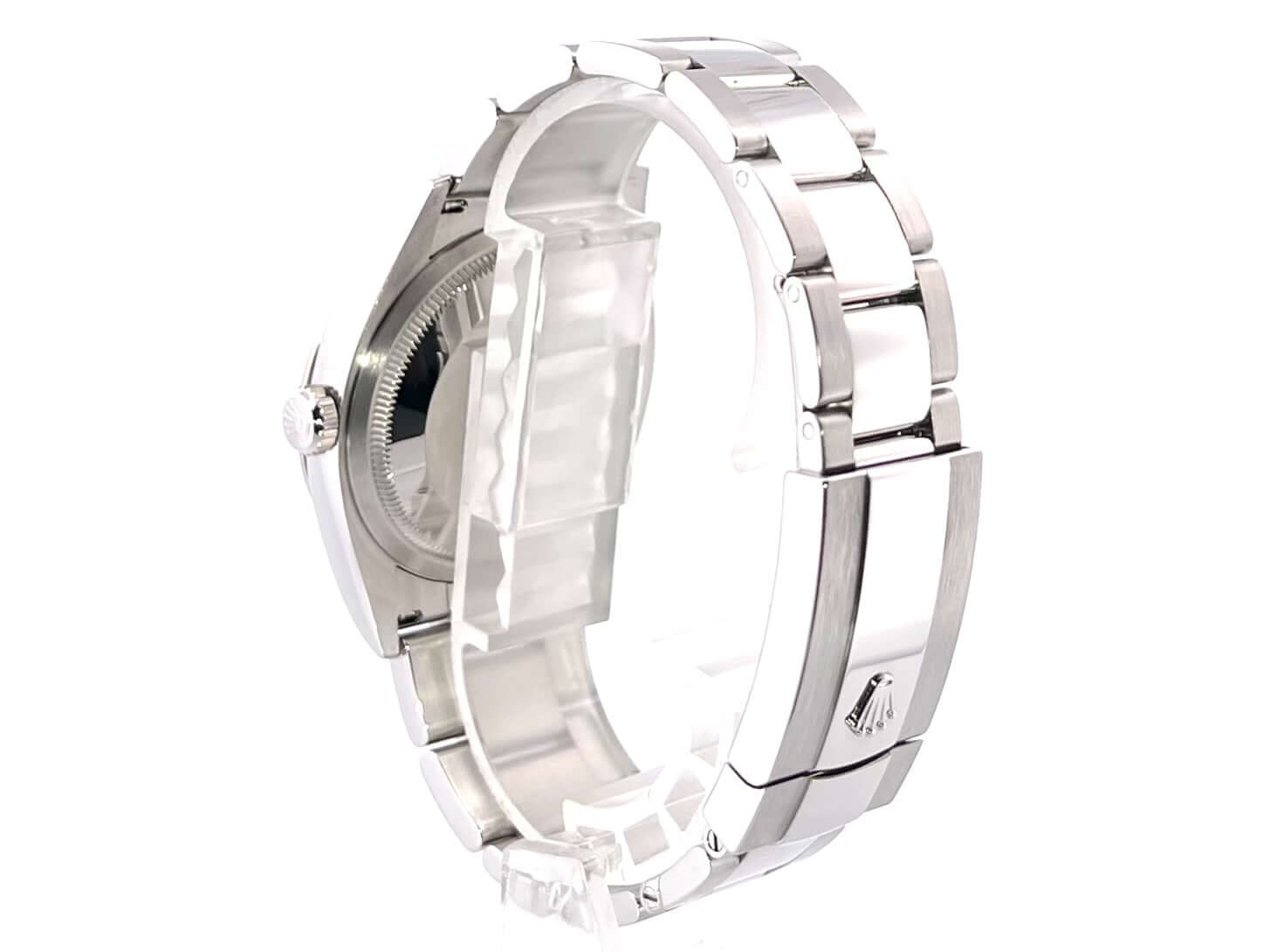 Gehäuse aus Edelstahl Oystersteel poliert und satiniert, Gehäusedurchmesser 36 mm, Lünette aus 18 kt Weißgold, Oyster-Edelstahlband mit Faltschließe, Auberginefarbenes Zifferblatt mit aufgesetzten römischen Ziffern, 24 Diamanten in der römischen VI und IX, Automatik, Rolex Manufakturkaliber 3235, 70 Stunden Gangreserve, Datumsanzeige, Chronometer, Saphirglas, verschraubte Krone, Edelstahlboden verschraubt, Wasserdicht bis 10 bar.