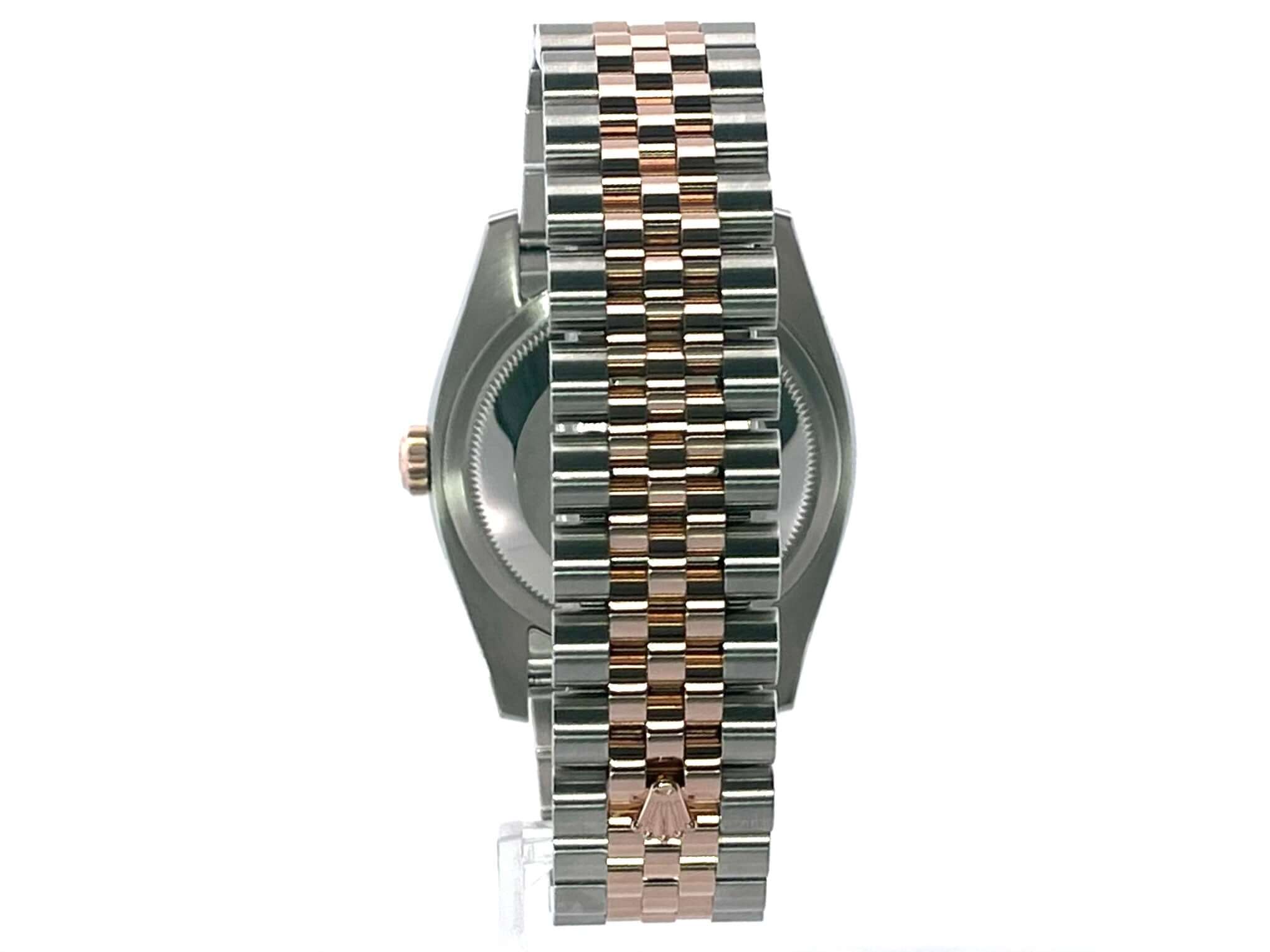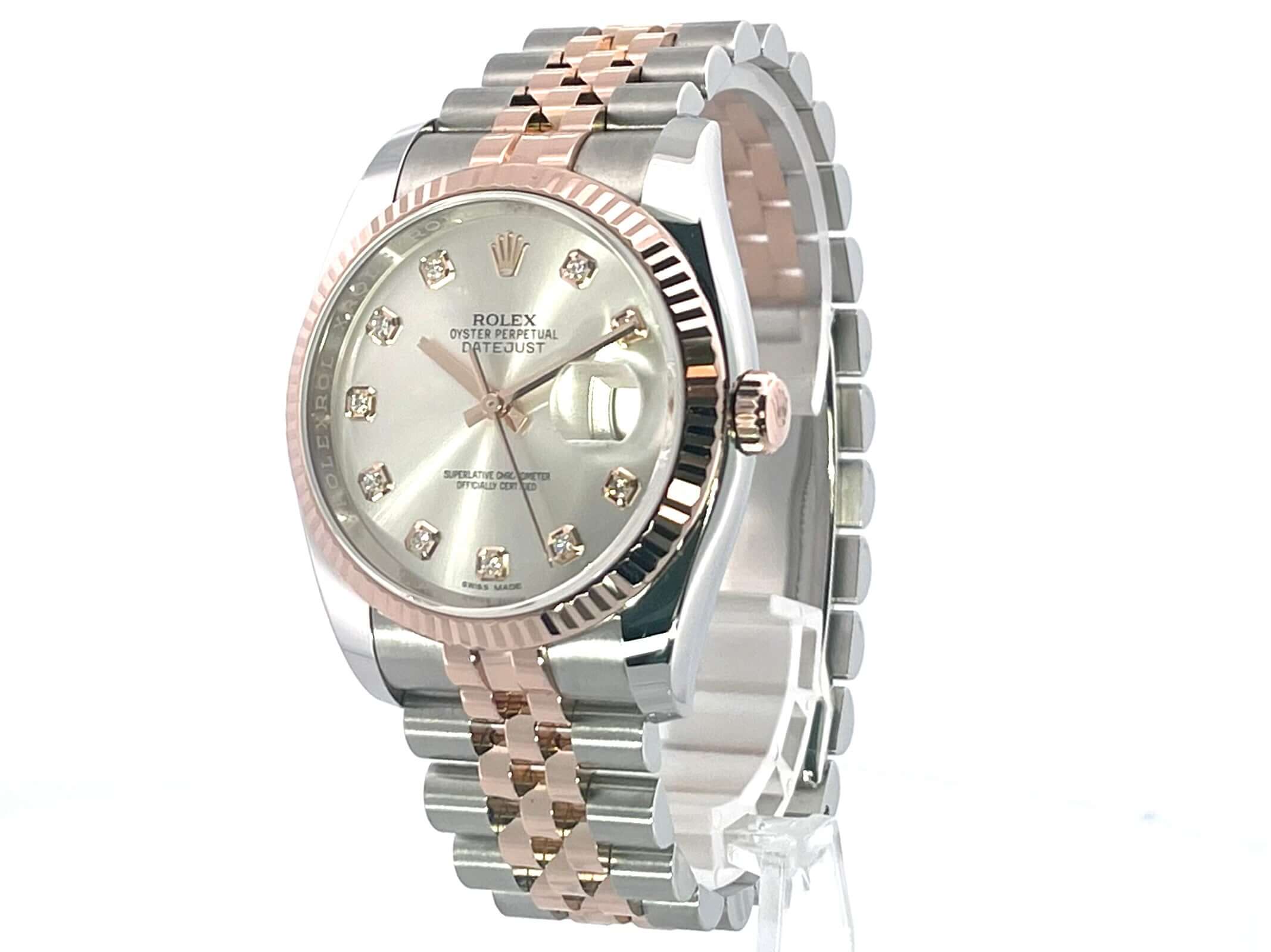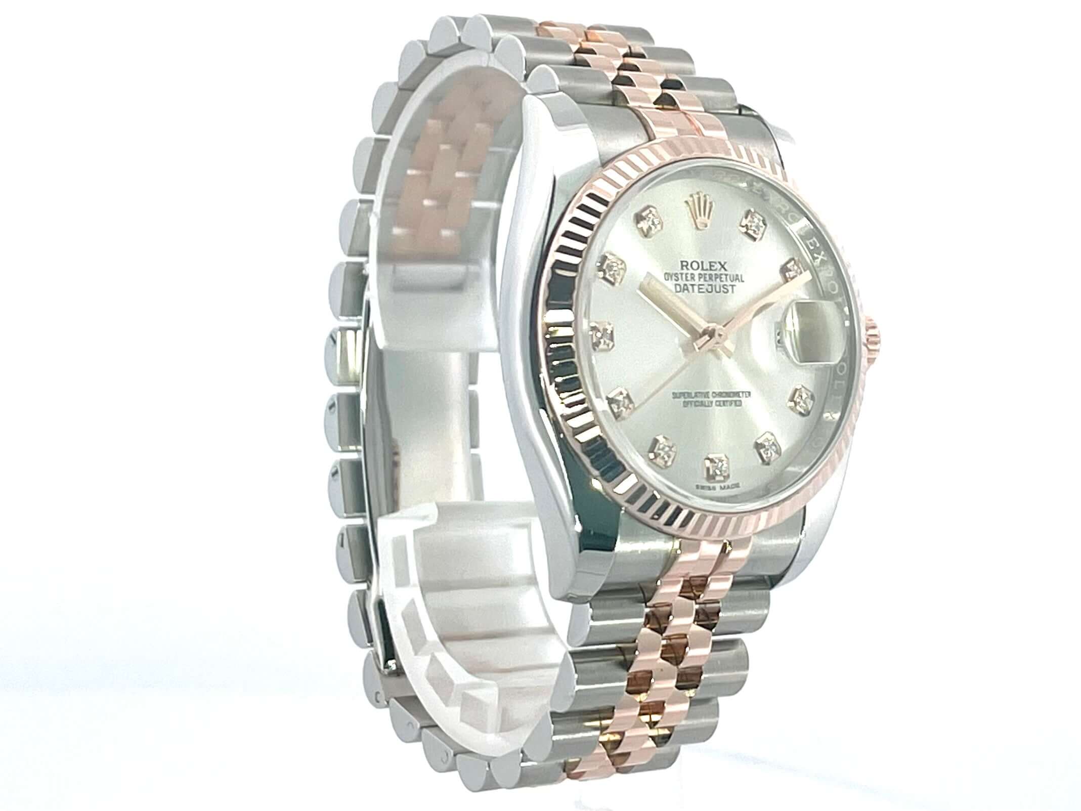 Gehäuse aus Edelstahl poliert und satiniert, Gehäusedurchmesser 36 mm, geriffelte 18 kt Everose-Gold Lünette, Jubilé Armband in Edelstahl / 18 kt Everose-Gold poliert und satiniert mit Faltschließe, silberfarbenes Zifferblatt mit 10 aufgesetzten Diamanten, roségoldene Zeiger, Automatikwerk, Chronometer, Rolex Manufakturkaliber 3135 mit 31 Steine, 28.800 A/h, Datumsanzeige, kratzfestes Saphirglas, verschraubbare Krone 18 kt Everose-Gold, Edelstahlboden verschraubt, Wasserdicht bis zu 10 bar.