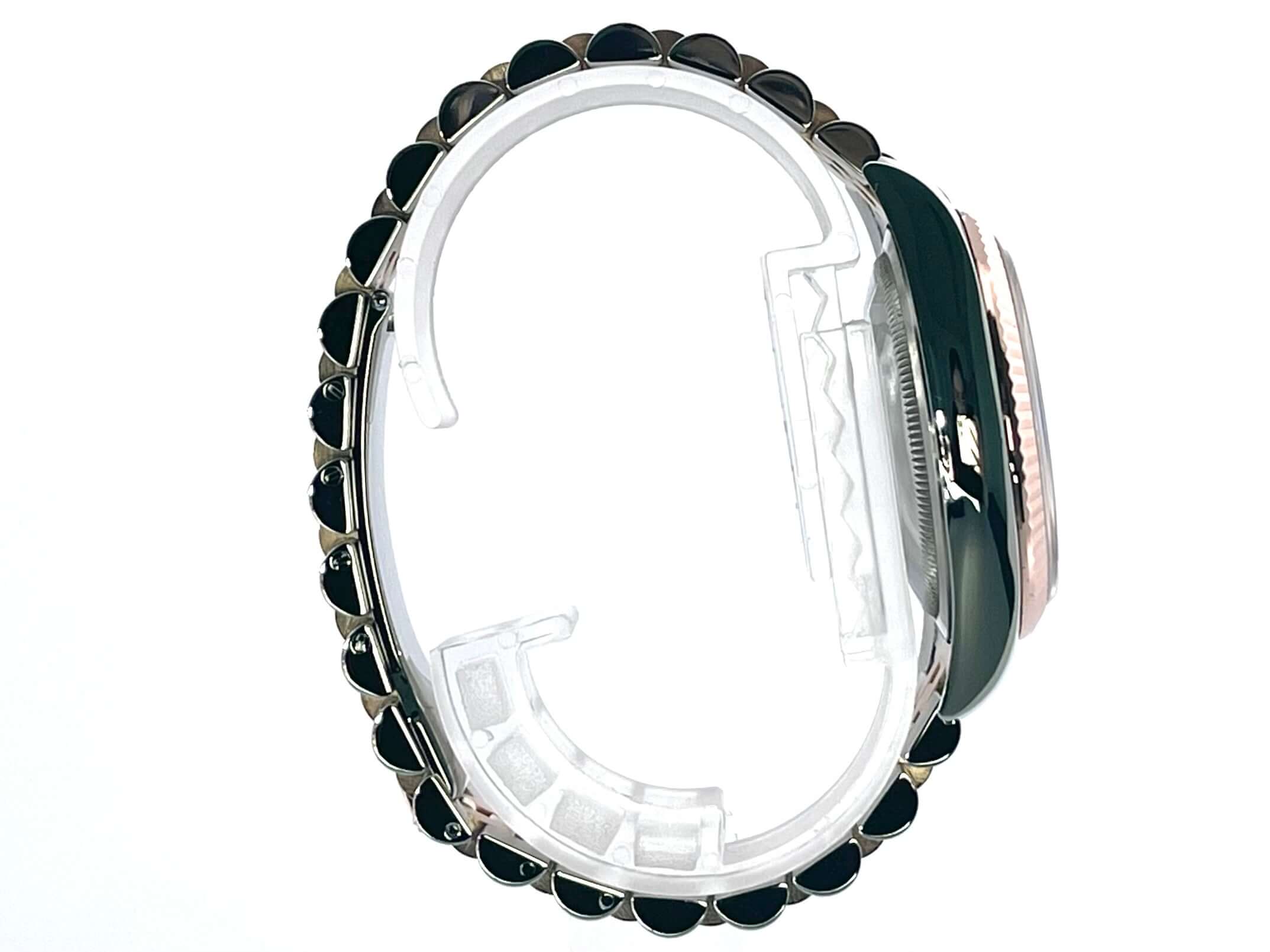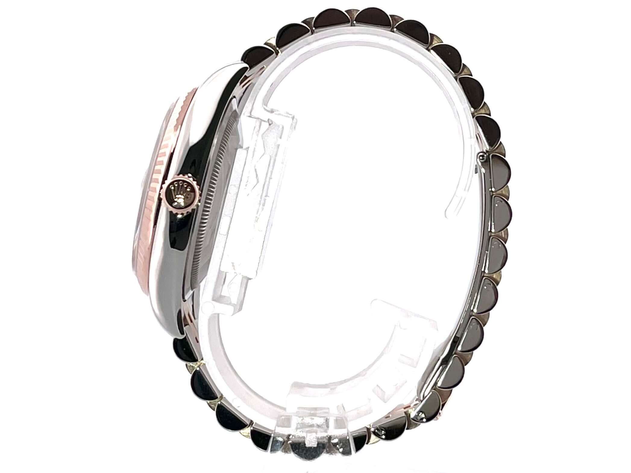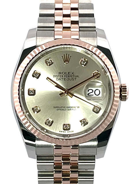 Gehäuse aus Edelstahl poliert und satiniert, Gehäusedurchmesser 36 mm, geriffelte 18 kt Everose-Gold Lünette, Jubilé Armband in Edelstahl / 18 kt Everose-Gold poliert und satiniert mit Faltschließe, silberfarbenes Zifferblatt mit 10 aufgesetzten Diamanten, roségoldene Zeiger, Automatikwerk, Chronometer, Rolex Manufakturkaliber 3135 mit 31 Steine, 28.800 A/h, Datumsanzeige, kratzfestes Saphirglas, verschraubbare Krone 18 kt Everose-Gold, Edelstahlboden verschraubt, Wasserdicht bis zu 10 bar.