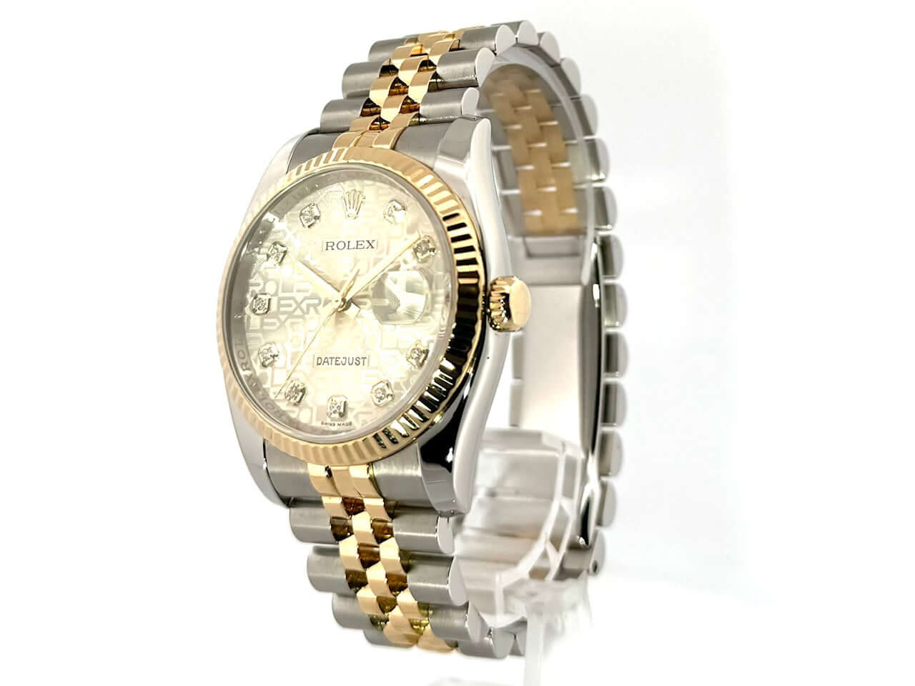 Gehäuse Edelstahl poliert und satiniert, Gehäusedurchmesser 36 mm, Gehäusehöhe 11,4 mm, 18 kt Gelbgold Lünette geriffelt, Jubilé Edelstahl / 18 kt Gelbgold Armband poliert und satiniert mit Faltschließe, silberfarbenes Jubilé Zifferblatt mit 10 aufgesetzten Diamanten, goldene Zeiger, Automatikwerk, Chronometer mit C.O.S.C. Zertifikat, Rolex Manufakturkaliber 3135 mit 31 Steine, Schwingung 28.800 A/h, Datumsanzeige, kratzfestes Saphirglas, Krone aus 18 kt Gelbgold verschraubbar, verschraubter Edelstahlboden, Wasserdicht bis 10 bar.