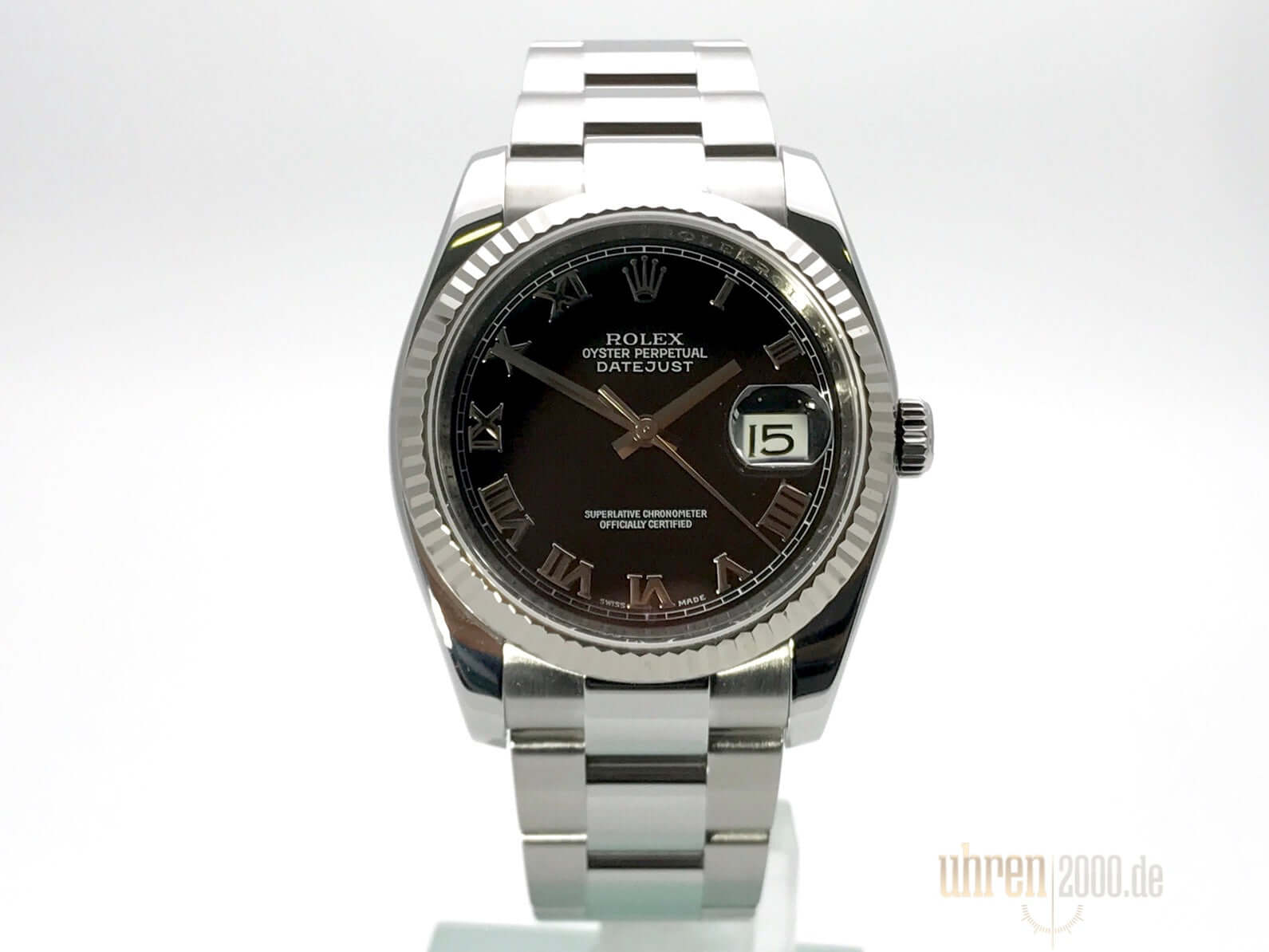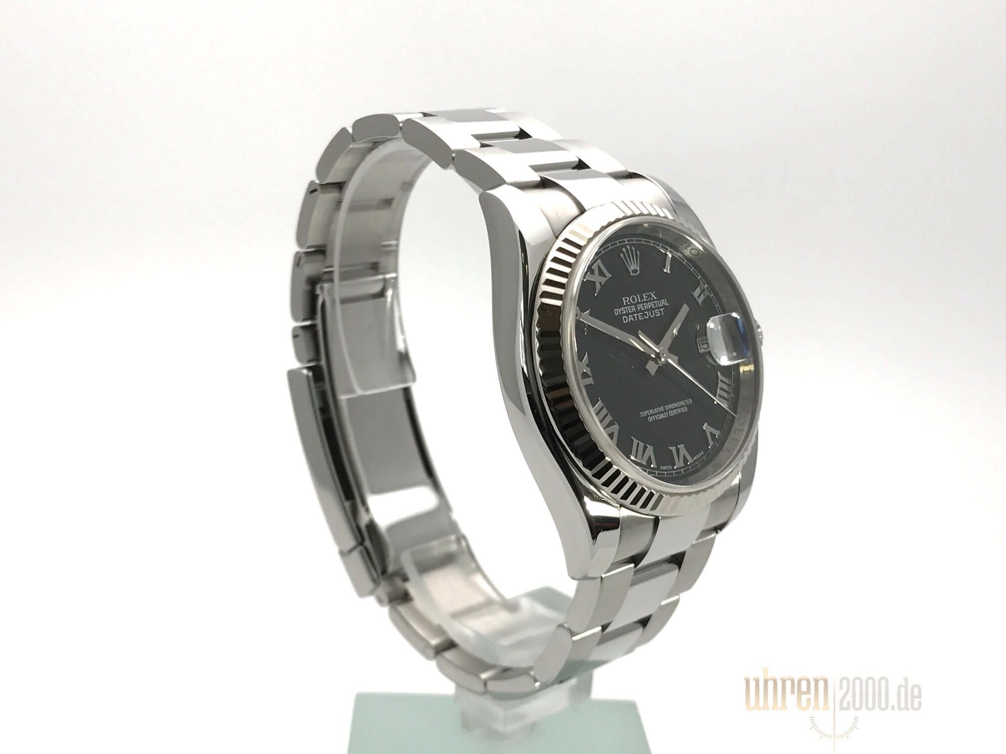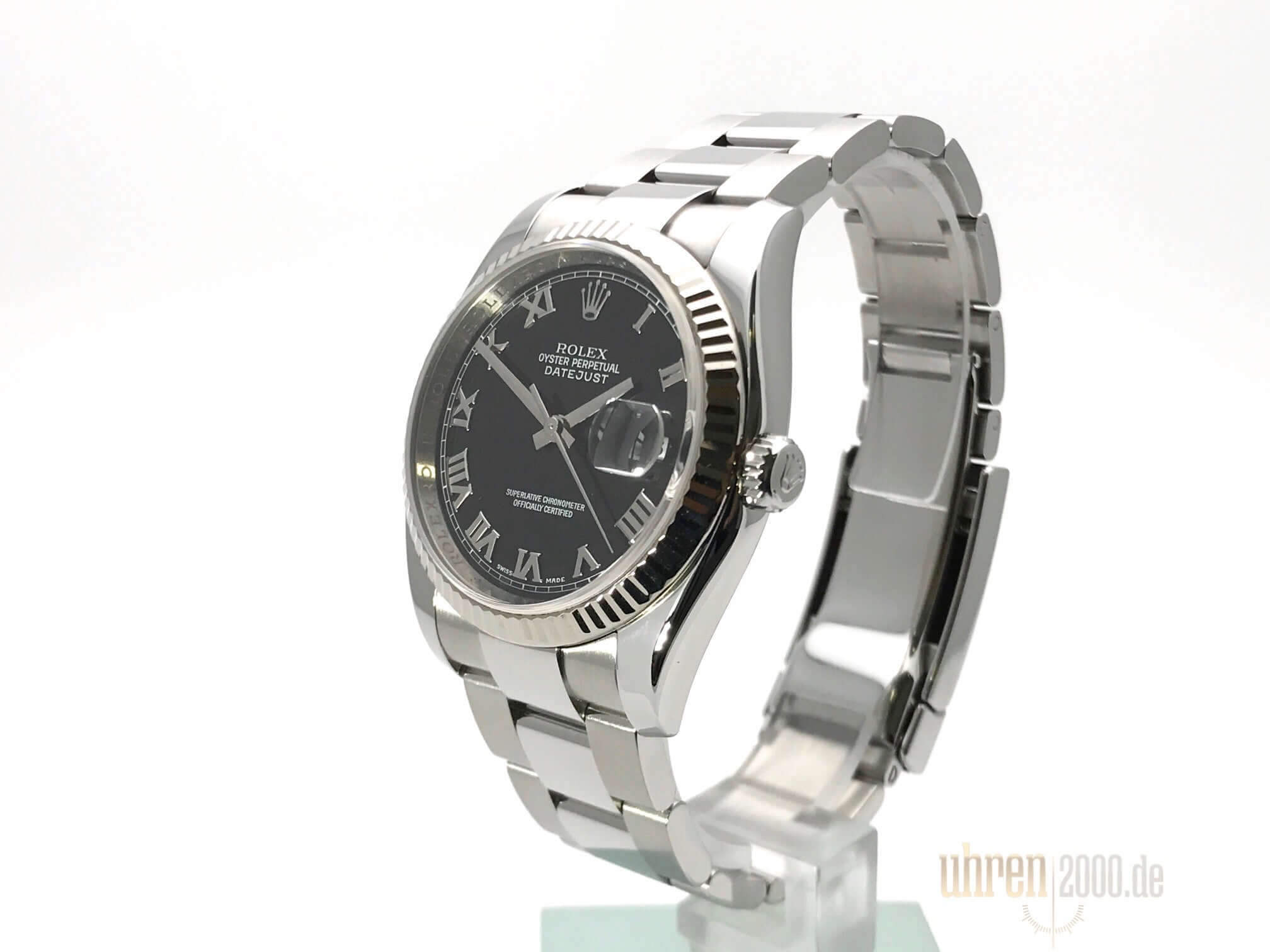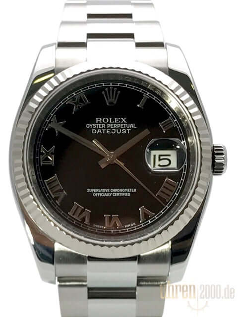 Gehäuse aus Edelstahl poliert und satiniert, Gehäusedurchmesser 36 mm, Gehäusehöhe 11,7 mm, 18 kt Weißgold Lünette geriffelt, Oyster Edelstahlband poliert und satiniert mt Sicherheitsfaltschließe, schwarzes Zifferblatt mit aufgesetzten römischen Ziffern, Uhrwerk Automatik, Chronometer, Rolex Manufakturkaliber 3135 mit 31 Steine, 28.800 A/h, Datumsanzeige, Saphirglas kratzfest, Krone verschraubt, Edelstahlboden verschraubt, Wasserdicht bis zu 10 bar.