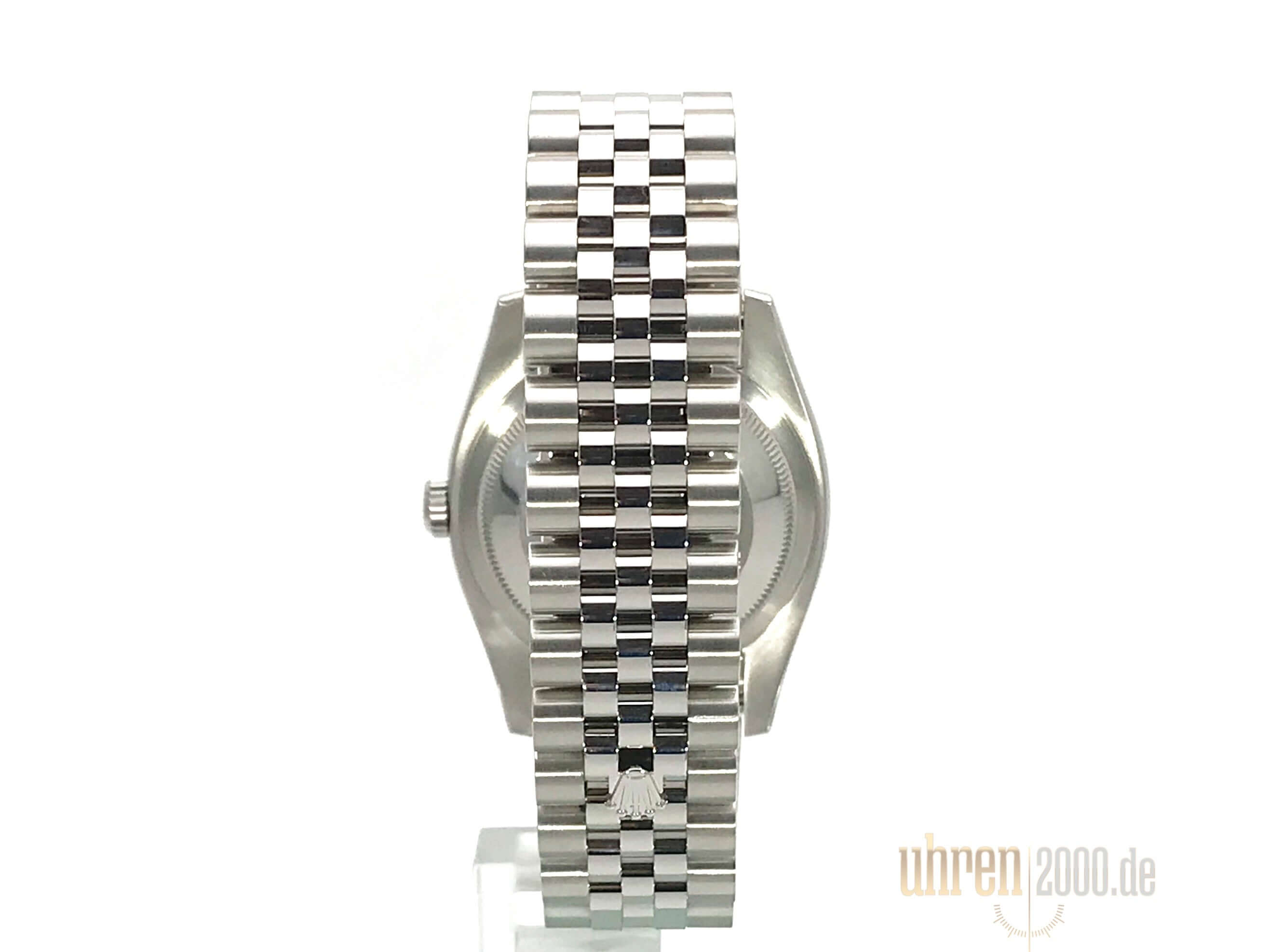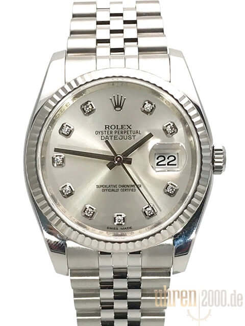 Gehäuse aus Edelstahl poliert und satiniert, Gehäusedurchmesser 36 mm, Gehäusehöhe 11,7 mm, Lünette aus 18 kt Weißgold geriffelt, Jubilé Edelstahlband poliert und satiniert mit Faltschließe, silberfarbenes Zifferblatt mit 10 aufgesetzten Diamanten, Automatik, Rolex Manufakturkaliber 3135 mit 31 Steine, 28.800 A/h, Datumsanzeige, Chronometer, Saphirglas kratzfest, Krone verschraubbar, Edelstahlboden verschraubt, Wasserdicht bis zu 10 bar.