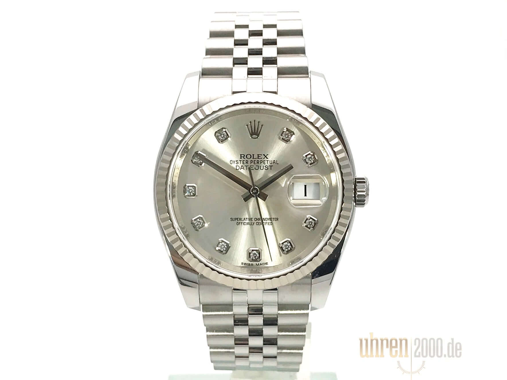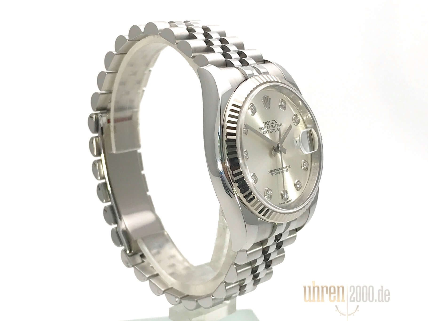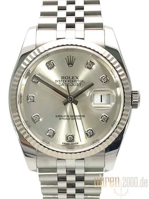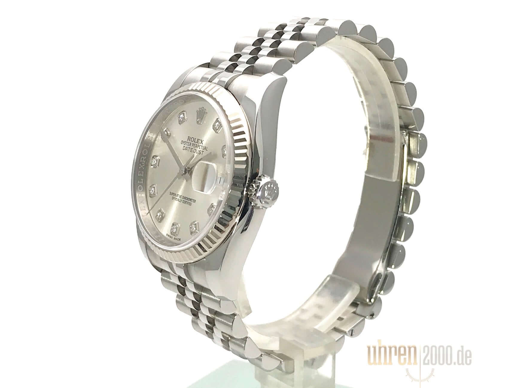 Gehäuse aus Edelstahl poliert und satiniert, Gehäusedurchmesser 36 mm, Gehäusehöhe 11,7 mm, Lünette aus 18 kt Weißgold geriffelt, Jubilé Edelstahlband poliert und satiniert mit Faltschließe, silberfarbenes Zifferblatt mit 10 aufgesetzten Diamanten, Automatik, Rolex Manufakturkaliber 3135 mit 31 Steine, 28.800 A/h, Datumsanzeige, Chronometer, Saphirglas kratzfest, Krone verschraubbar, Edelstahlboden verschraubt, Wasserdicht bis zu 10 bar.