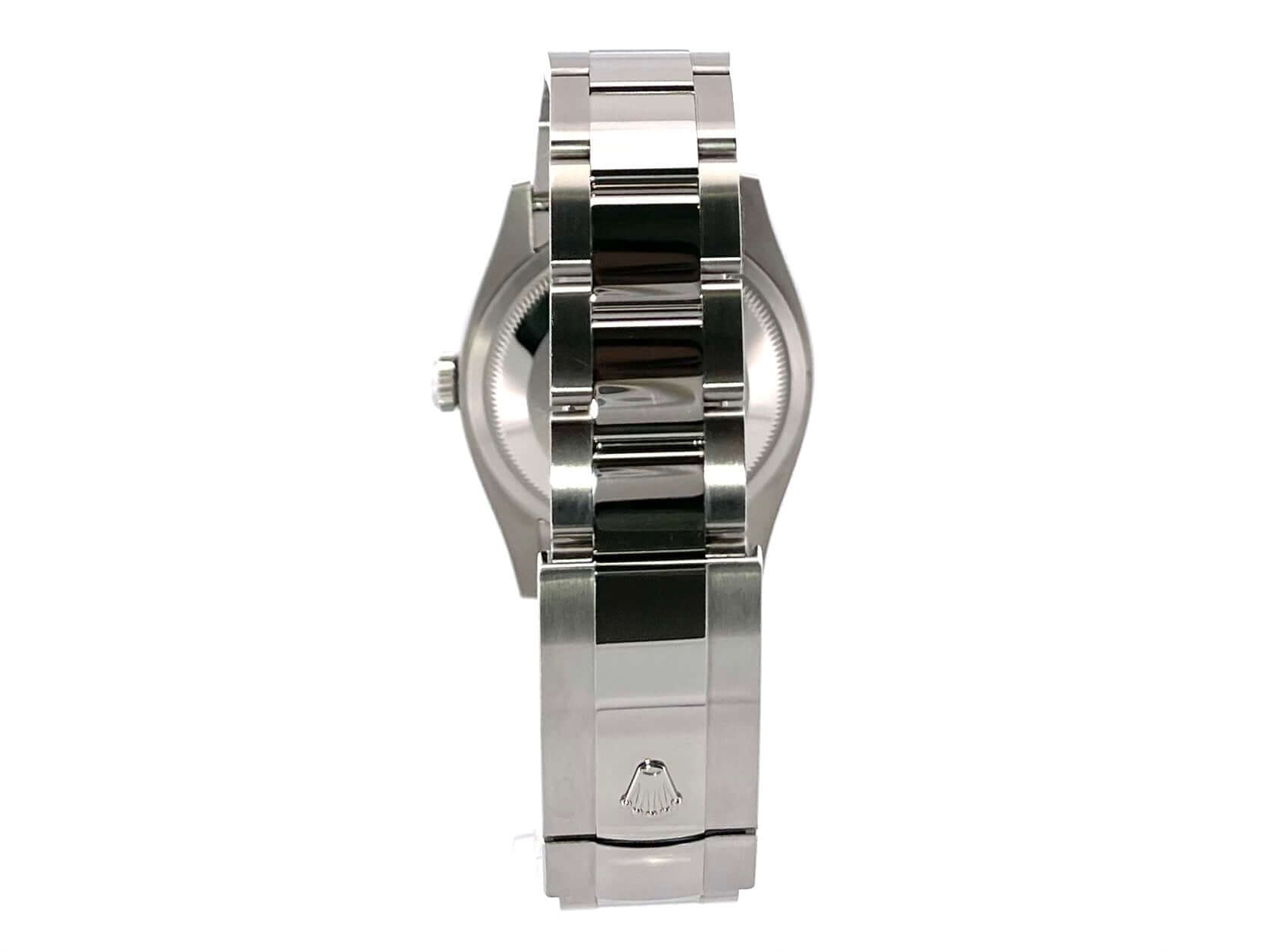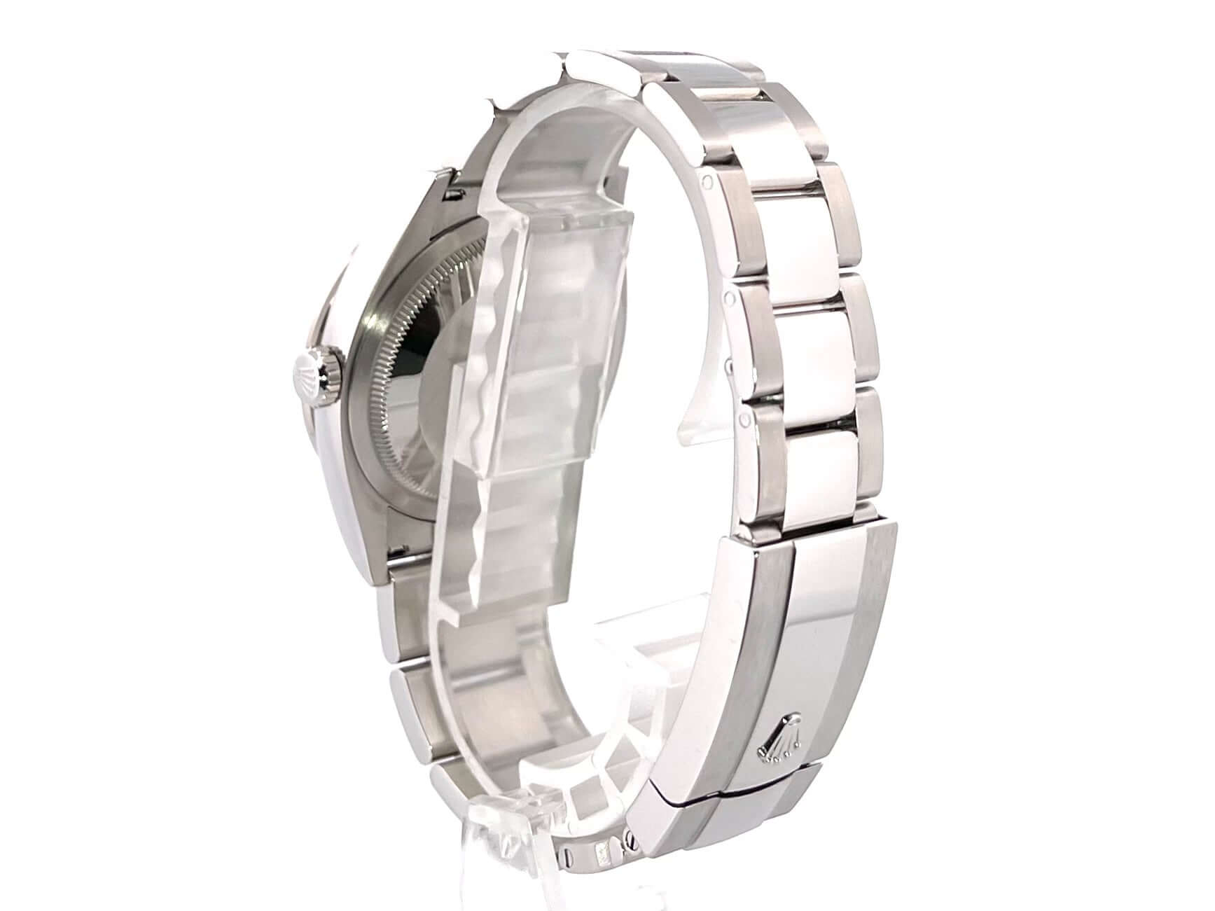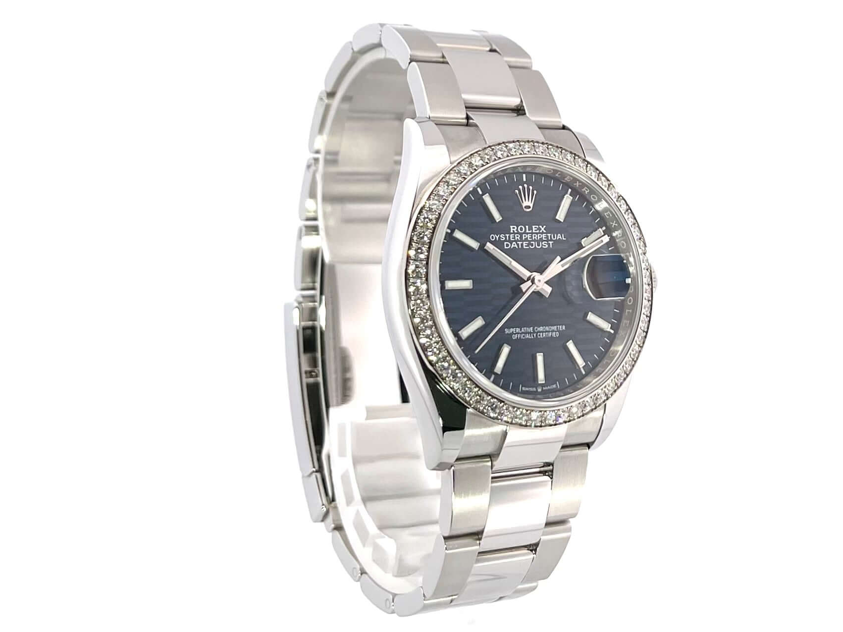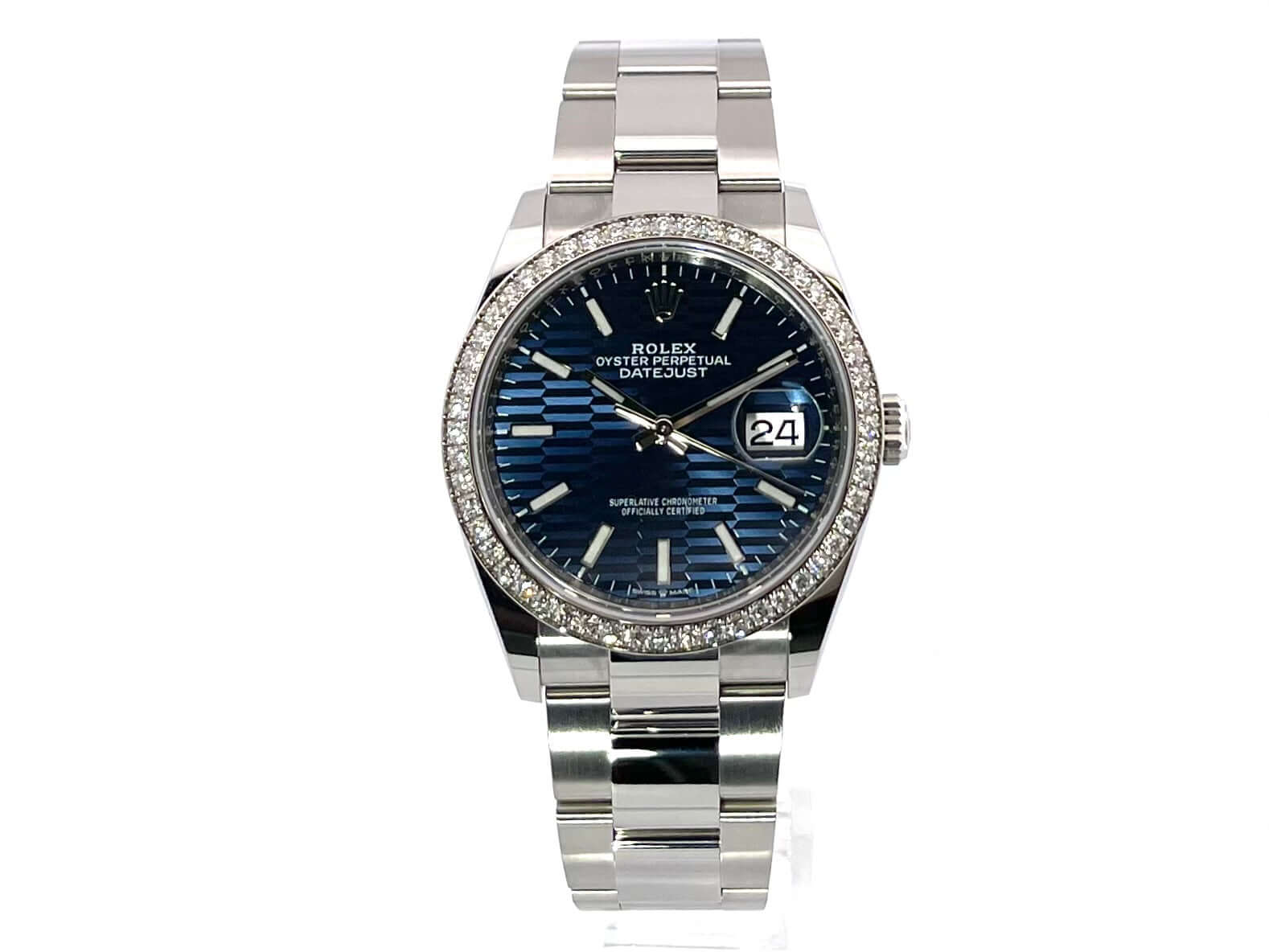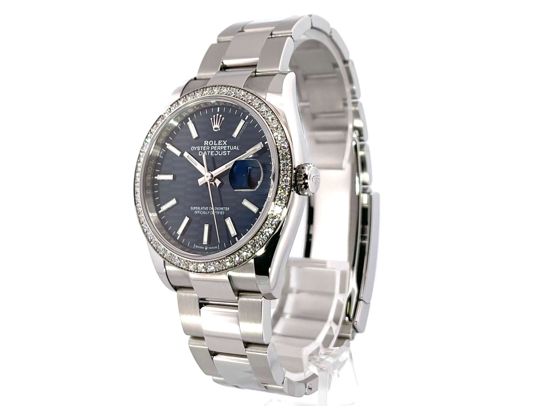 Gehäuse aus Edelstahl Oystersteel poliert und satiniert, Gehäusedurchmesser 36 mm, Lünette aus 18 kt Weißgold mit Diamanten besetzt, blaues Riffelmuster Zifferblatt, Oyster-Edelstahlband mit Faltschließe, Automatik, Rolex Manufakturkaliber 3235, 70 Stunden Gangreserve, Datumsanzeige, Chronometer, Saphirglas, verschraubte Krone, Edelstahlboden verschraubt, Wasserdicht bis 10 bar.