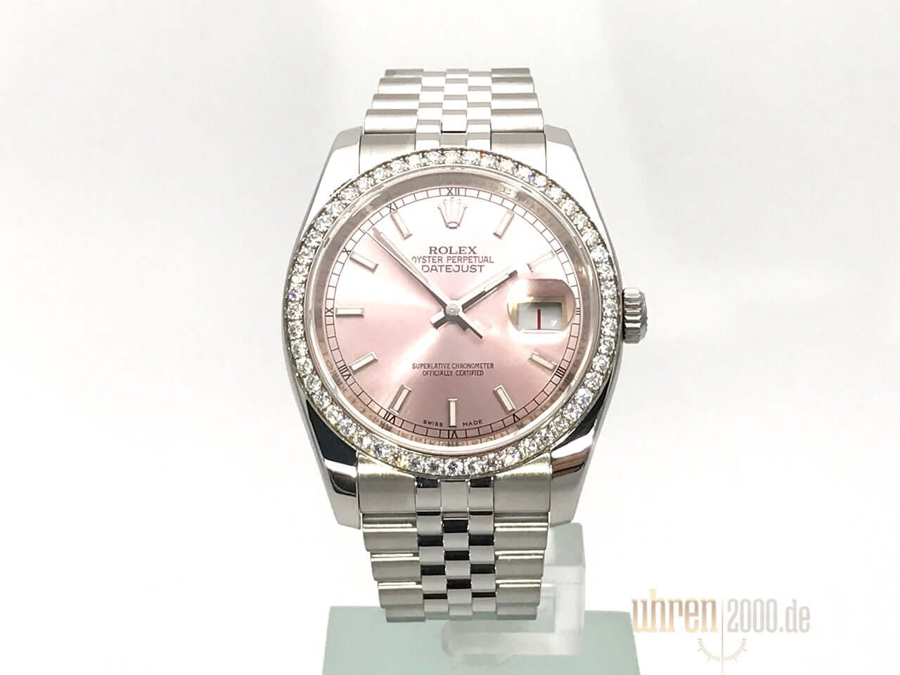 Gehäuse aus Edelstahl poliert und satiniert, Gehäusedurchmesser 36 mm, Gehäusehöhe ca.11,5 mm, Lünette aus 18 kt Weißgold mit 52 Diamanten, Jubilé Edelstahlband poliert und satiniert mit Faltschließe, pinkfarbenes Zifferblatt mit aufgesetzten Leuchtindizes, Leuchtzeiger, Automatikwerk, Rolex Manufakturkaliber 3135 mit 31 Steine, Schwingung 28.800 A/h, Gangreserve ca. 48 Stunden, Datum, Chronometer, kratzfestes Saphirglas, verschraubte Krone, verschraubter Edelstahlboden, Wasserdicht bis zu 10 bar.