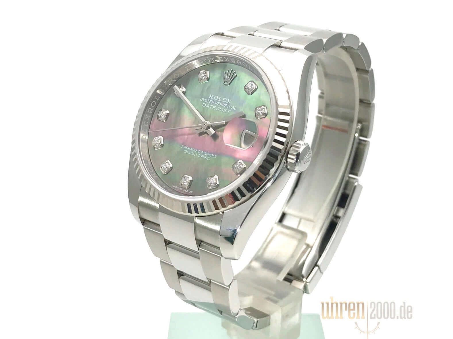 Gehäuse aus Edelstahl poliert und satiniert, Gehäusedurchmesser 36 mm, Gehäusehöhe 11,7 mm, Lünette aus 18kt Weißgold geriffelt, Oyster Edelstahl Armband poliert und satiniert mit Faltschließe, schwarzes Perlmutt Zifferblatt mit 10 aufgesetzten Diamanten, Automatik Uhrwerk, Chronometer, Rolex Manufakturkaliber 3135 mit 31 Steine, 28.800 A/h, Datumsanzeige, Saphirglas kratzfest, Krone verschraubbar, Edelstahlboden verschraubt, Wasserdicht bis zu 10 bar.