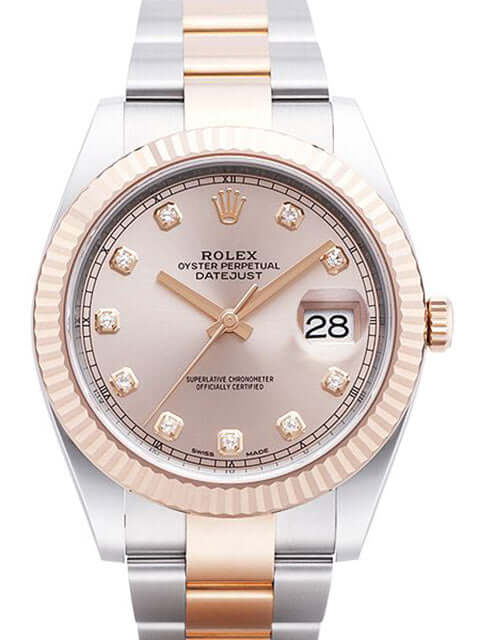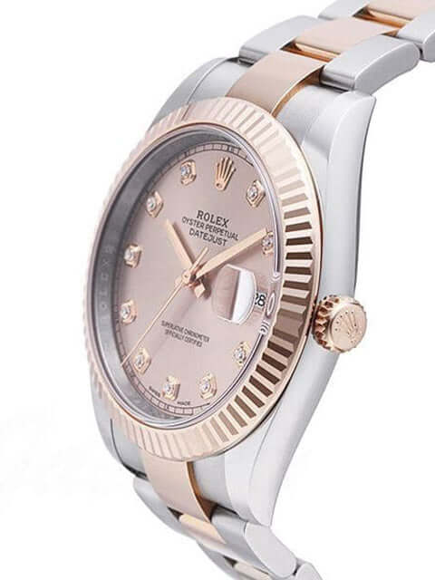 Gehäuse aus Edelstahl / Everose-Gold poliert und satiniert, Gehäusedurchmesser 41 mm, geriffelte 18 kt Everose-Gold Lünette, Oyster Armband aus Edelstahl / 18 kt Everose-Gold poliert und satiniert mit Faltschließe, Sundust Diamantzifferblatt, Automatikwerk, Rolex Manufakturkaliber 3235, 70 Stunden Gangreserve, Datumsanzeige, Chronometer, kratzfestes Saphirglas, verschraubte 18 kt Everose-Gold Krone, Edelstahlboden verschraubt, Wasserdicht bis zu 10 bar.