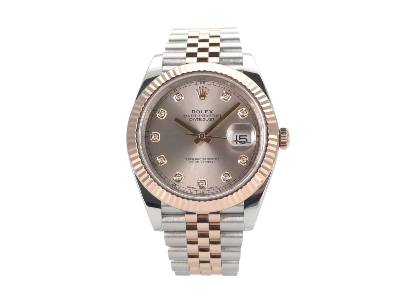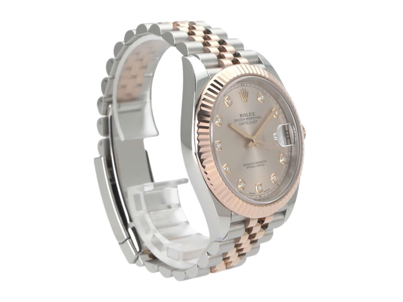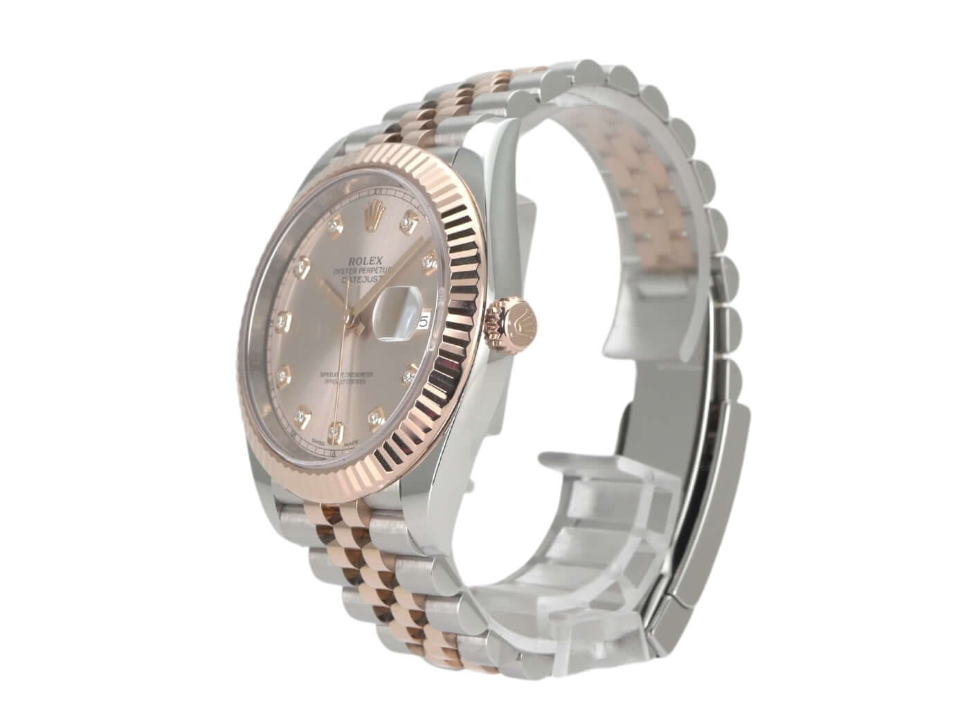 Gehäuse aus Edelstahl / Everose-Gold poliert und satiniert, Gehäusedurchmesser 41 mm, geriffelte 18 kt Everose-Gold Lünette, Jubile Armband aus Edelstahl / 18 kt Everose-Gold poliert und satiniert mit Faltschließe, Sundust Diamantzifferblatt, Automatikwerk, Rolex Manufakturkaliber 3235, 70 Stunden Gangreserve, Datumsanzeige, Chronometer, kratzfestes Saphirglas, verschraubte 18 kt Everose-Gold Krone, Edelstahlboden verschraubt, Wasserdicht bis zu 10 bar.