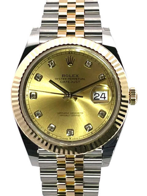 Gehäuse aus Edelstahl / Gelbgold poliert und satiniert, Gehäusedurchmesser 41 mm, geriffelte 18 kt Gelbgold Lünette, Jubile Armband aus Edelstahl / 18 kt Gelbgold poliert und satiniert mit Faltschließe, Champagner Zifferblatt mit 10 aufgesetzten Diamanten, Automatikwerk, Rolex Manufakturkaliber 3235, 70 Stunden Gangreserve, Chronometer, Datum, kratzfestes Saphirglas, verschraubte 18 kt Gelbgold Krone, Edelstahlboden verschraubt, Wasserdicht bis zu 10 bar.