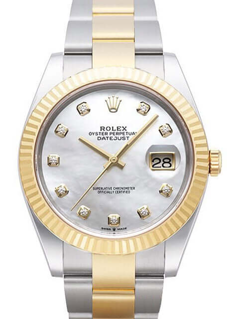 Gehäuse aus Edelstahl / Gelbgold poliert und satiniert, Gehäusedurchmesser 41 mm, geriffelte 18 kt Gelbgold Lünette, Oyster-Armband aus Edelstahl / 18 kt Gelbgold poliert und satiniert mit Faltschließe, Perlmutt Zifferblatt mit 10 aufgesetzten Diamanten, Automatikwerk, Rolex Manufakturkaliber 3235, 70 Stunden Gangreserve, Chronometer, Datum, kratzfestes Saphirglas, verschraubte 18 kt Gelbgold Krone, Edelstahlboden verschraubt, Wasserdicht bis zu 10 bar.