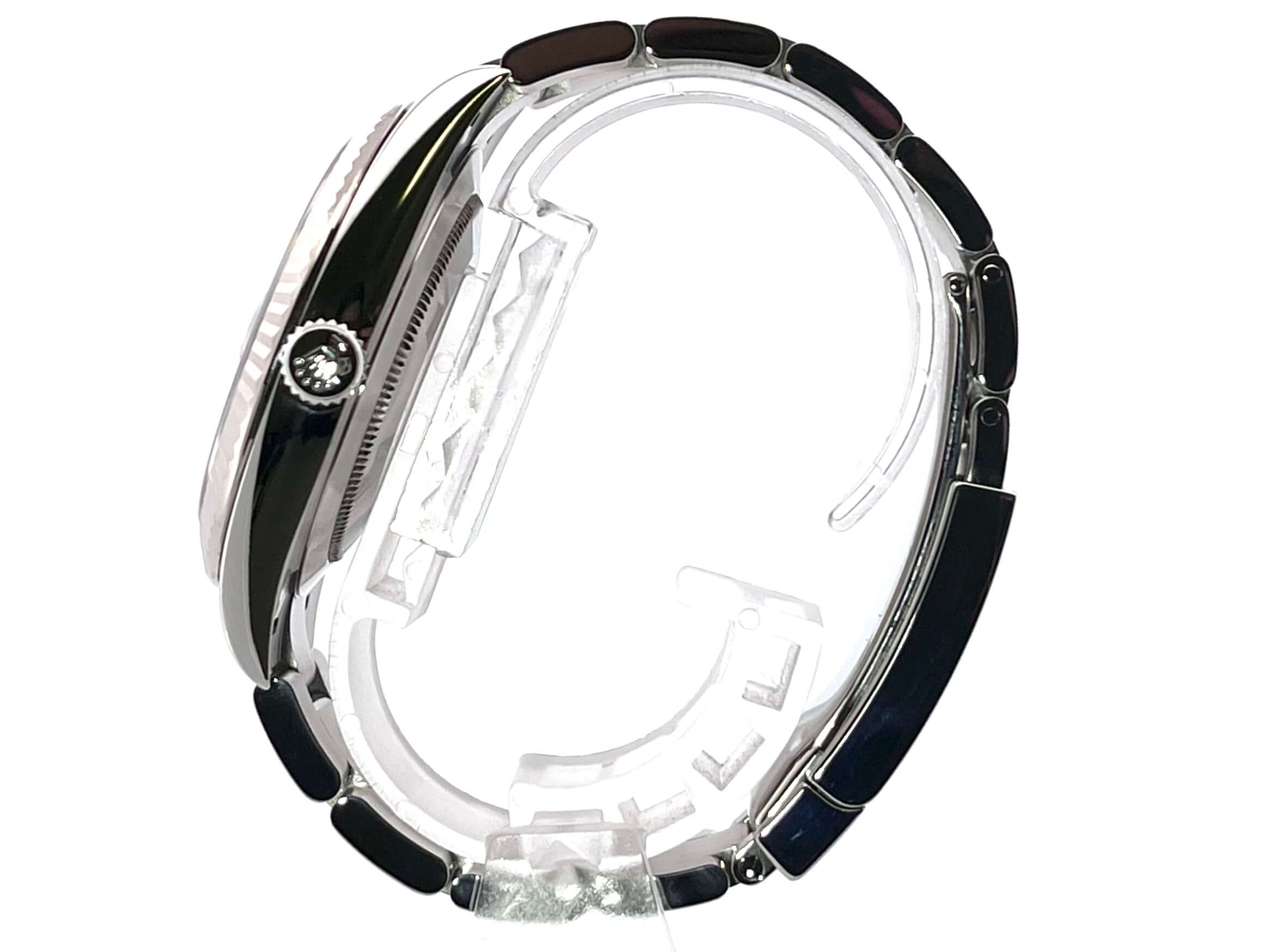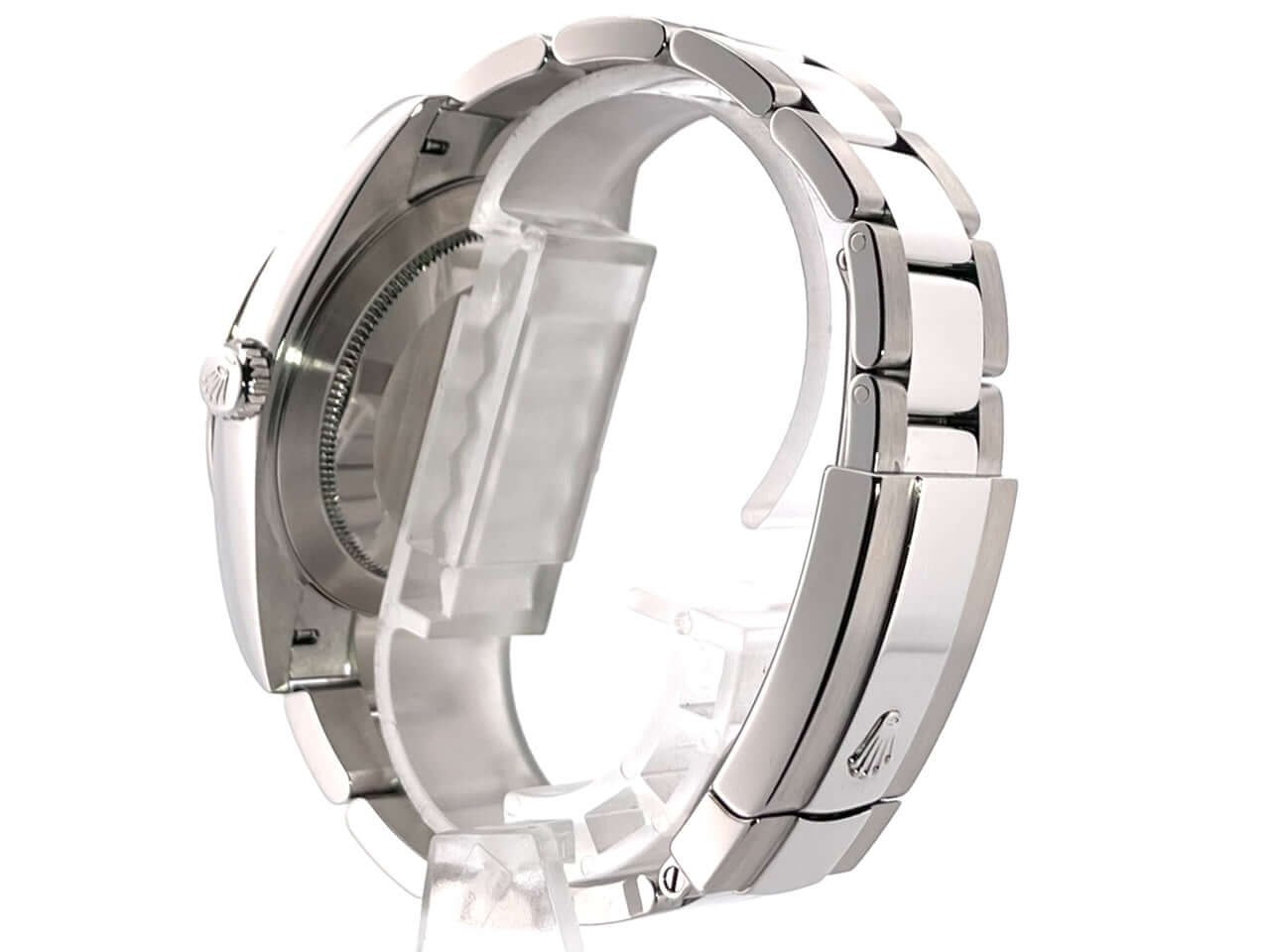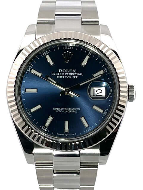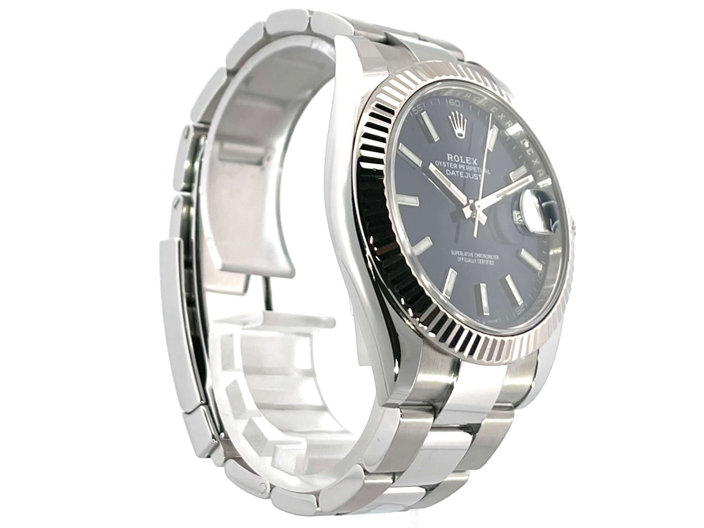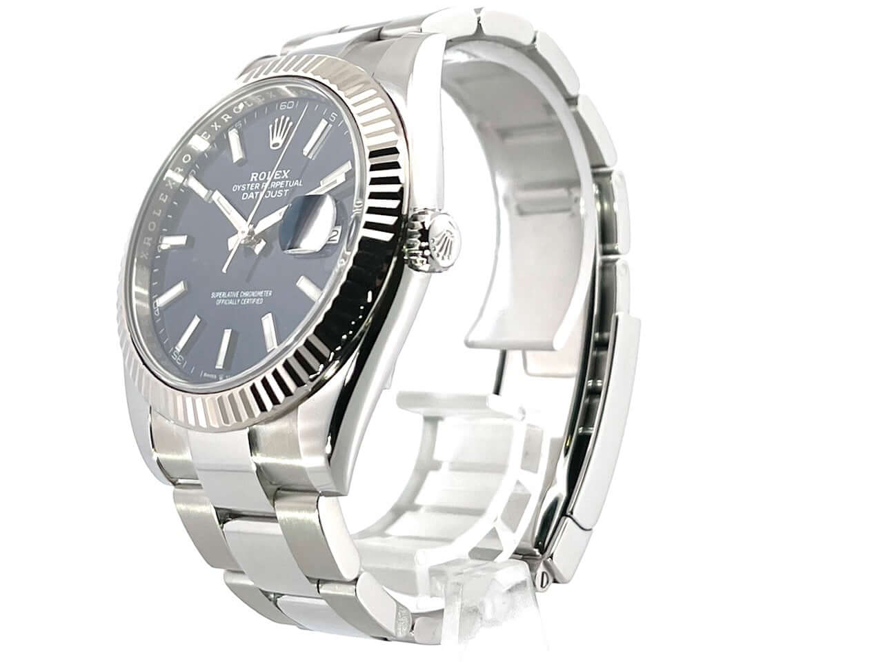 Gehäuse aus Edelstahl poliert und satiniert, Gehäusedurchmesser 41 mm, geriffelte 18 kt Weißgold Lünette, Oyster Edelstahlband poliert und satiniert mit Faltschließe, blaues Zifferblatt mit 18 kt Weißgold Leuchtindizes, Automatikwerk, Rolex Manufakturkaliber 3235, 70 Stunden Gangreserve, Datumsanzeige, Chronometer, kratzfestes Saphirglas, verschraubte Krone, Edelstahlboden verschraubt, Wasserdicht bis zu 10 bar.
