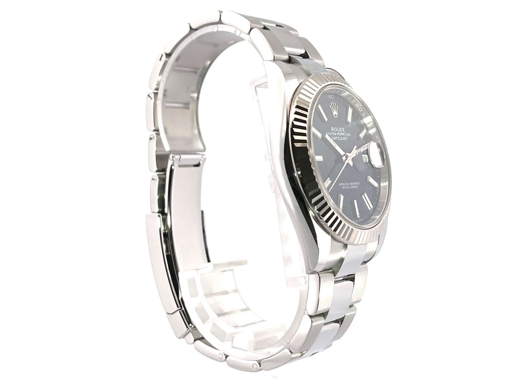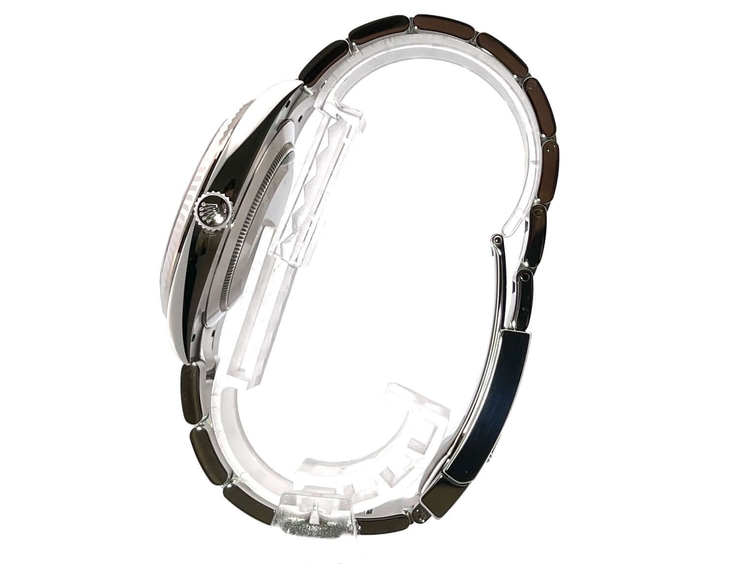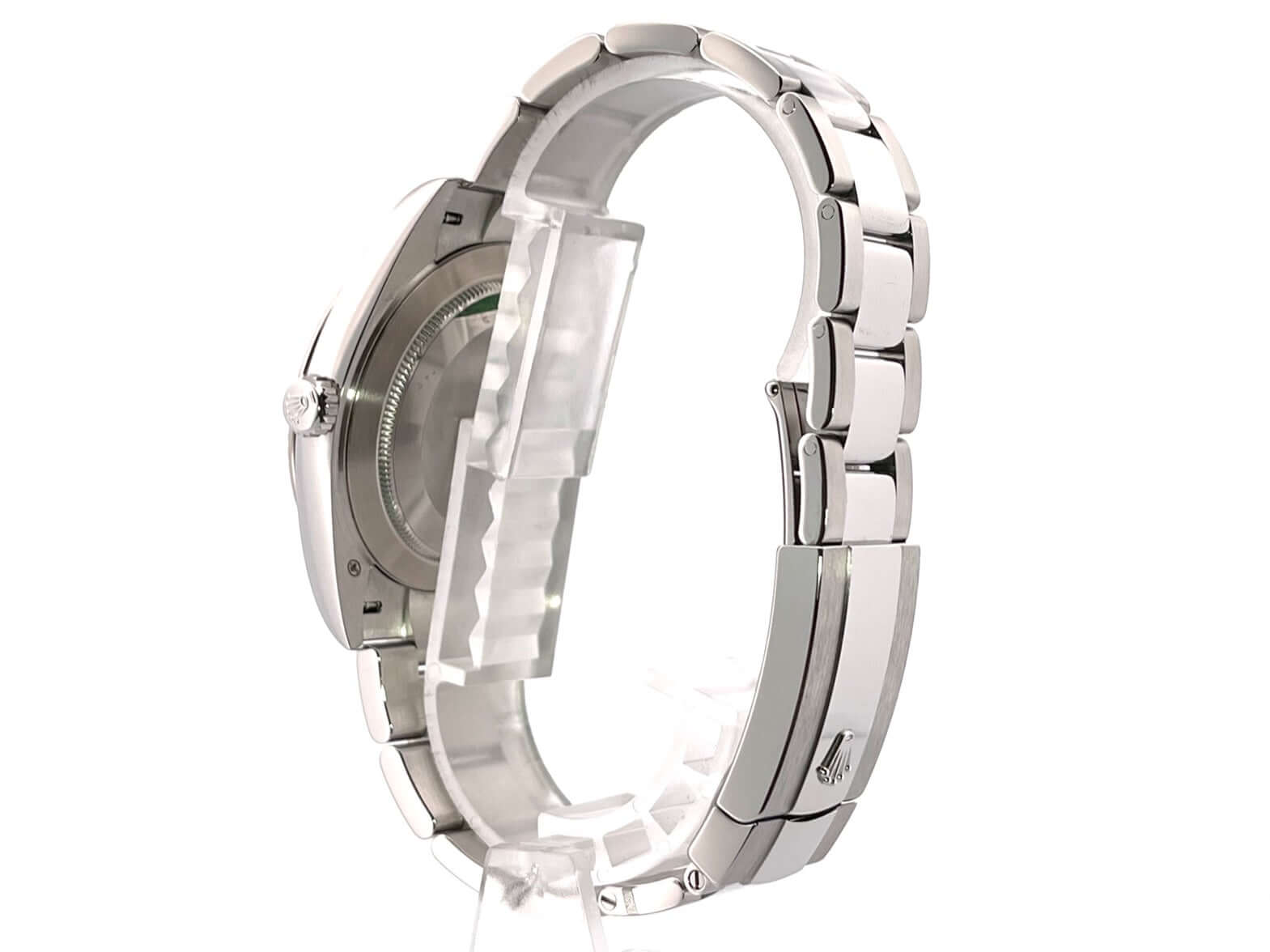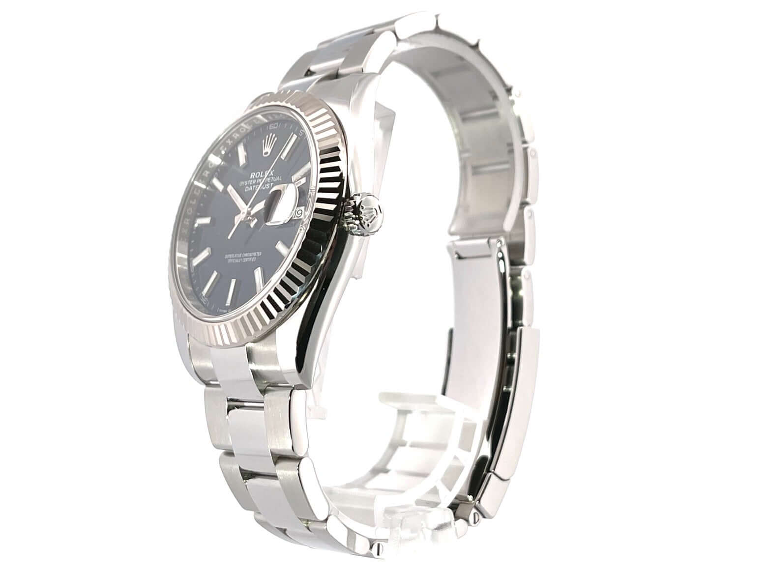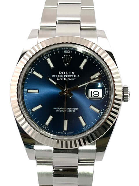 Gehäuse aus Edelstahl poliert und satiniert, Gehäusedurchmesser 41 mm, geriffelte 18 kt Weißgold Lünette, Oyster Edelstahlband poliert und satiniert mit Faltschließe, blaues Zifferblatt mit 18 kt Weißgold Leuchtindizes, Automatikwerk, Rolex Manufakturkaliber 3235, 70 Stunden Gangreserve, Datumsanzeige, Chronometer, kratzfestes Saphirglas, verschraubte Krone, Edelstahlboden verschraubt, Wasserdicht bis zu 10 bar.