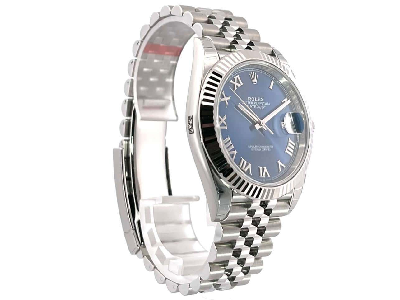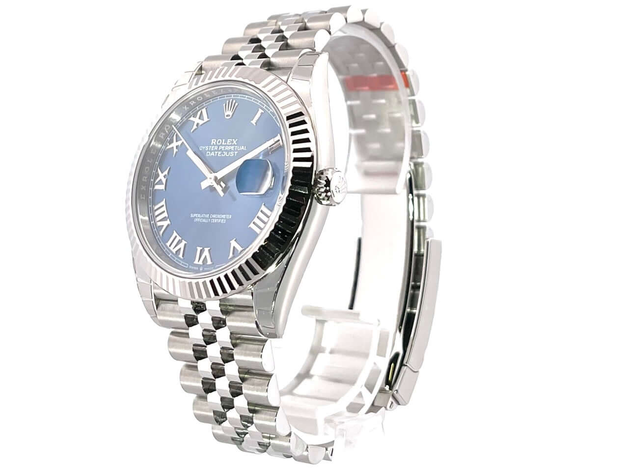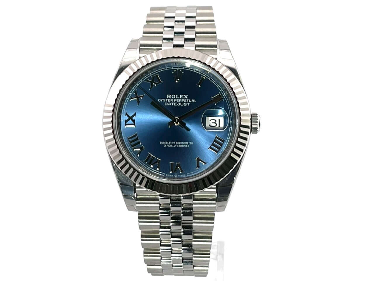 Gehäuse aus Edelstahl poliert und satiniert, Gehäusedurchmesser 41 mm, geriffelte 18 kt Weißgold Lünette, Jubile Armband aus Edelstahl poliert und satiniert mit Faltschließe, blaues Zifferblatt mit römischen Ziffern, Automatikwerk, Rolex Manufakturkaliber 3235, 70 Stunden Gangreserve, Datumsanzeige, Chronometer, kratzfestes Saphirglas, verschraubte Krone, Edelstahlboden verschraubt, Wasserdicht bis zu 10 bar.