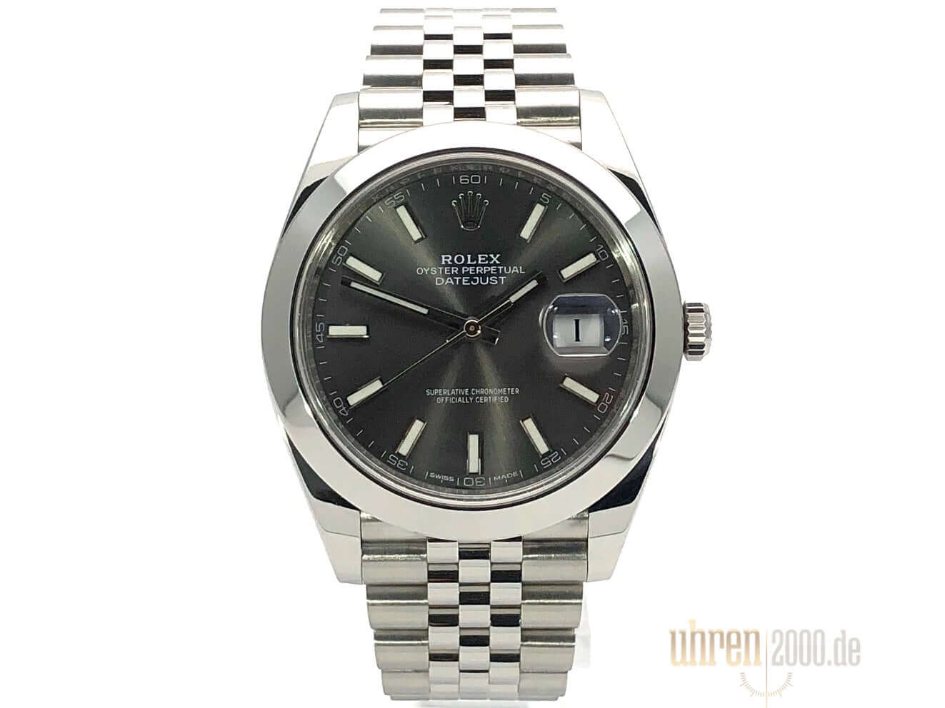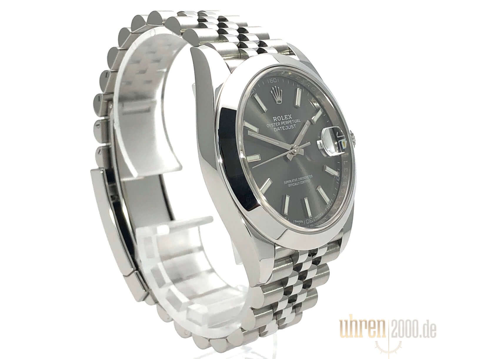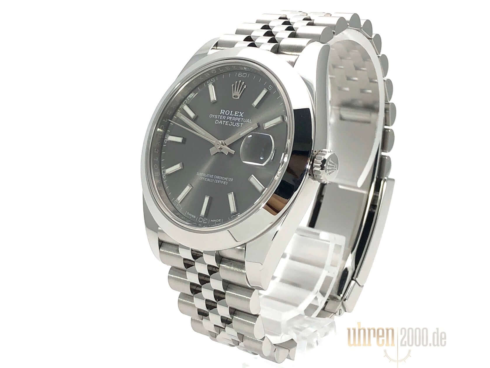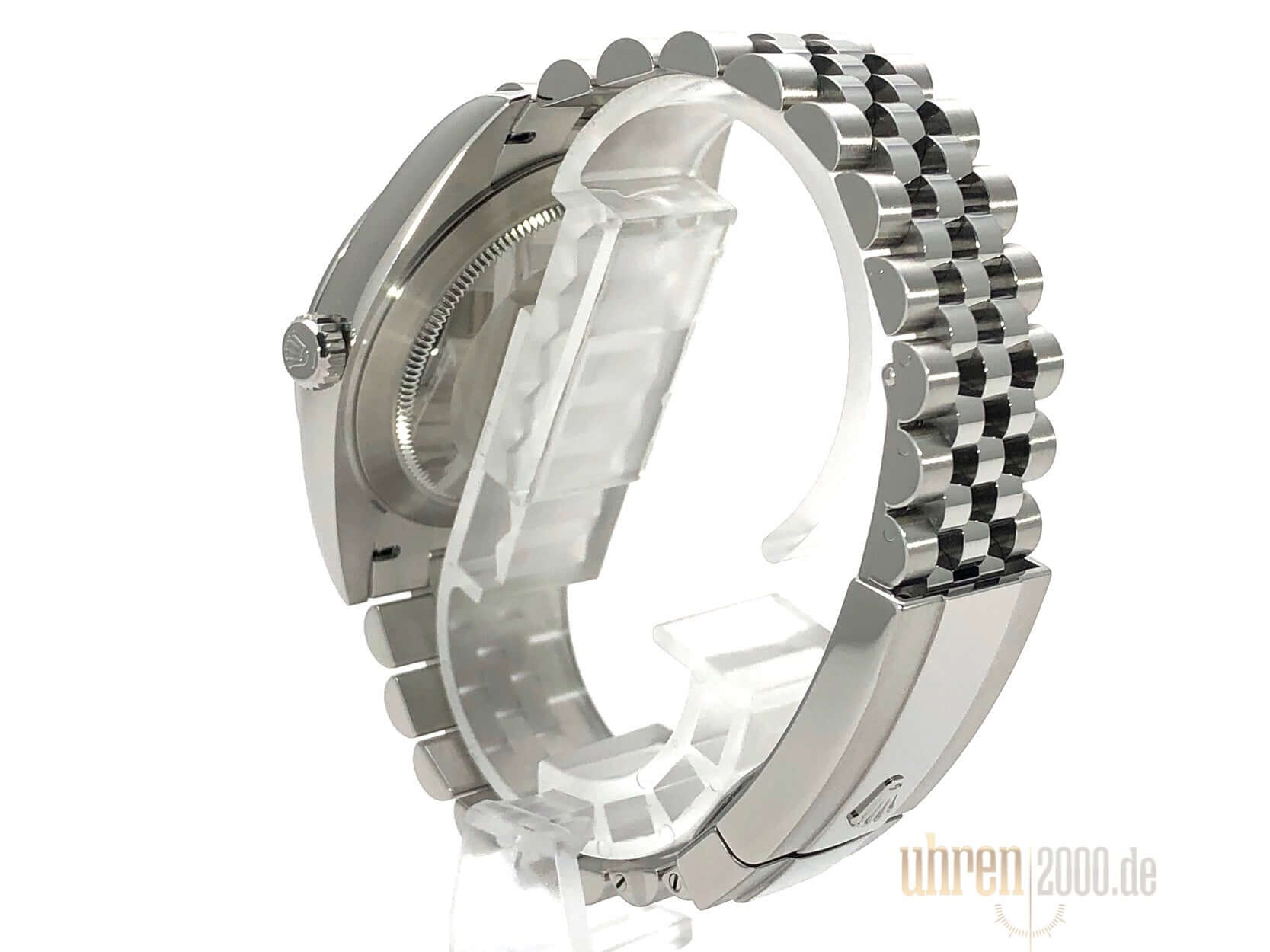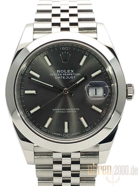 Gehäuse aus Edelstahl poliert und satiniert, Gehäusedurchmesser 41 mm, polierte Edelstahl Lünette, Jubile Armband aus Edelstahl poliert und satiniert mit Faltschließe, Zifferblatt Rhodiumfarben mit 18 kt Weißgold Leuchtindizes, Leuchtzeiger, Automatikwerk, Rolex Manufakturkaliber 3235, Chronometer, 70 Stunden Gangreserve, Datumsanzeige, kratzfestes Saphirglas, verschraubte Krone, Edelstahlboden verschraubt, Wasserdicht bis zu 10 bar.