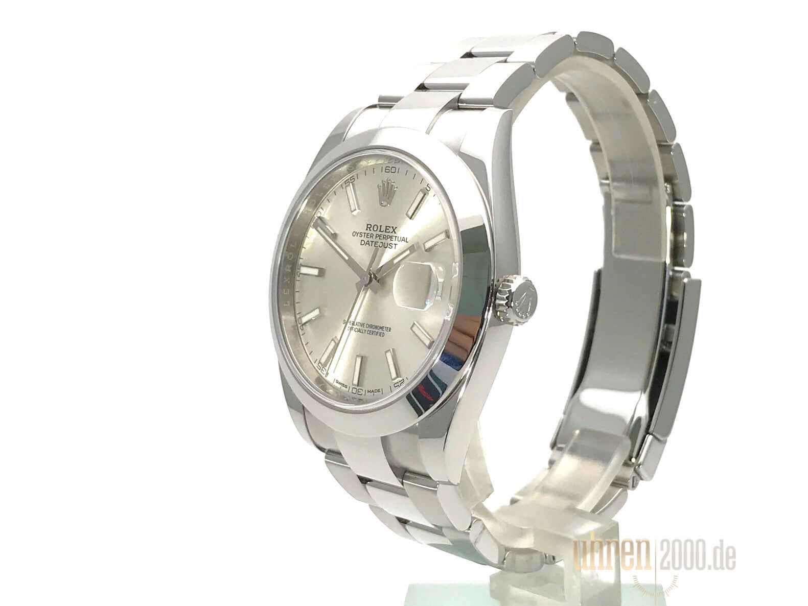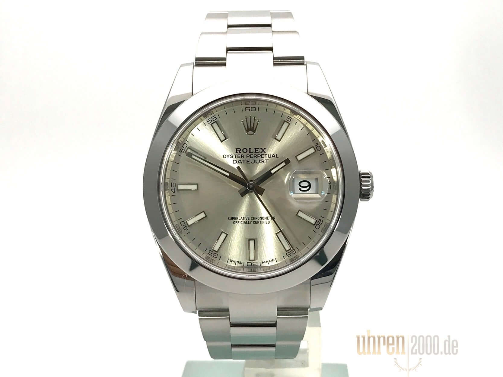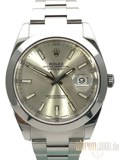 Gehäuse aus Edelstahl poliert und satiniert, Gehäusedurchmesser 41 mm, polierte Edelstahl Lünette, Oyster Edelstahlband poliert und satiniert mit Faltschließe, silberfarbenes Zifferblatt mit 18 kt Weißgold LeuchtIndizes, Leuchtzeiger, Automatikwerk, Rolex Manufakturkaliber 3235, 70 Stunden Gangreserve, Datumsanzeige, Chronometer, kratzfestes Saphirglas, verschraubte Krone, Edelstahlboden verschraubt, Wasserdicht bis zu 10 bar.